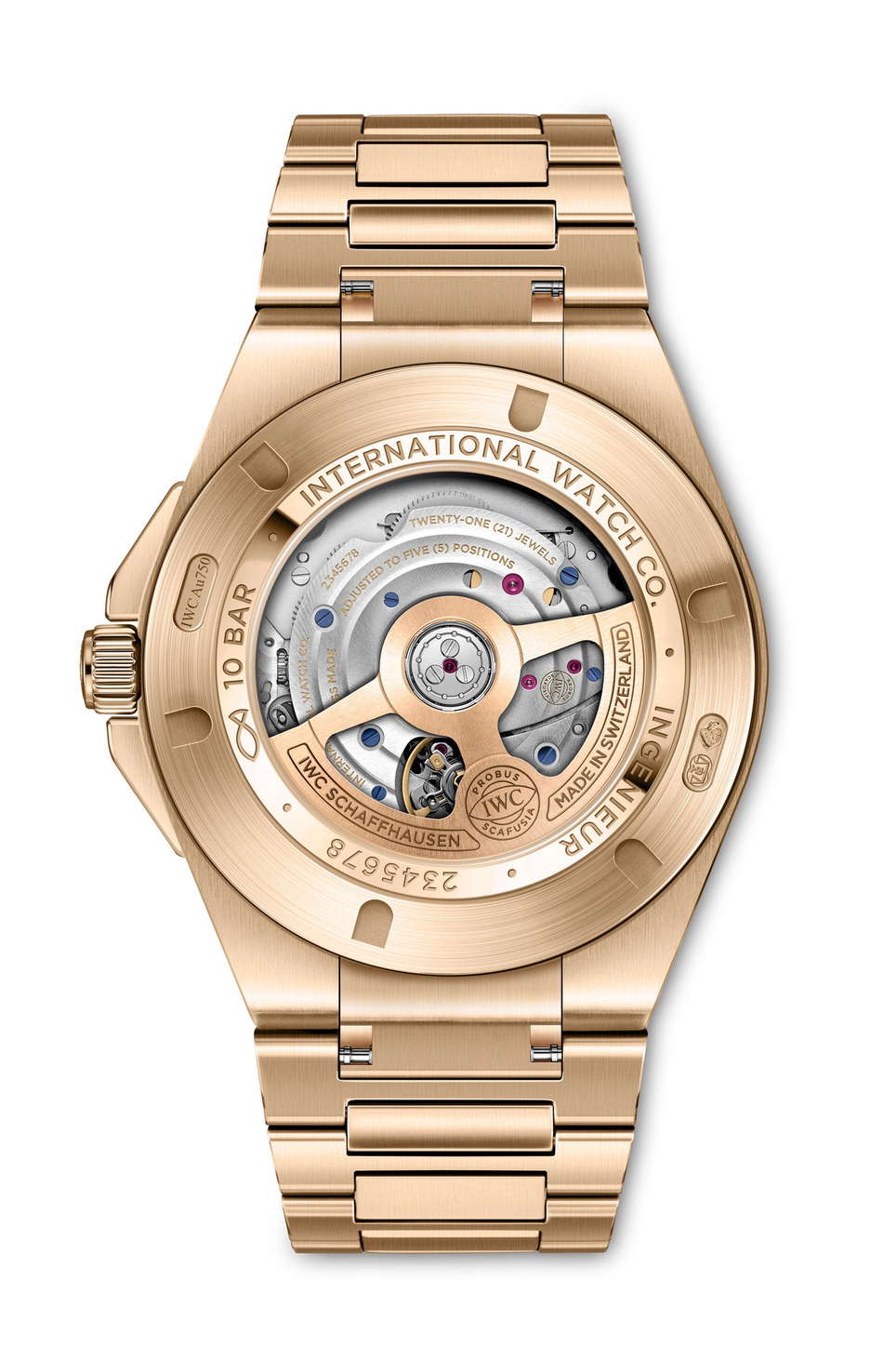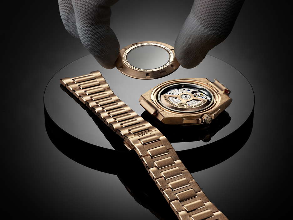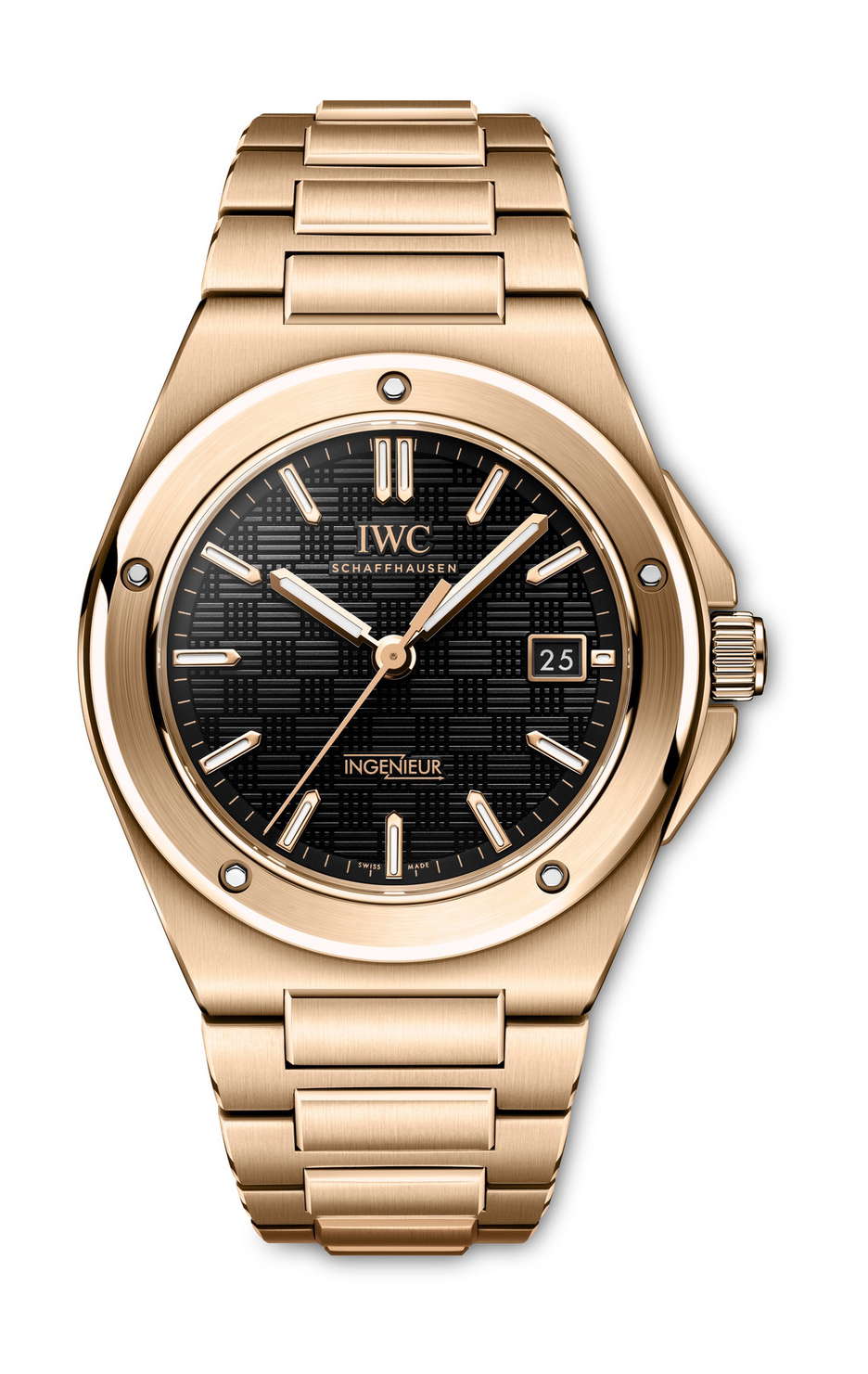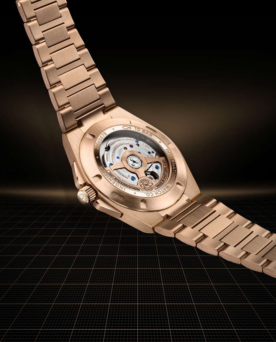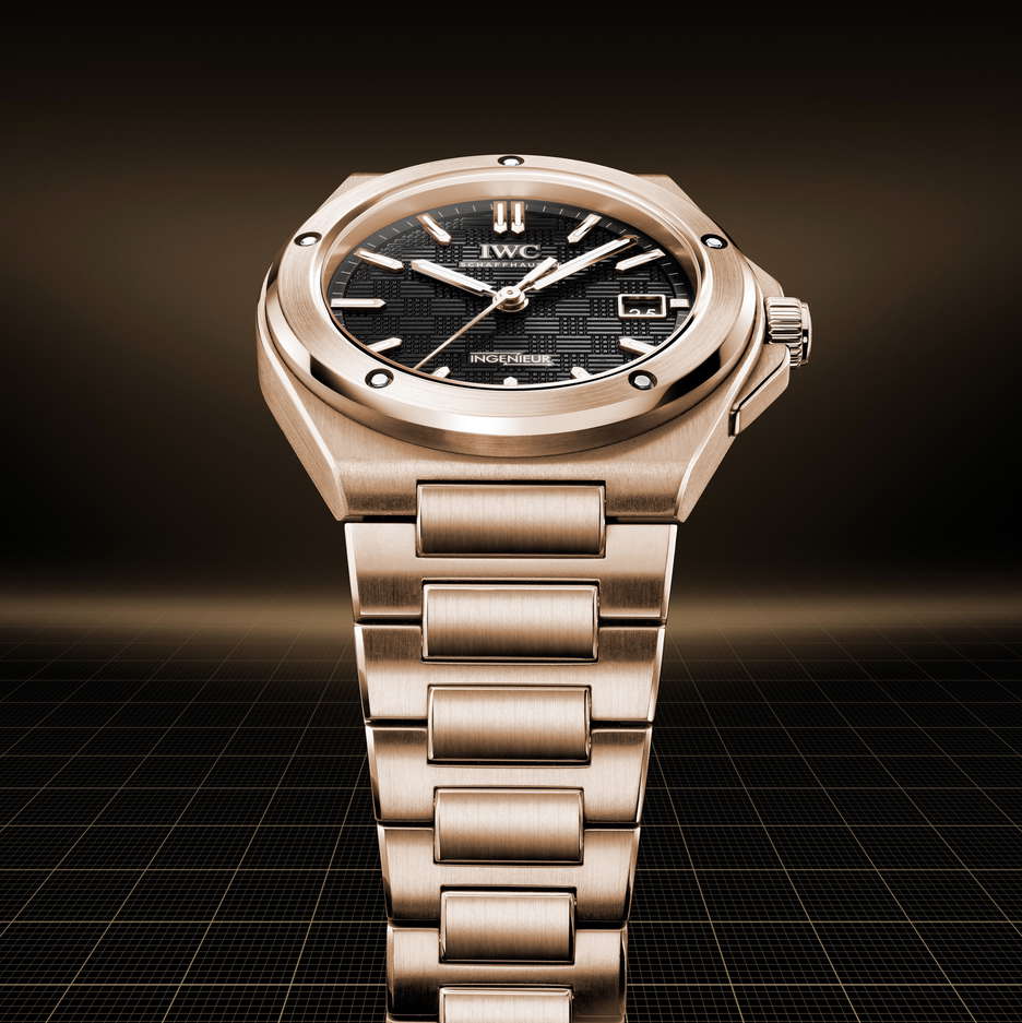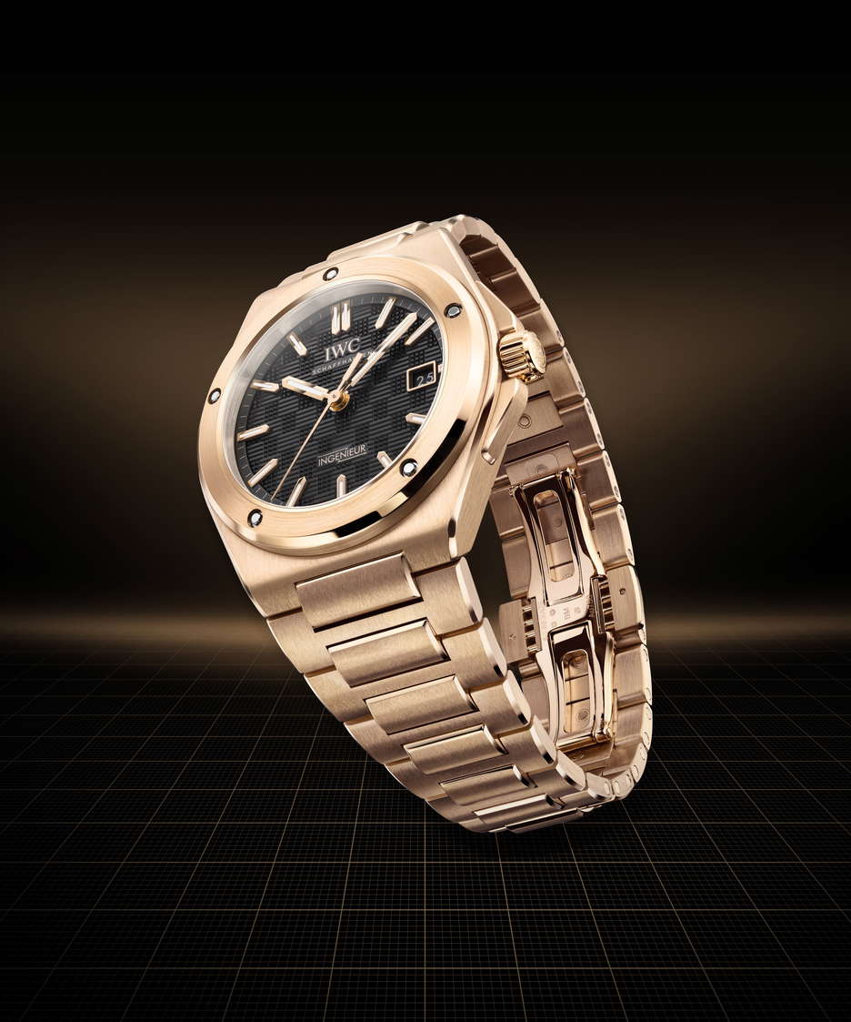 IWC Schaffhausen expands its Ingenieur Automatic 40 line with a full 18-carat 5N gold edition, introduced at Watches and Wonders Geneva 2025. Drawing from the DNA of Gérald Genta’s 1970s Ingenieur SL, the latest reference IW328702 merges legacy design codes with modern updates. The 40mm case, bezel, crown, case back ring, and integrated bracelet are crafted entirely from 5N gold, offering a uniform design that highlights the blend of polished and satin-finished surfaces throughout. The black “Grid” dial, defined by its geometric texture of lines and squares, adds visual depth and tactile intrigue. Applied gold hour markers and gold-plated hands are set by hand and treated with Super-LumiNova®, enhancing legibility in low light. The bracelet’s integration via middle links ensures an great fit, while functional screws secure the bezel, staying true to the original Ingenieur’s industrial spirit. Beneath the sapphire-glass case back, the in-house calibre 32111 delivers a 120-hour power reserve, driven by a double pawl winding system. Finishing details include Geneva stripes, blued screws, and a gold-plated oscillating weight.