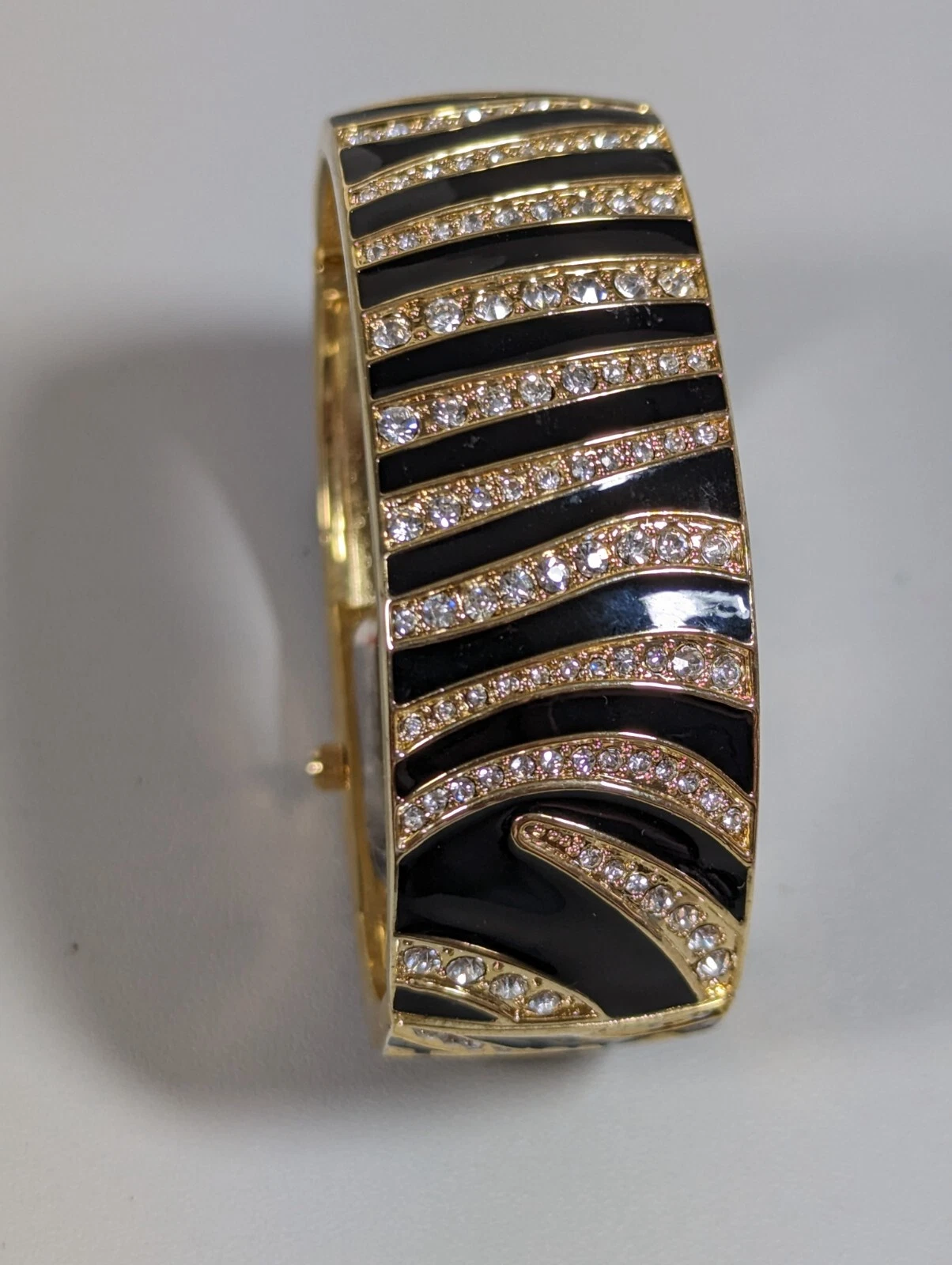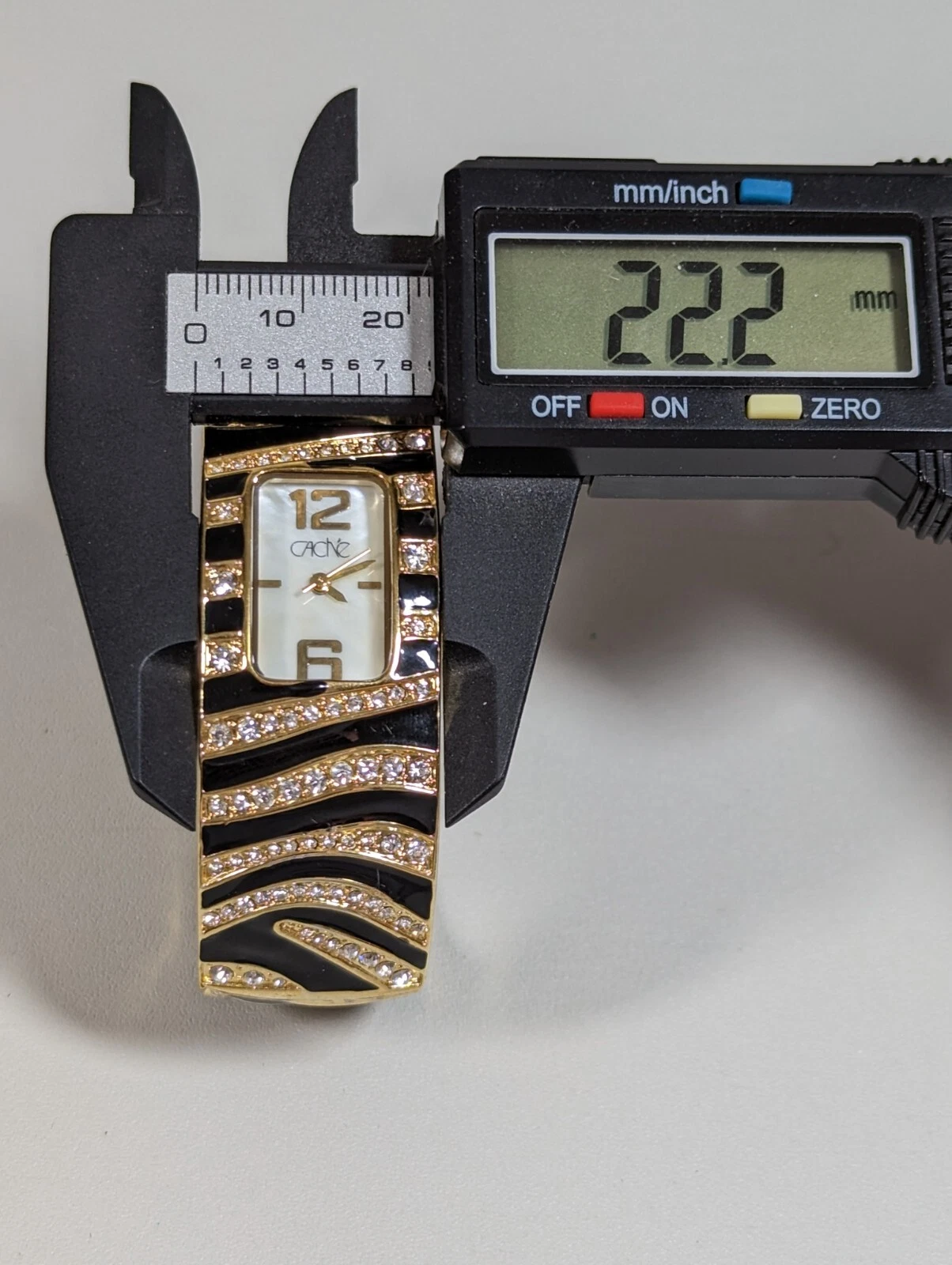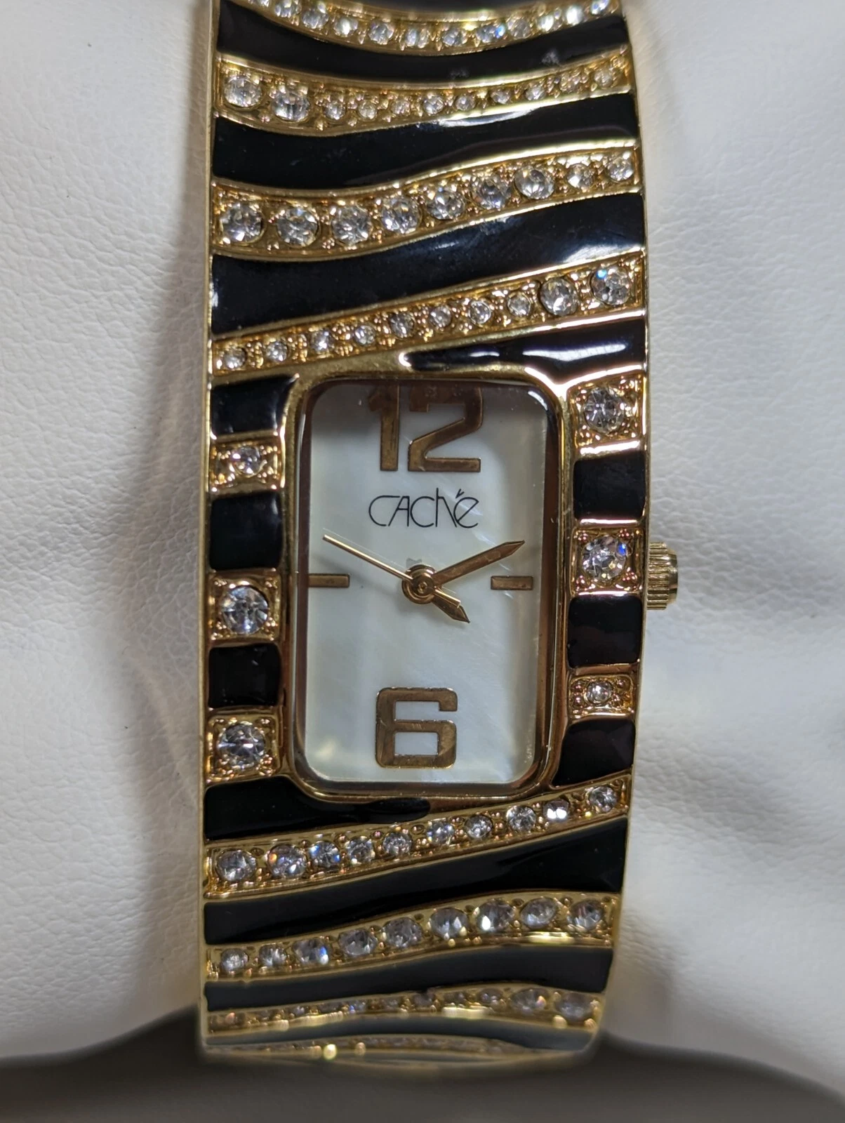 Cache Pearlized Dial Crystal Accent Black Enamel Inlay Hinge Bracelet Band Watch