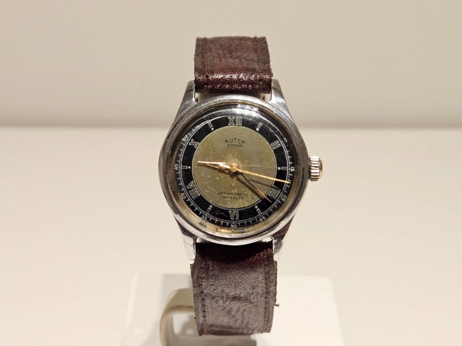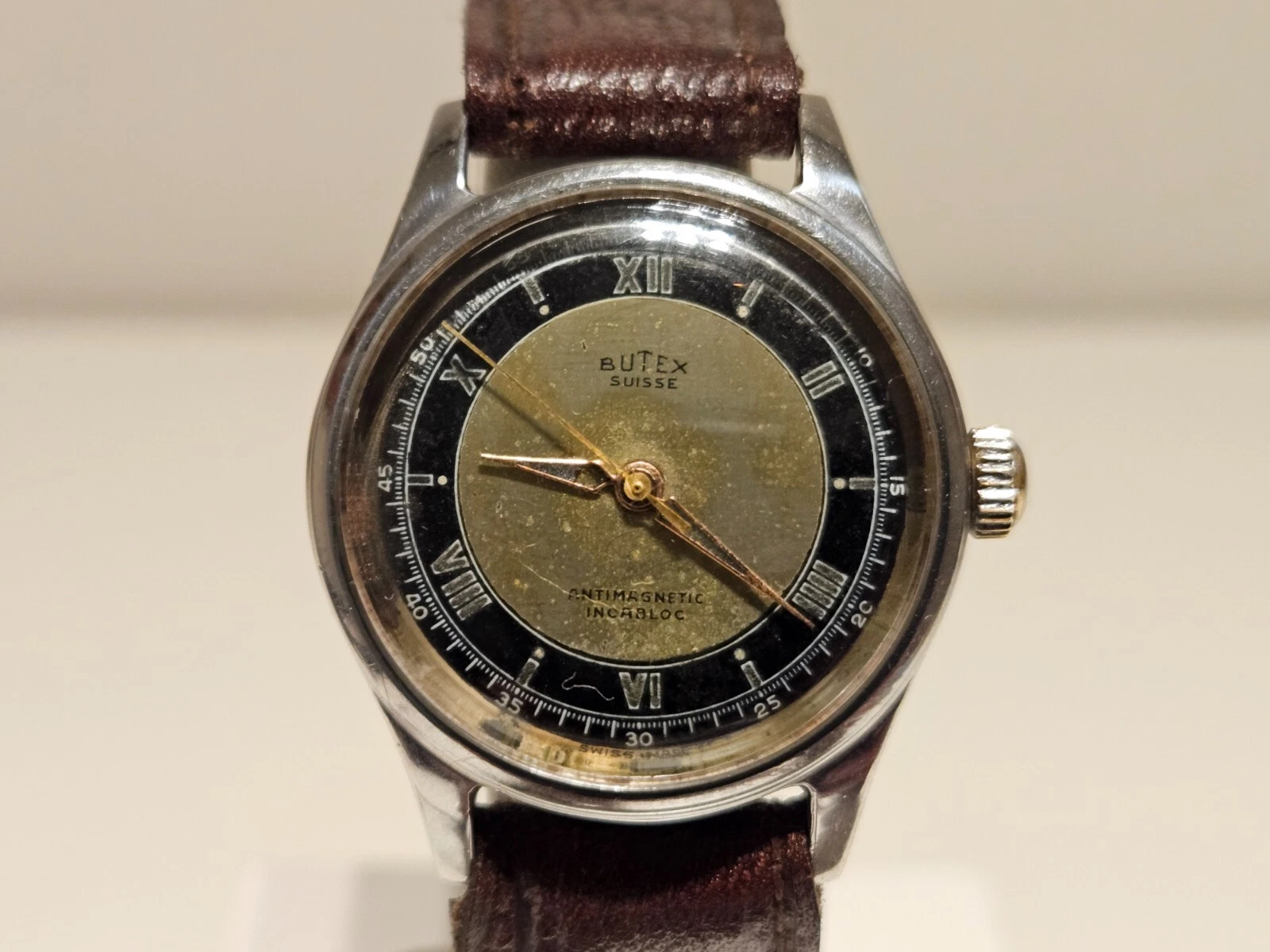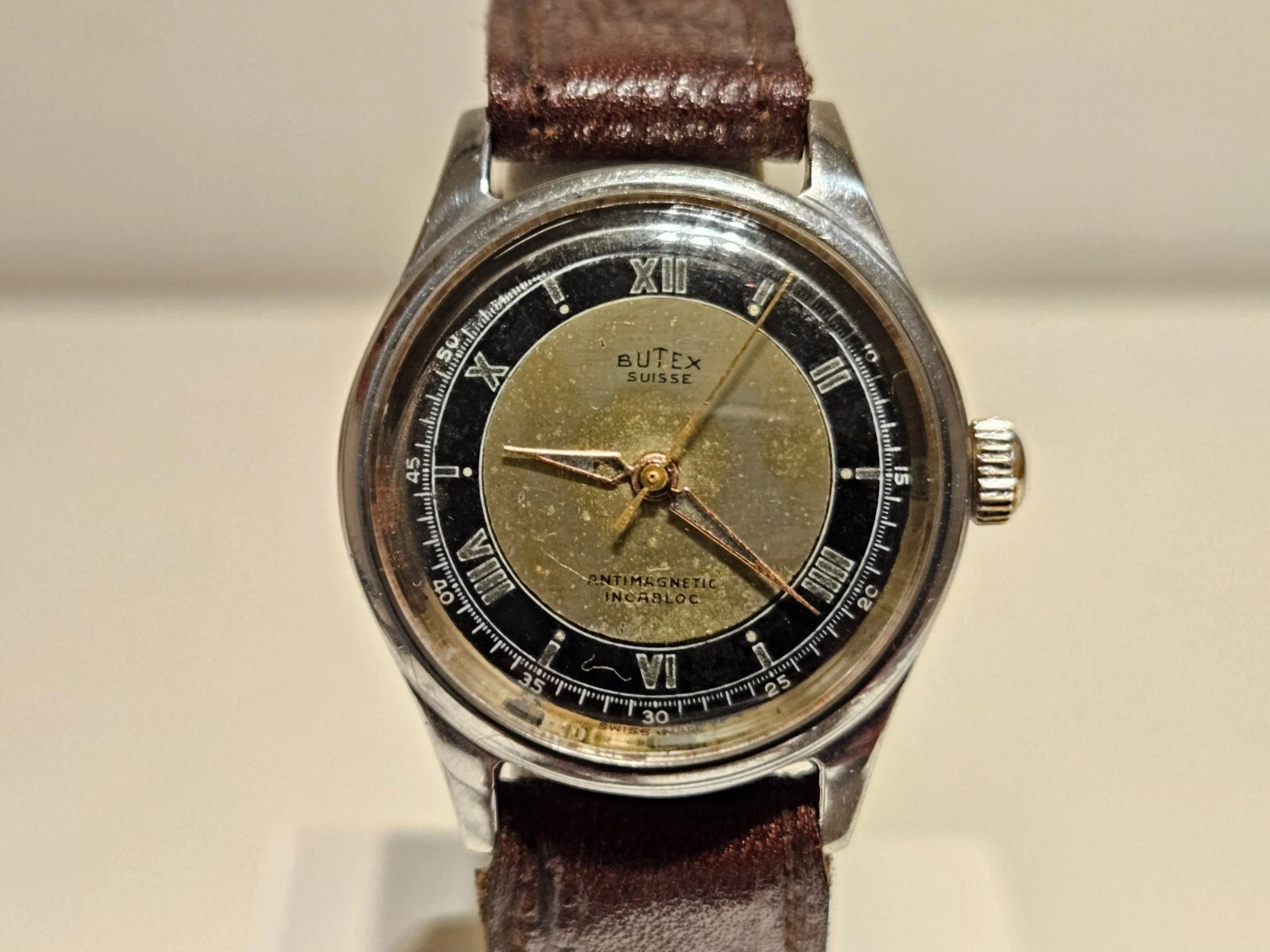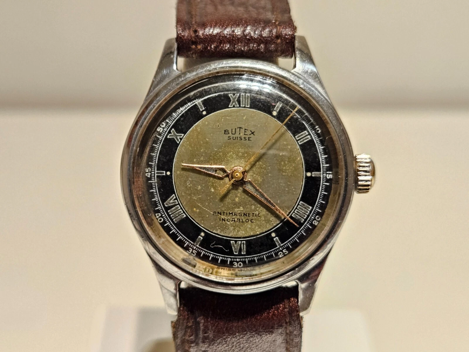 VINTAGE RARE WW2 MILITARY STYLE TWO TONE DIAL SWISS MEN'S 31mm WATCH "BUTEX"