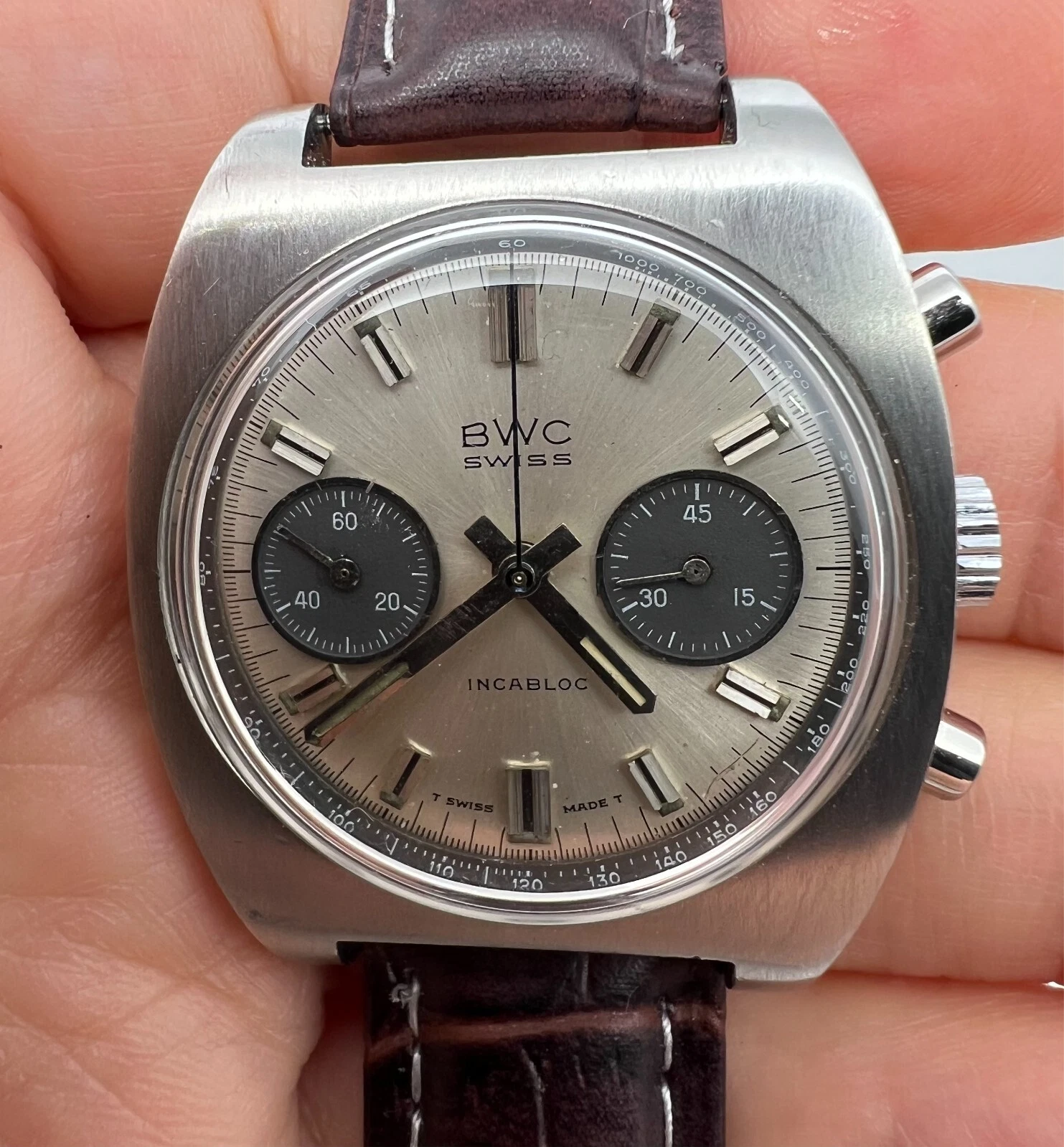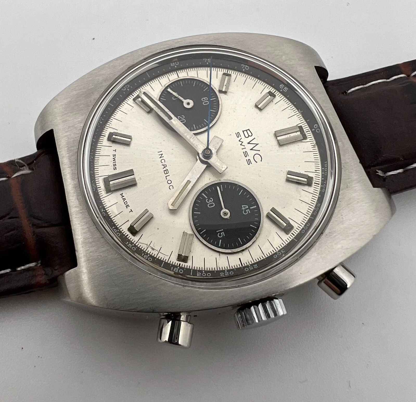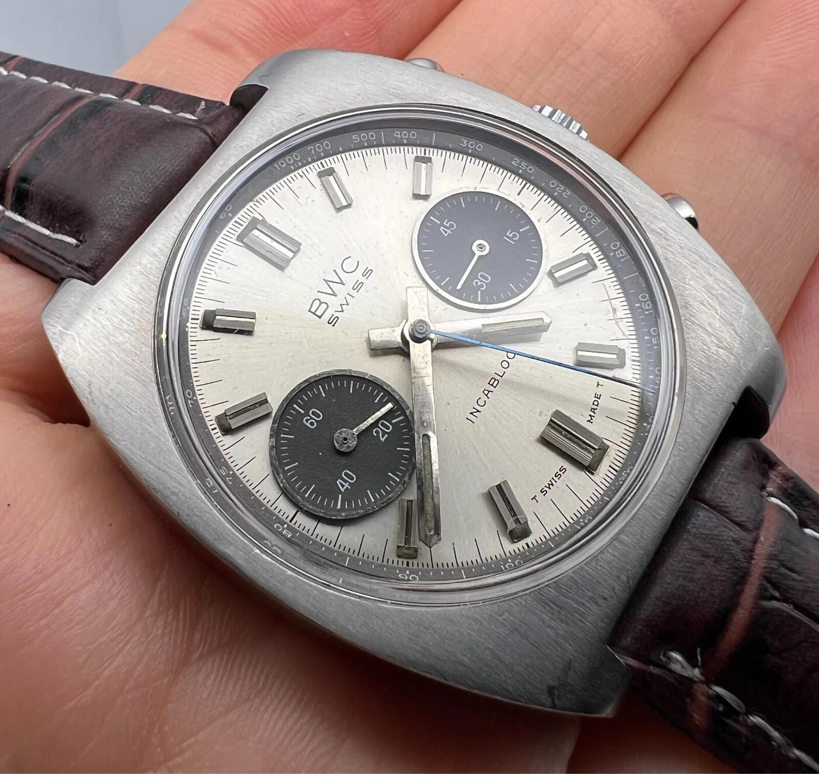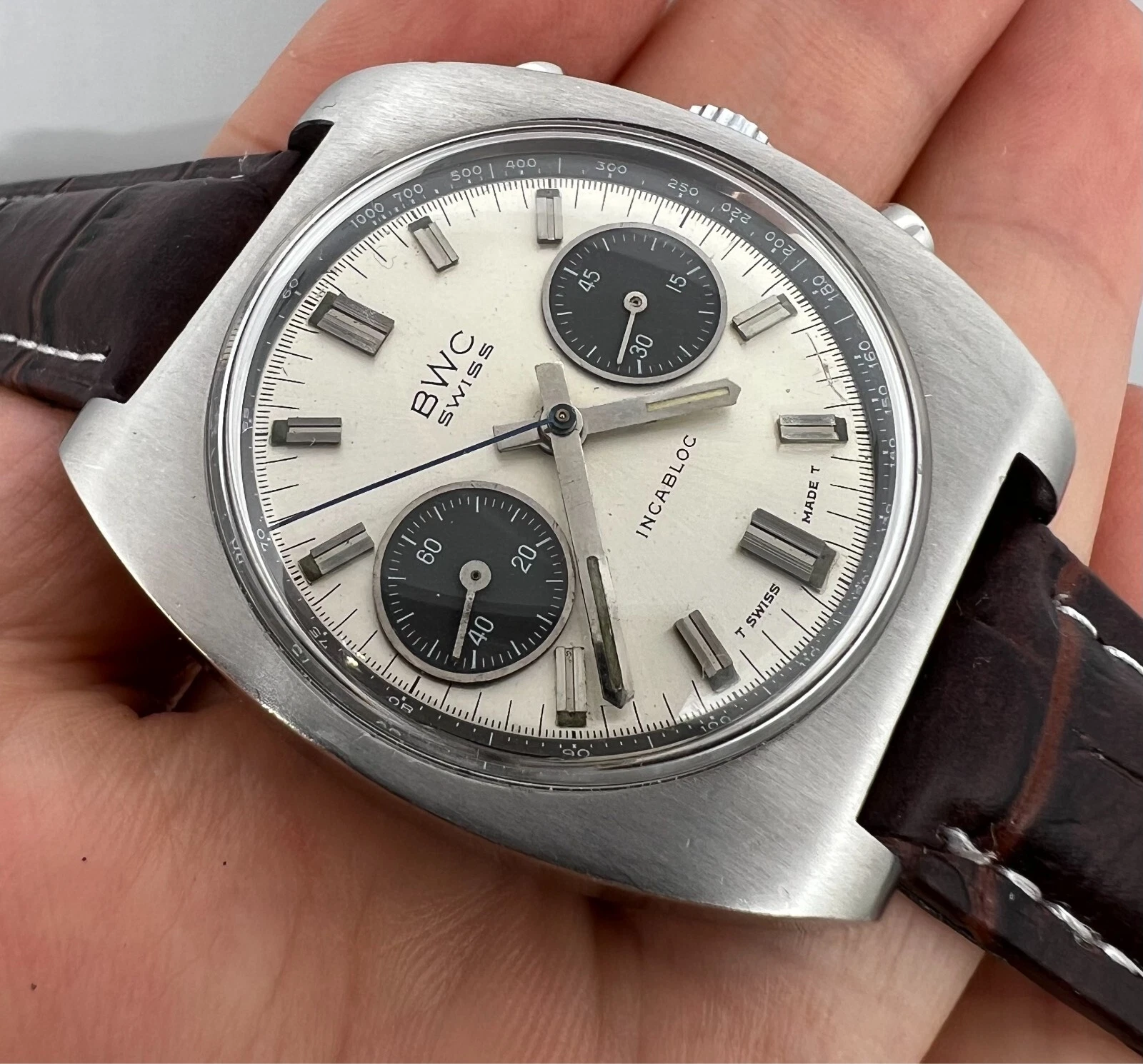 VINTAGE BWC CHRONOGRAPH VALJOUX 7734 PANDA DIAL MENS SWIISS WATCH