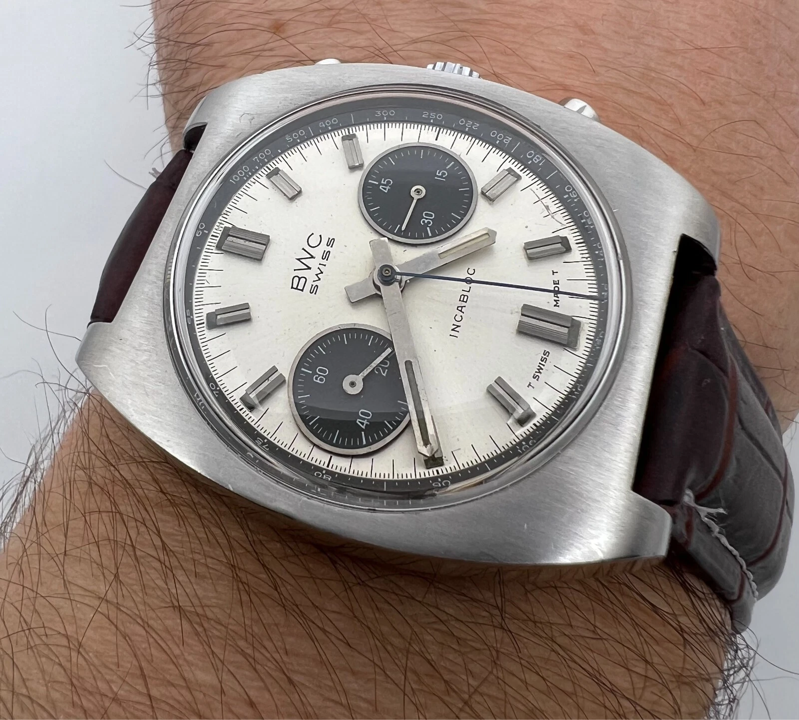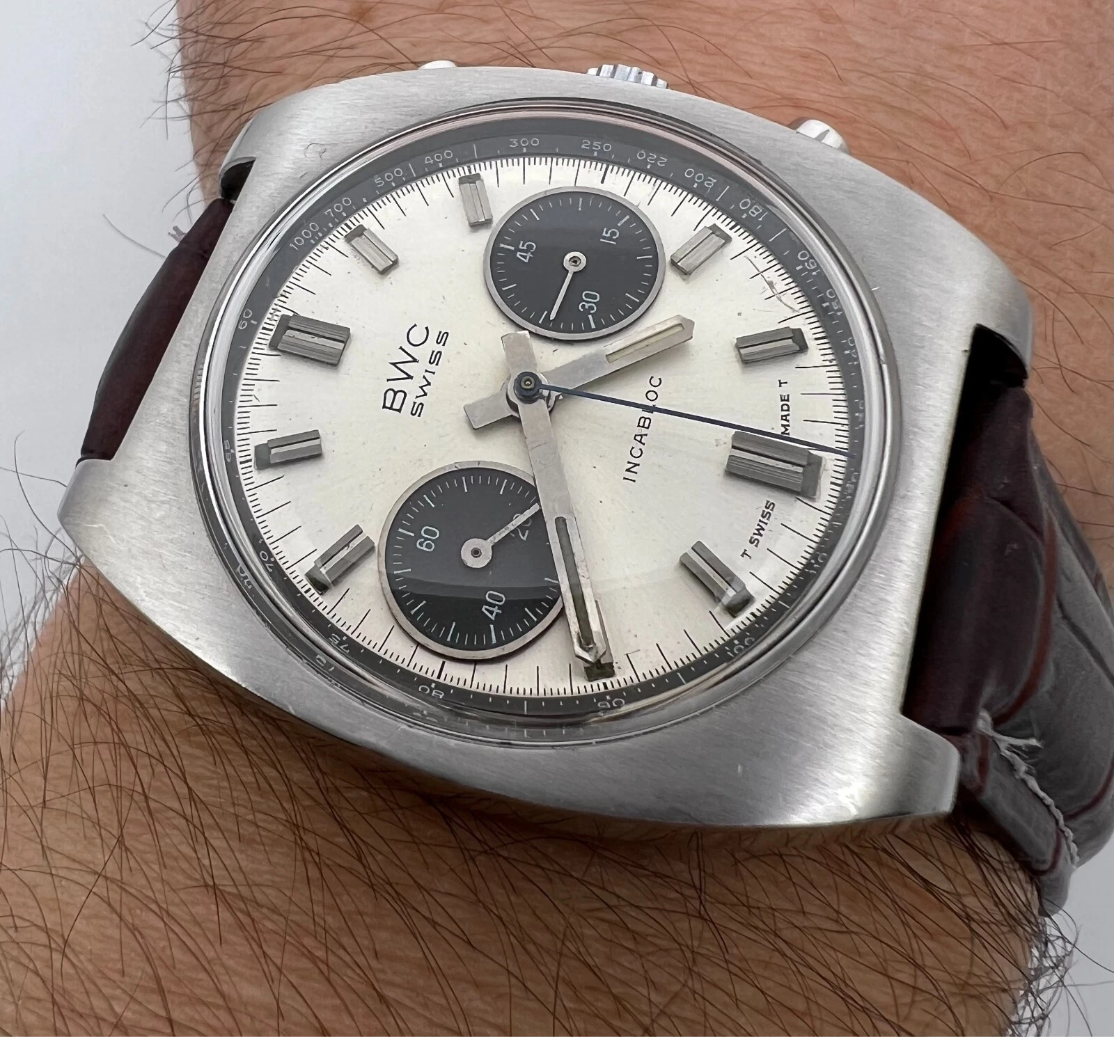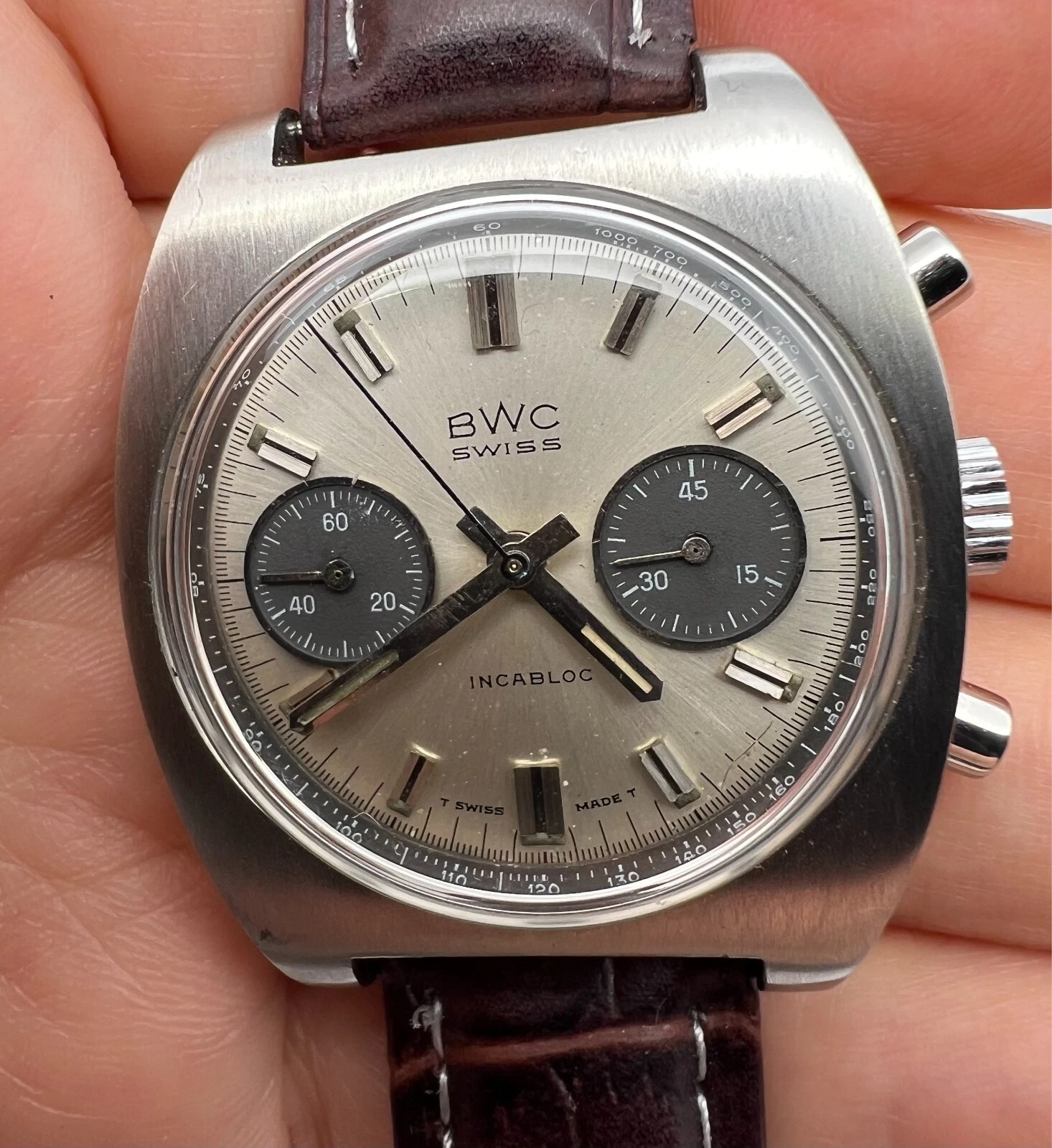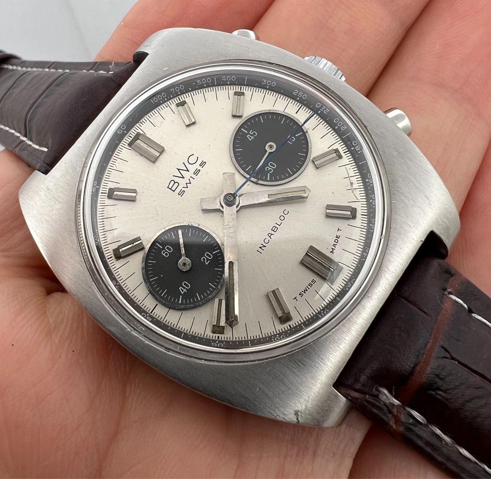 VINTAGE BWC CHRONOGRAPH VALJOUX 7734 PANDA DIAL MENS SWIISS WATCH