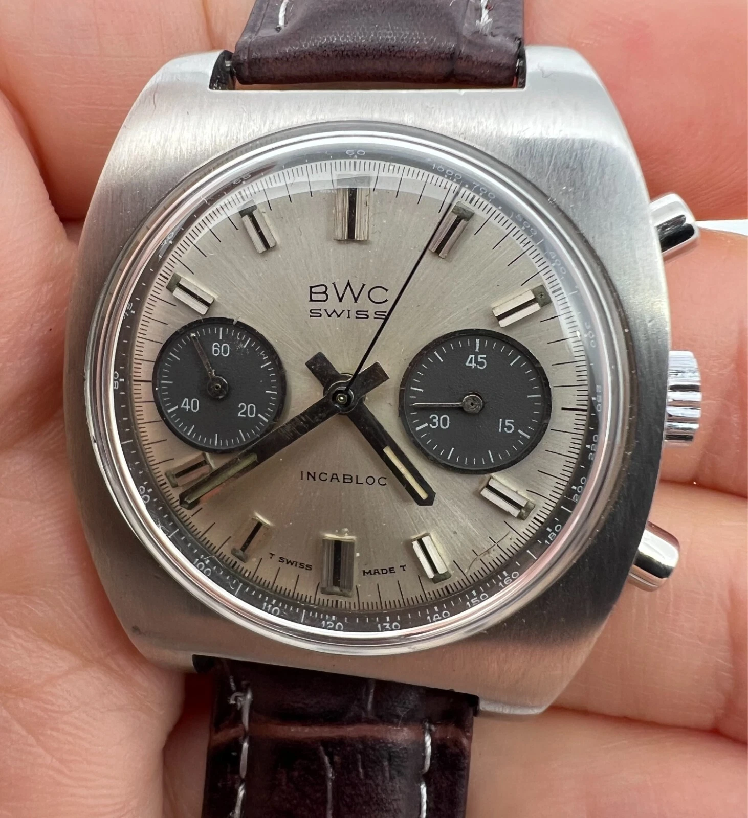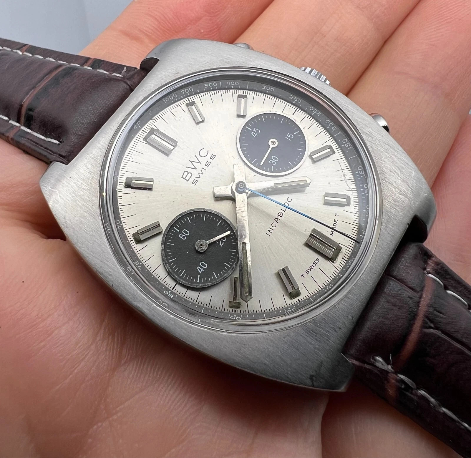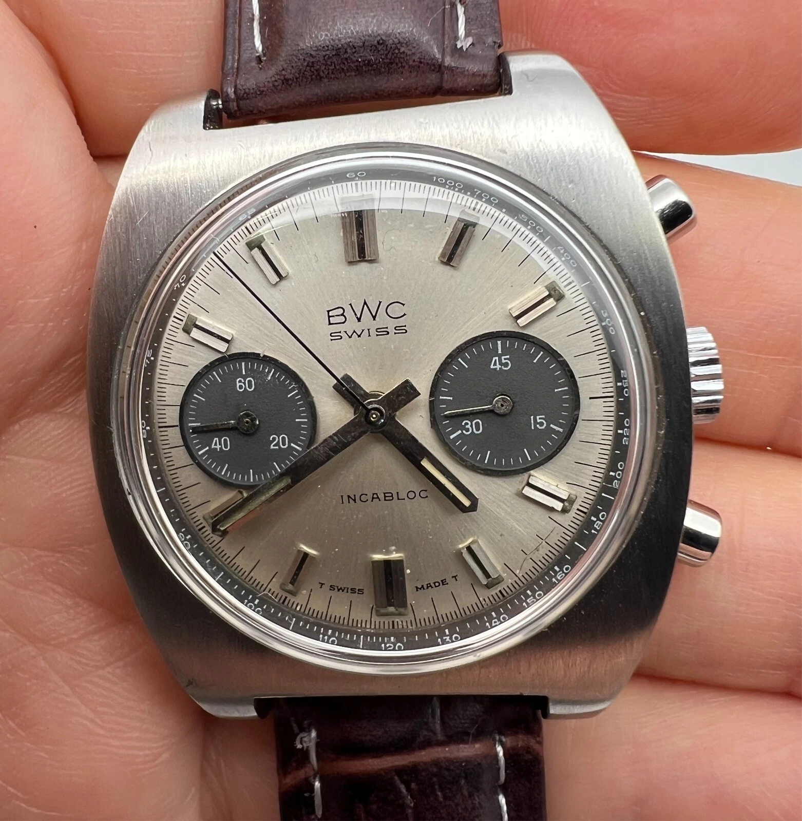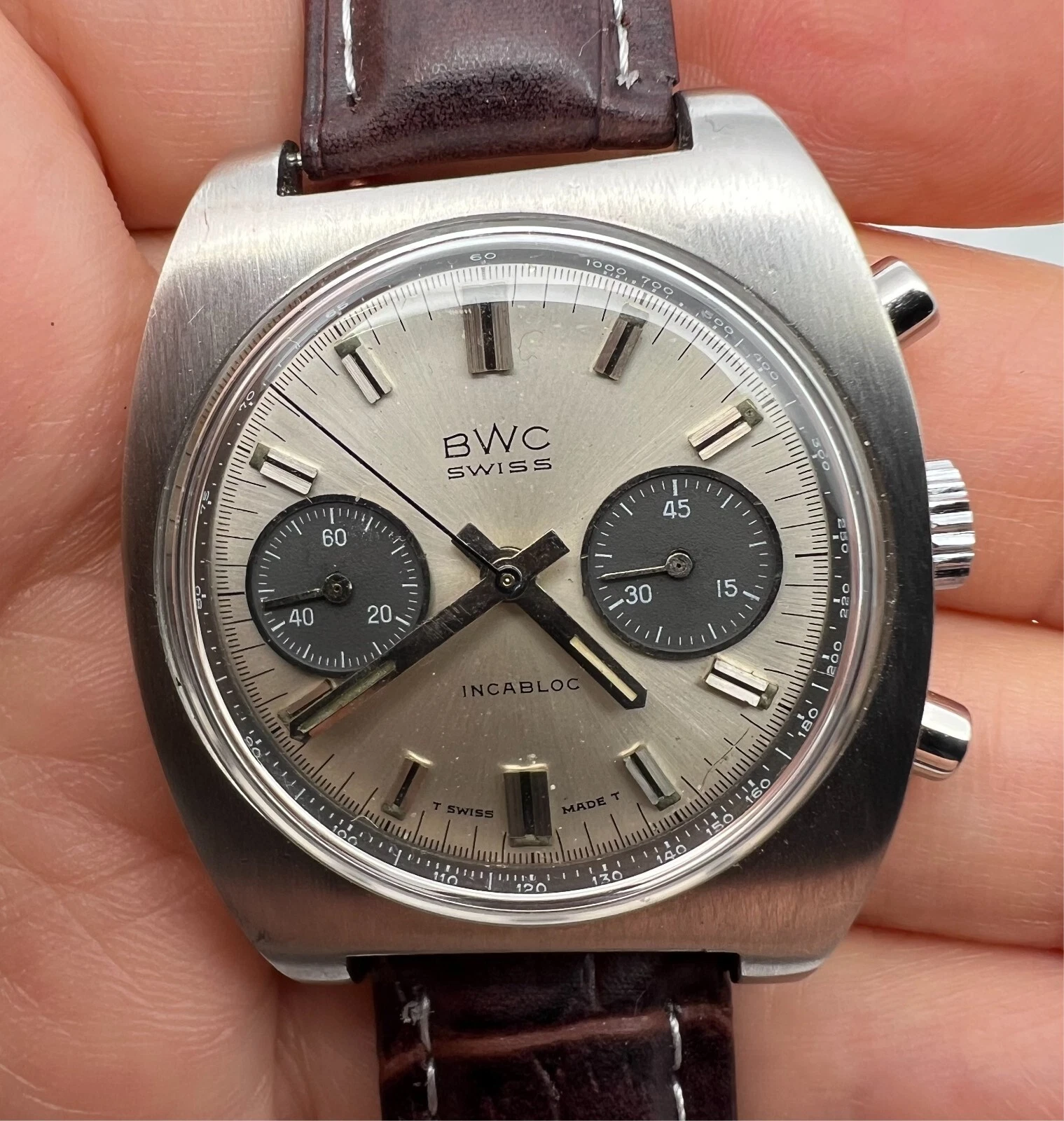 VINTAGE BWC CHRONOGRAPH VALJOUX 7734 PANDA DIAL MENS SWIISS WATCH