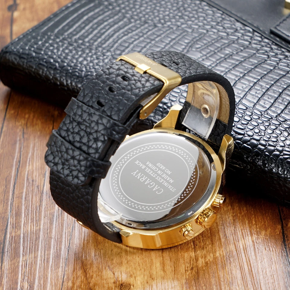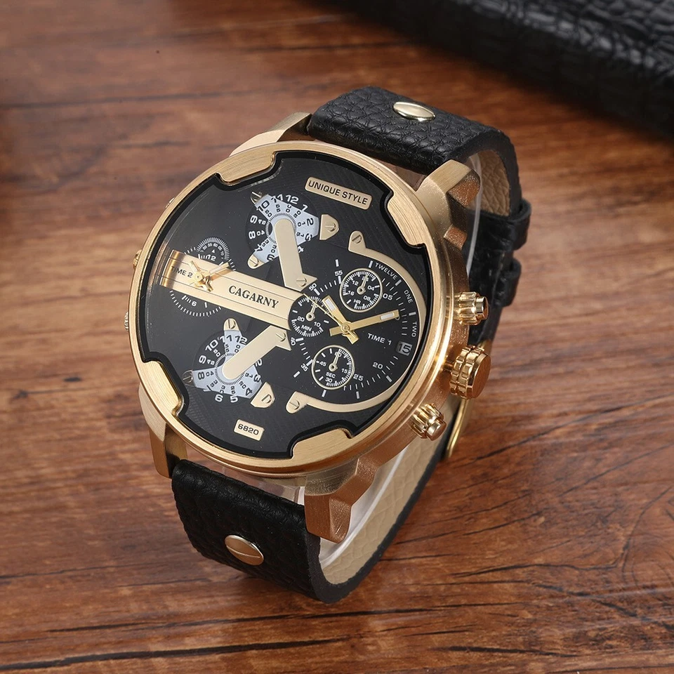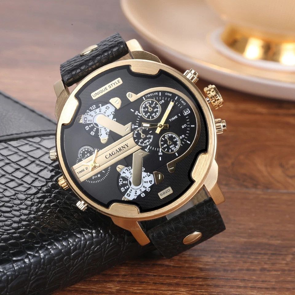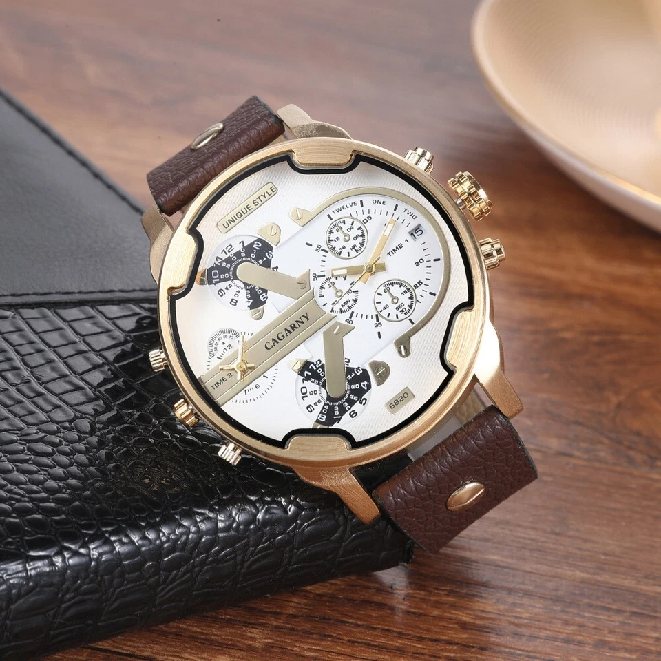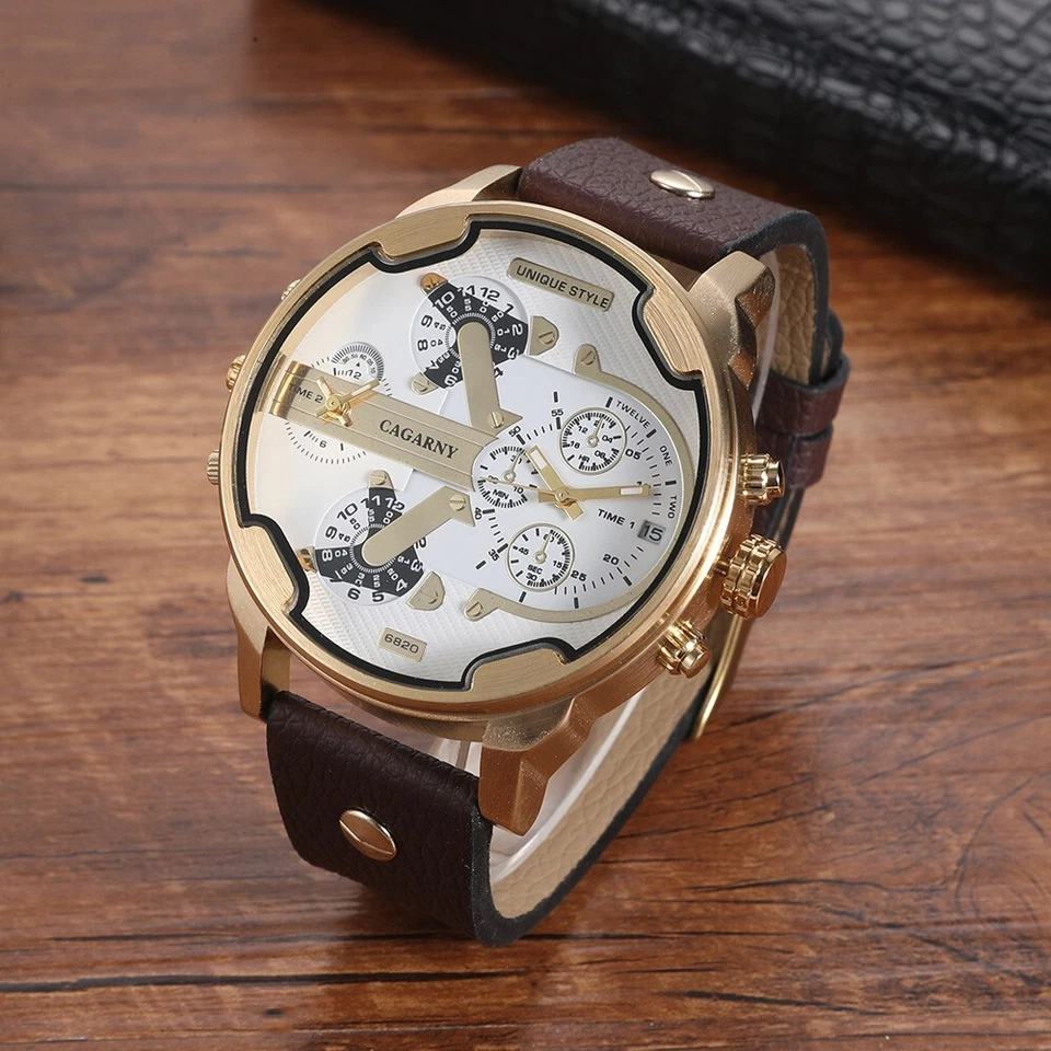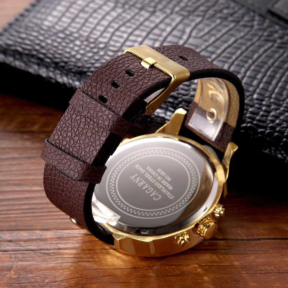 CAGARNY Men's Quartz Watch Large Dial Multi-Time Zone Leather Strap Wristwatch