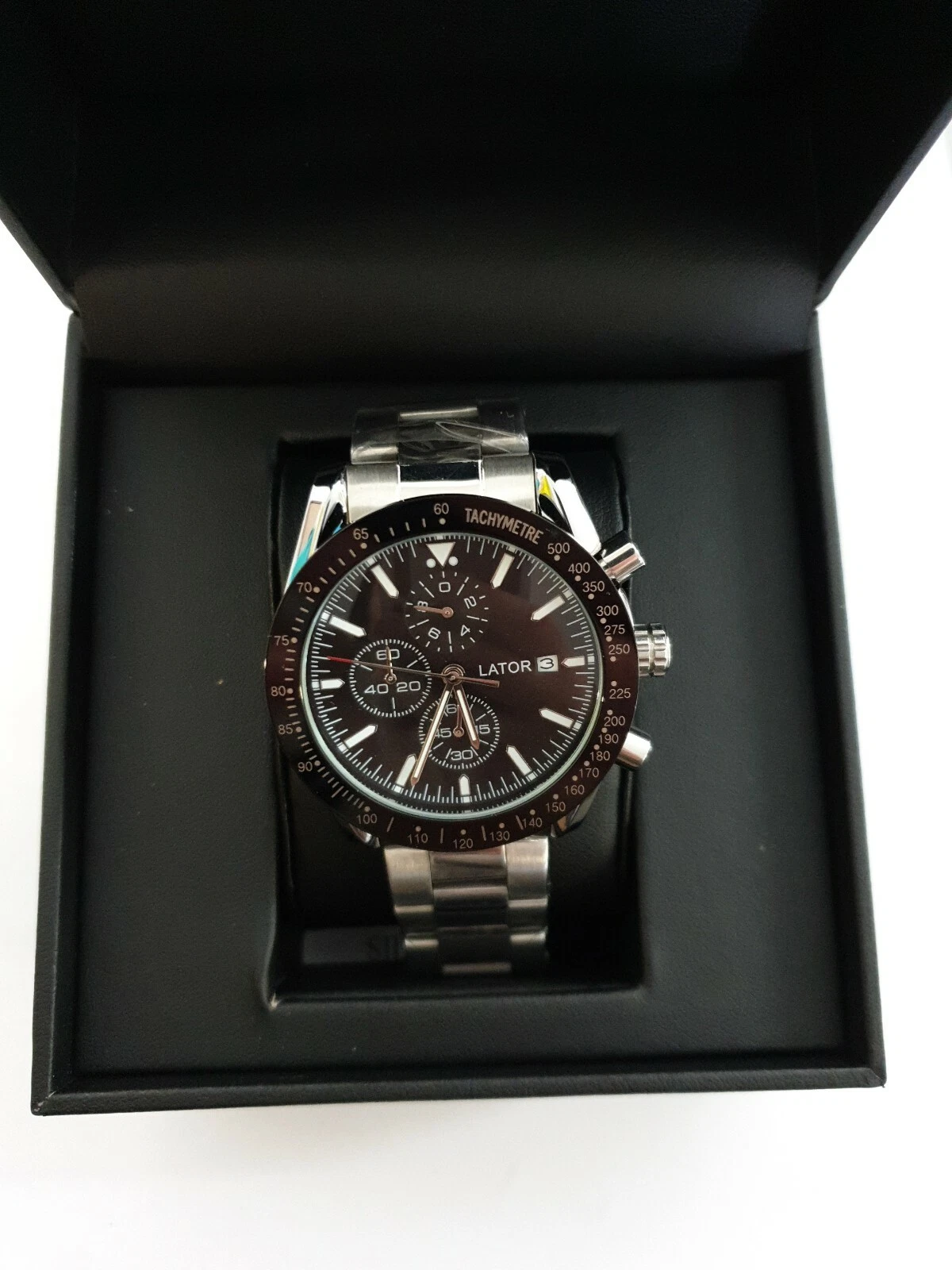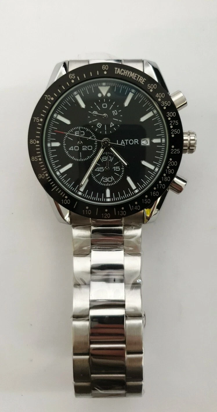 MENS LATOR CALIBRE CHRONOGRAPH WATCH BLack DIAL STAINLESS STEEL STRAP REF A10