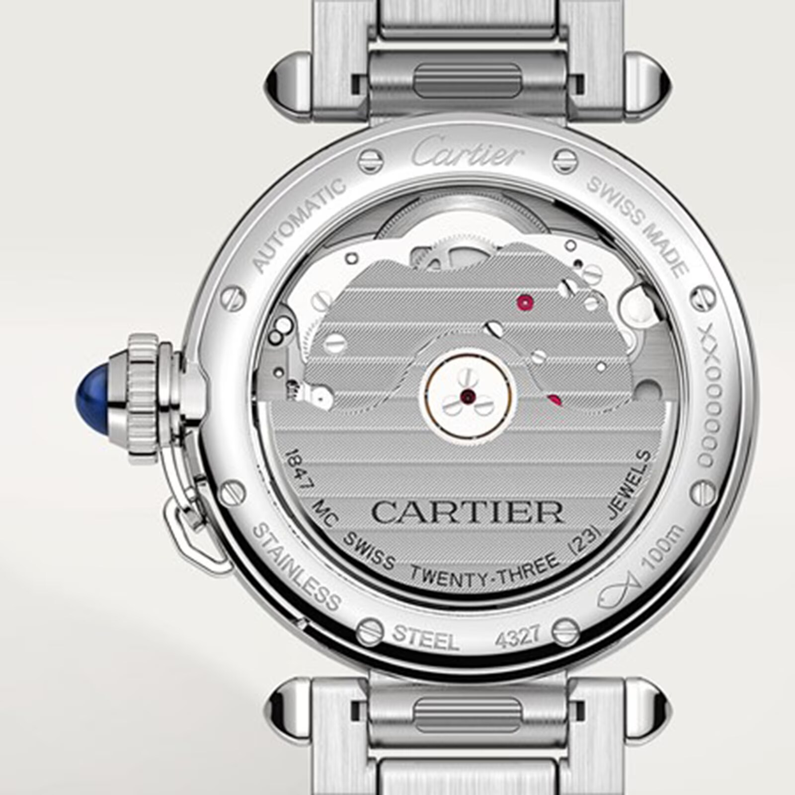 This is a new and unworn watch Pasha de Cartier watch, 35 mm, mechanical movement with automatic winding, caliber 1847 MC. Steel case, fluted crown cap and crown set with synthetic spinels, silver flinqué dial, blued-steel diamond-shaped hands, steel bracelet with "SmartLink" adjustment system, second navy alligator-skin strap, interchangeable steel deployant buckle. Both bracelets are fitted with the "QuickSwitch" interchangeability system. Case diameter: 35 mm, thickness: 9.37 mm. Water-resistant to 10 bar (approx. 100 meters/100 feet). A round wristwatch was introduced into the Cartier collection in 1943, and became the inspiration for the Pasha series. This unique timepiece exudes power and elegance through its construction, featuring: a round, water-resistant case, four Arabic numerals, a screw-down crown cap attached to the case by a small chain, and sword-shaped hands. The distinctive Pasha watch stands out, while at the same time, respects the Cartier watchmaking tradition. Explore the full Cartier range here.