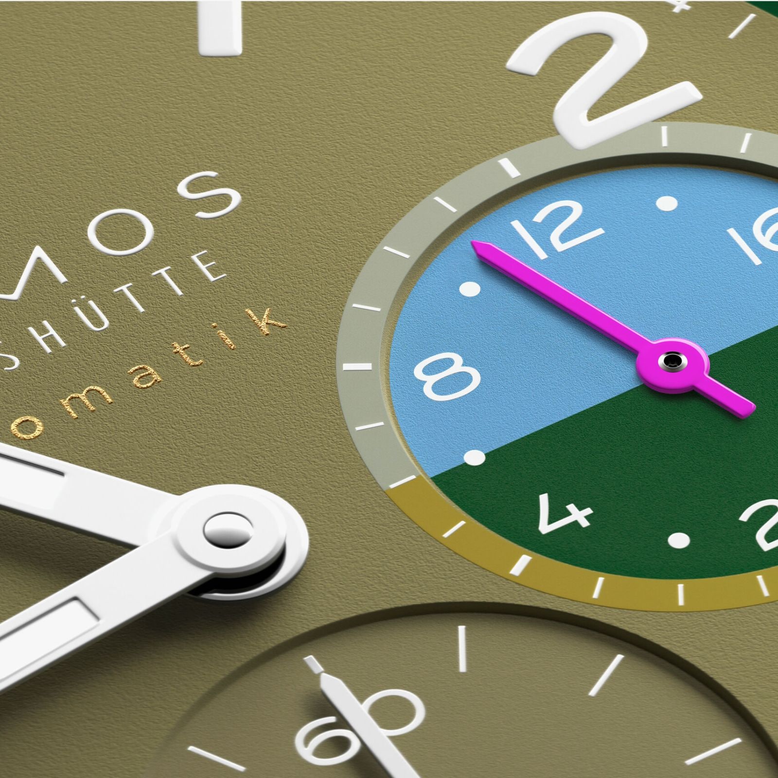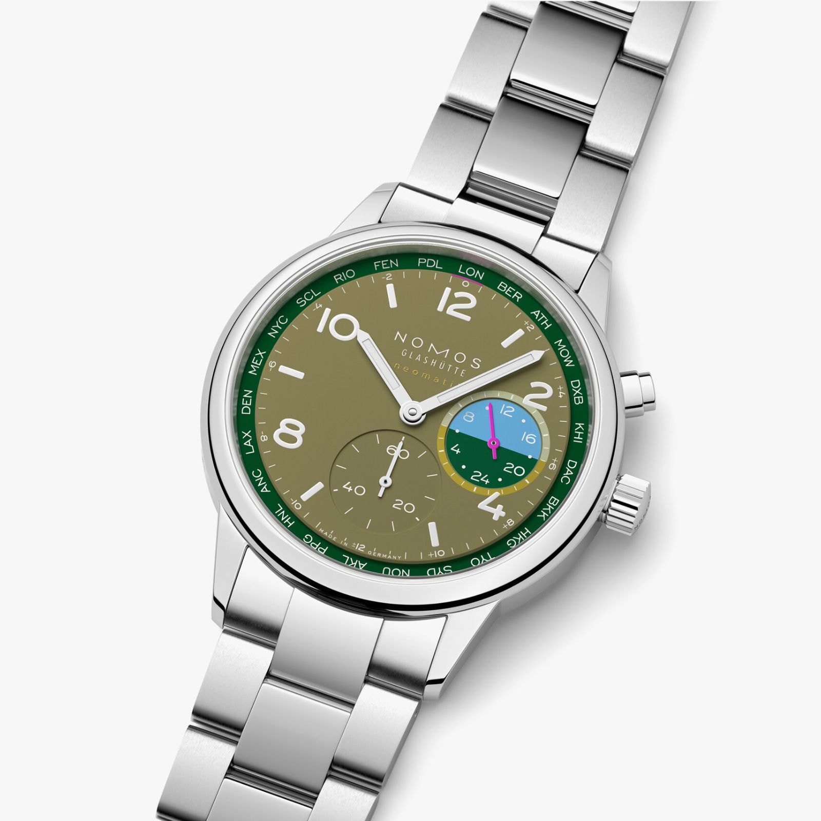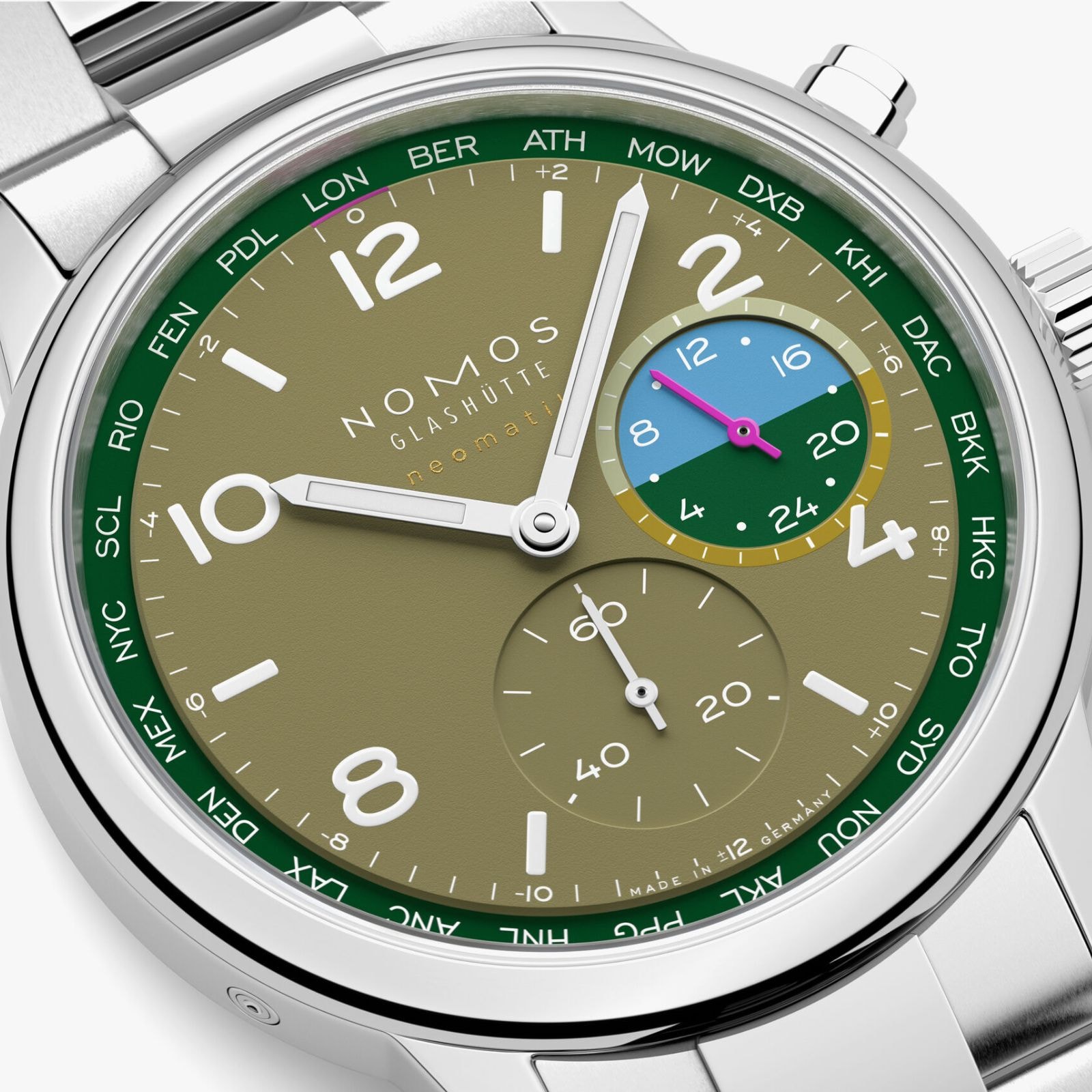 The lush green tones on this watch are reminiscent of a dense rainforest. The deep rich green of tropical giant leaves, the olive green of the undergrowth, and the lighter shades of young shoots. Details in orchid pink and water blue provide contrasting dial accents. This worldtime watch with an automatic caliber is functional and sporty in equal measure. It presents all 24 time zones at a glance and has a 24-hour display for a second time zone. Jungle is limited to 175 pieces—an exclusive and very personal connection with the world.