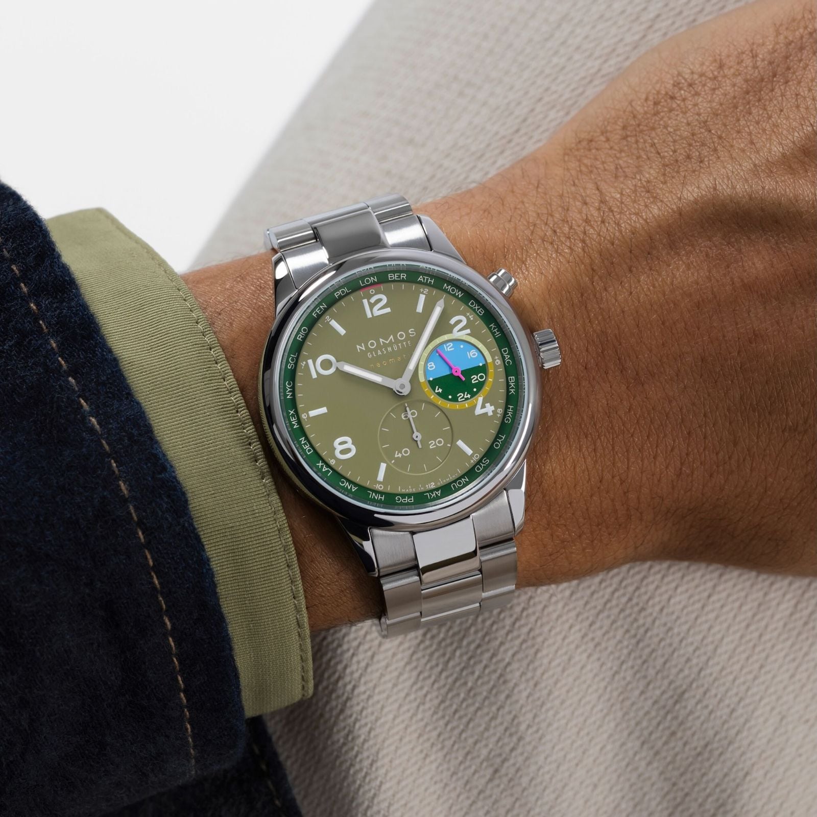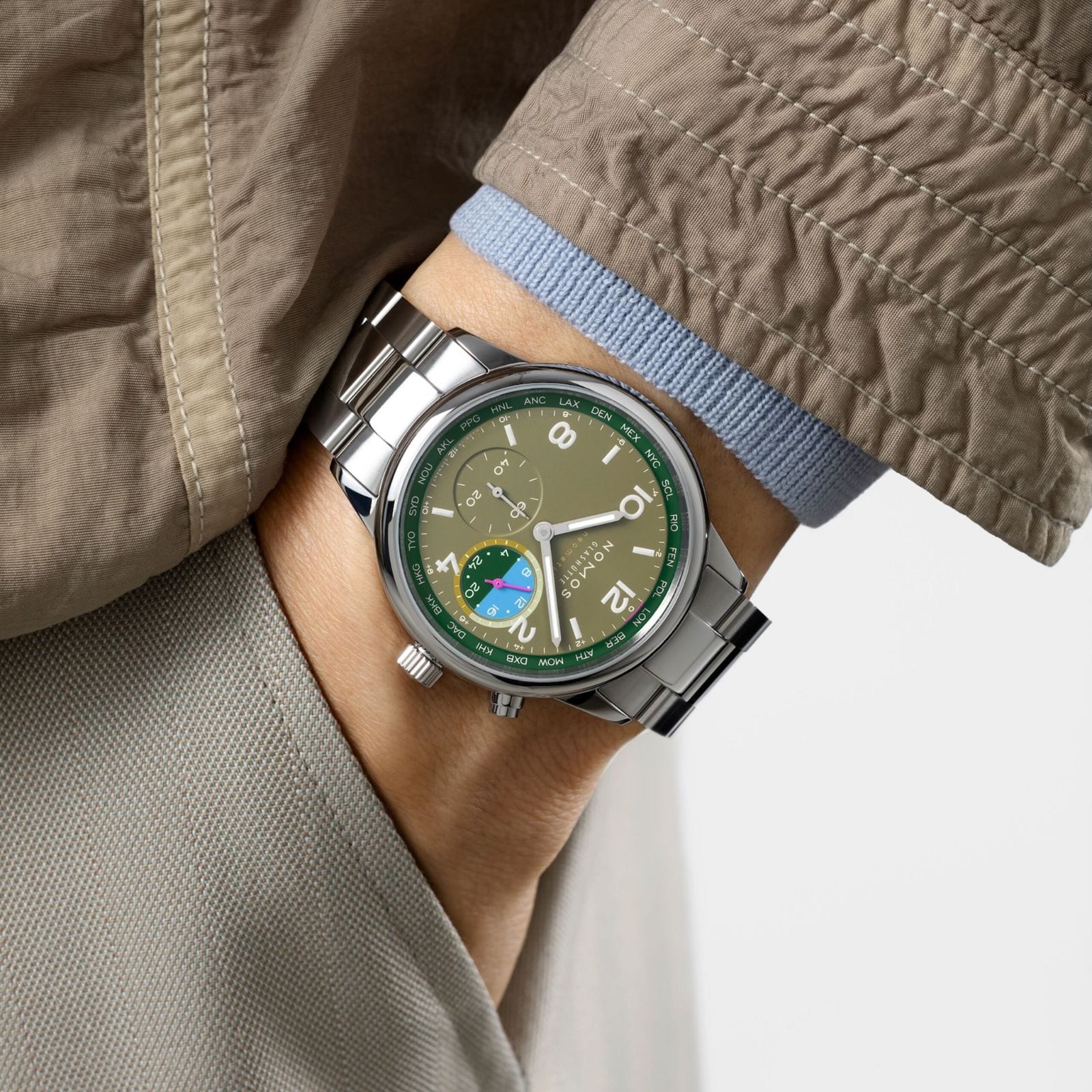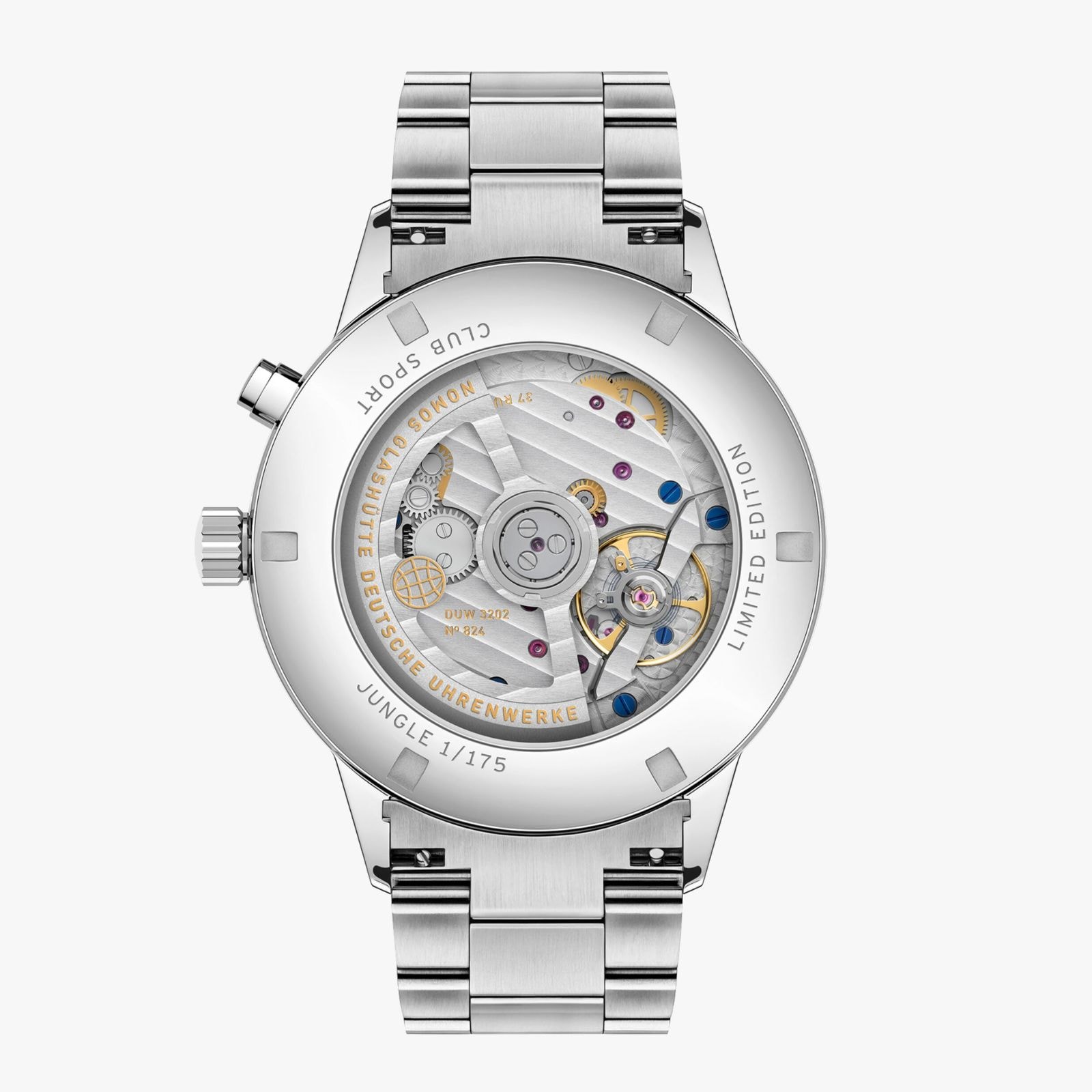 The lush green tones on this watch are reminiscent of a dense rainforest. The deep rich green of tropical giant leaves, the olive green of the undergrowth, and the lighter shades of young shoots. Details in orchid pink and water blue provide contrasting dial accents. This worldtime watch with an automatic caliber is functional and sporty in equal measure. It presents all 24 time zones at a glance and has a 24-hour display for a second time zone. Jungle is limited to 175 pieces—an exclusive and very personal connection with the world.