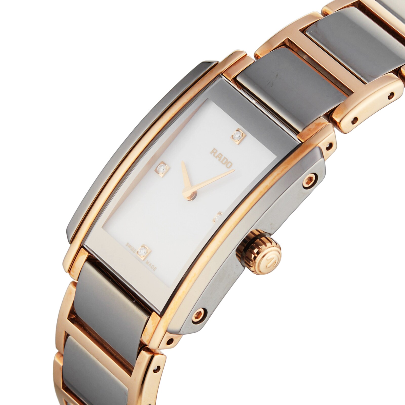 This is a new and unworn watch The iconic Integral has been redesigned to suit the needs and preferences of modern wearers, but the new models remain true to the original in look and feel. The first Rado to feature high-tech ceramic in 1986, it is an enduring piece that continues to delight its fans and attract new enthusiasts. Now with the added allure of diamonds. Movement: Quartz Size: 22.7 mm Precious stones: Yes Total weight: 68 gram