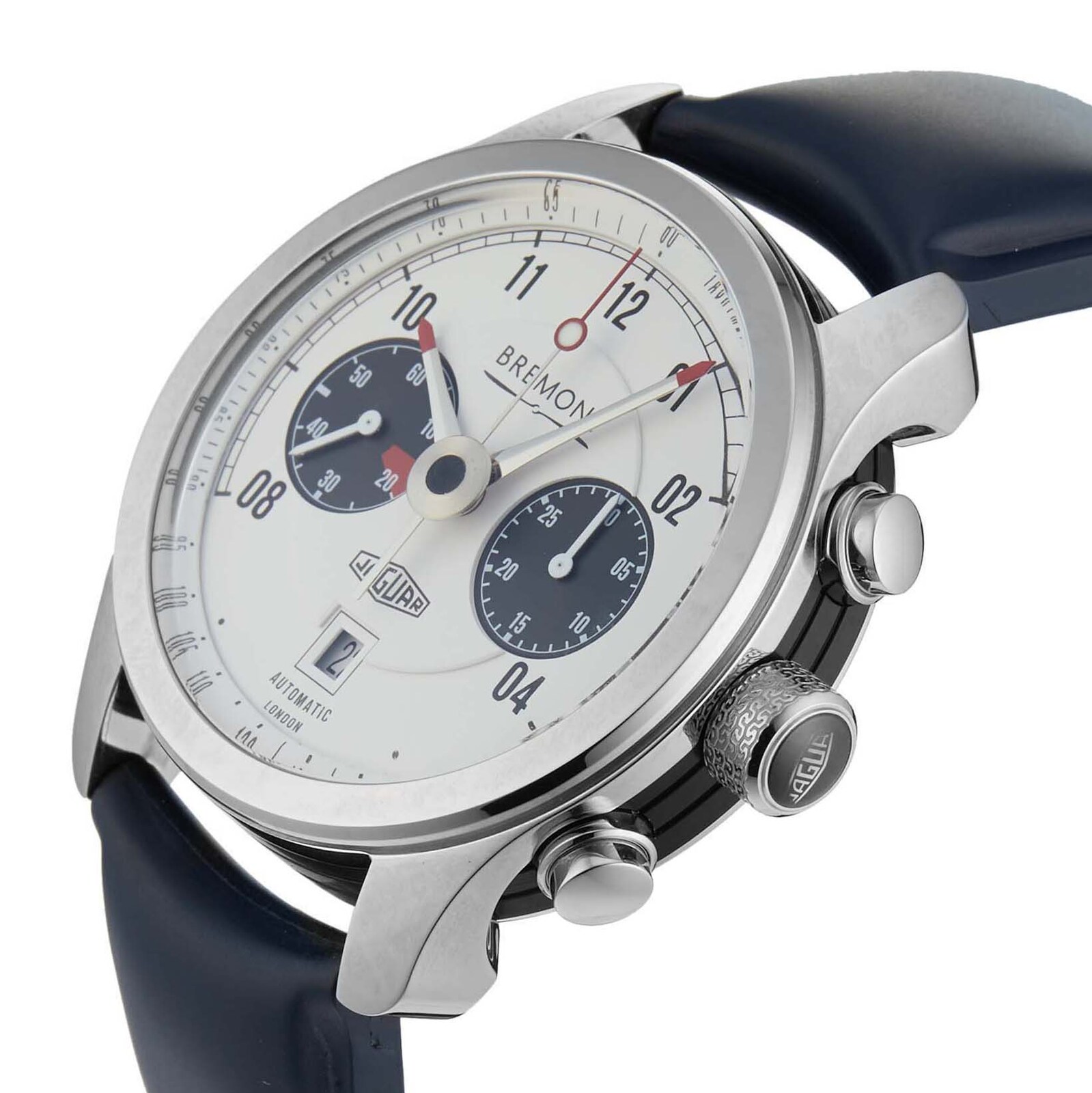 This is a new and unworn watch Bremonts Motorsport collection pays tribute to the beautiful race cars made by the icons of British Engineering from Williams F1 to Jaguar and Norton. Designed in partnership with companies who share the manufacturers ethos of high quality craftsmanship and a classic aesthetic, the collection is characterised by subtle design elements inspired by vintage motorsport. Defining an era of British classic cars, the Jaguar MkII broke the mould when it was launched in 1959, creating a new class of cars - the sports saloon. Transporting the wearer back to the golden era of 1960s sports car motoring, this timepiece integrates high performance and precision with impeccable style. This timepiece is presented in a 43mm stainless steel Bremont Trip-Tick® case, with a large exhibition sapphire crystal case back, which reveals the beautifully finished movement within. The white dial features hour markings in the style of the numerals found on E-type instruments, a classic chronograph layout, and the Jaguar heritage logo above the 6 oclock position. The mechanical BE-50AE movement offers flawless performance, a 42-hour power reserve, and features an intricate Jaguar steering wheel-inspired rotor, while the crown has the original Dunlop tyre tread etched into it and the heritage Jaguar logo finished in enamel on its end. A blue Jaguar leather strap with contrasting red stitching completes the look.