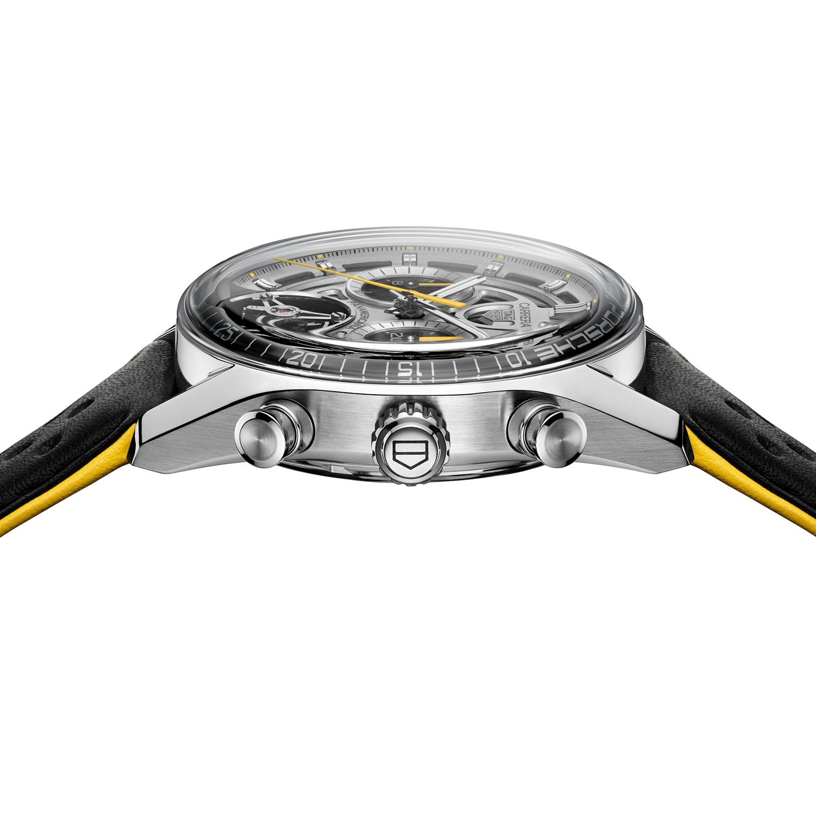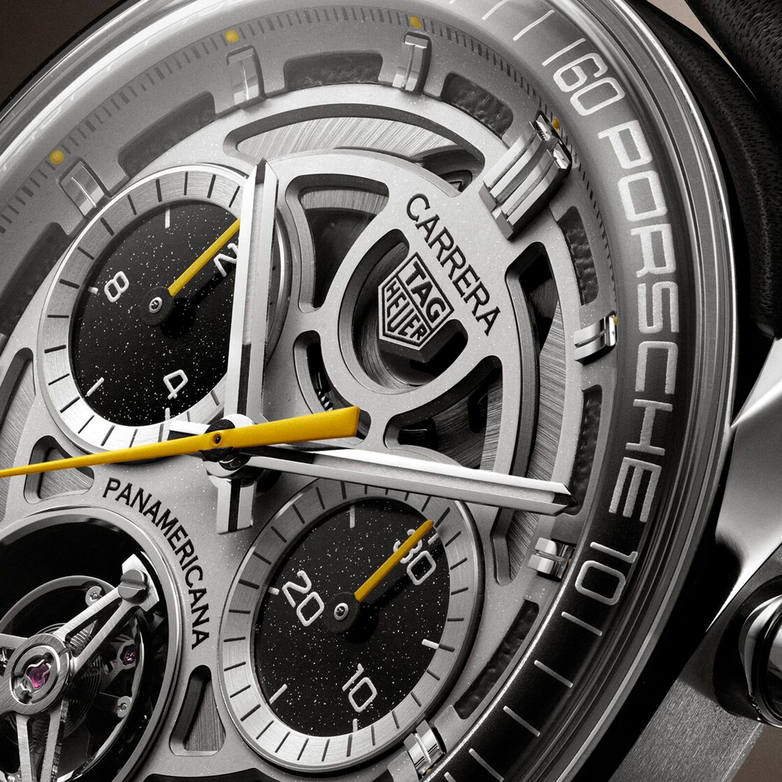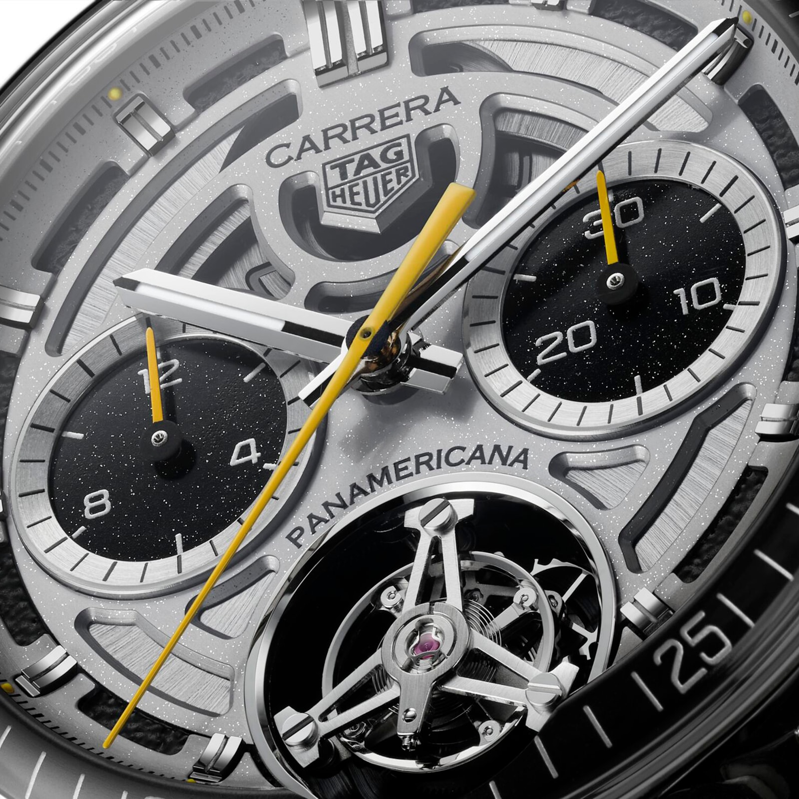 Step into the world of racing heritage with this exceptional TAG Heuer Carrera, a tribute to the Carrera Panamericana race. Housed in a sleek case, this 42 mm special edition features a silver skeleton dial with yellow accents. The COSC-certified TH20-09 tourbillon movement ensures top-notch precision—A bold masterpiece.