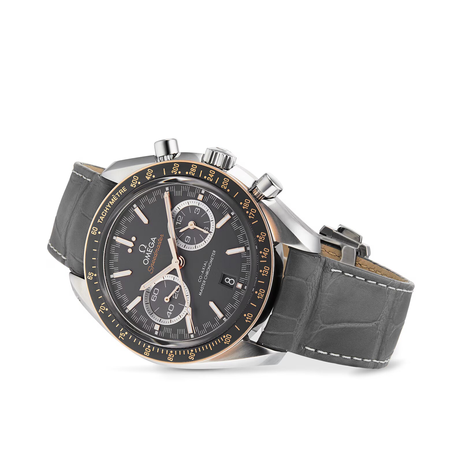 This is a new and unworn watch The Speedmaster Racing collection celebrates the iconic models racing heritage. A distinctive racing style minute track and Super-LumiNova details add a sporty touch to the white dial, while 12-hour and 60-minute recorders add enhanced functionality for the racetrack. This 44.25mm model features an 18K Sedna™ bezel ring with a tachymeter scale in Omega Cedagold™. The matt grey dial is organised with two rhodium-plated sub-dials and a date window at six oclock. White Super-LumiNova and 18K Sedna™ gold hands and indexes complete the dial arrangement. Presented on a grey leather strap with a foldover clasp, this Master Chronometer is driven by the 9900 co-axial calibre movement and includes a self-winding chronograph function.