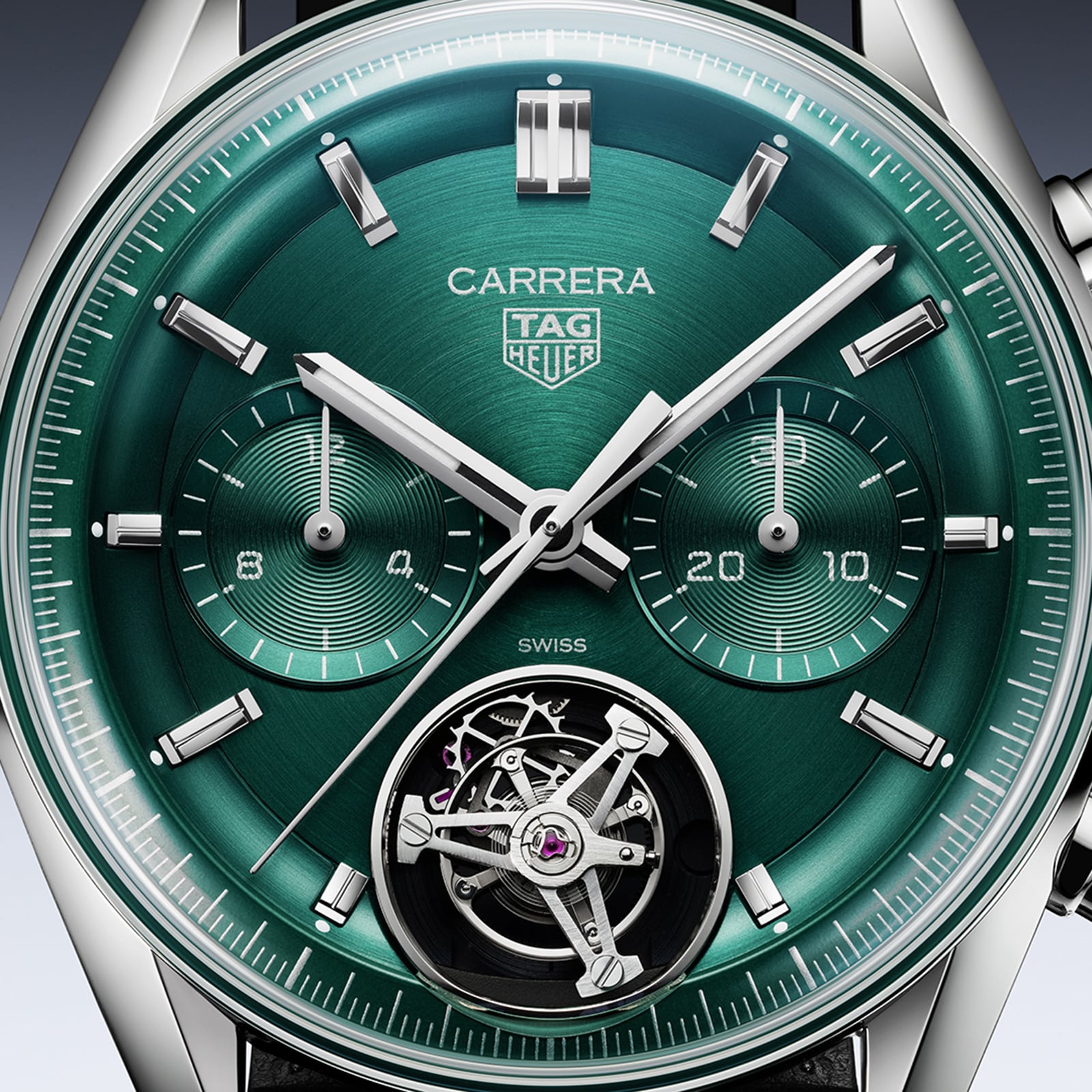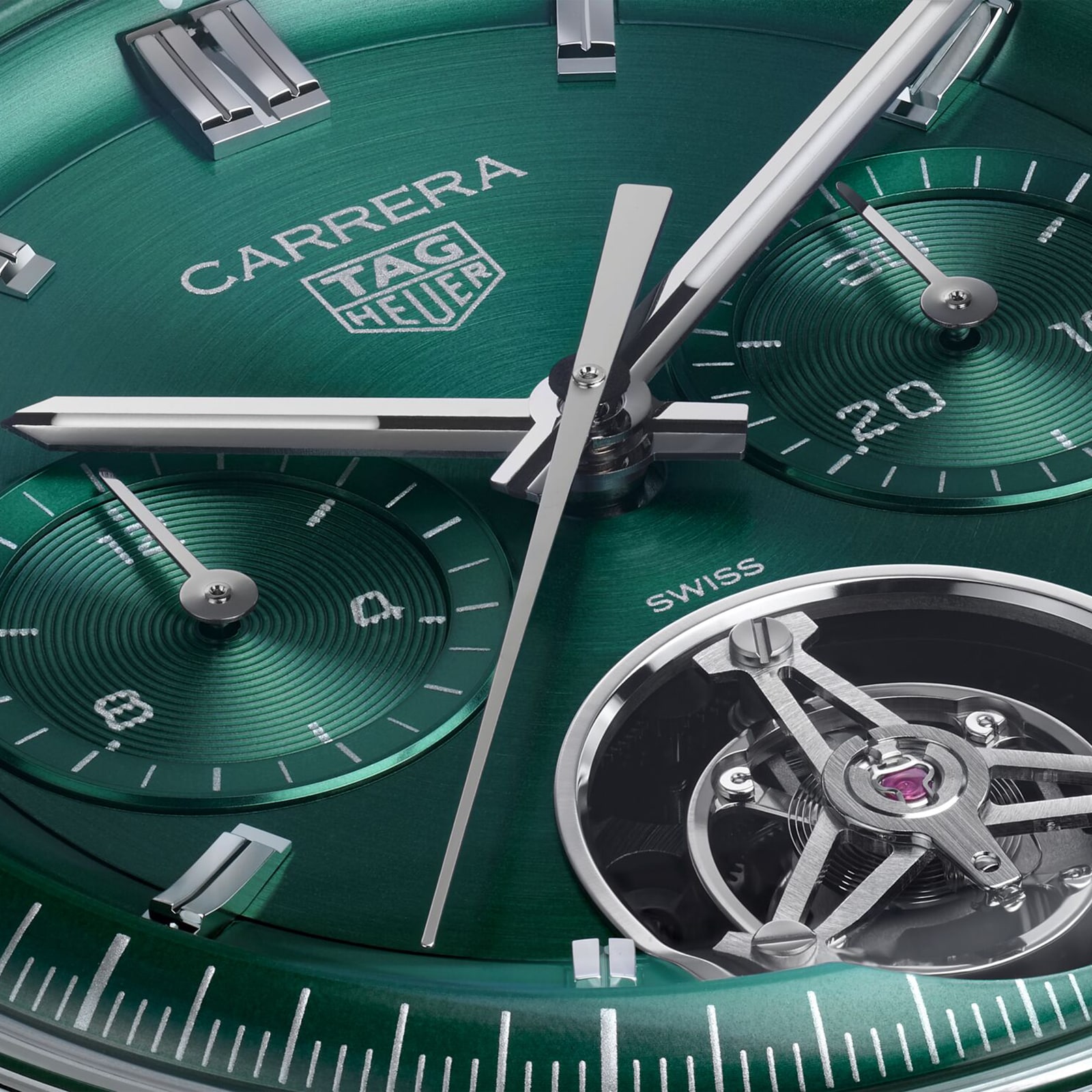 Born on the racetracks in 1963, the Carrera collection embraces the spirit of endurance and outstanding performance. Designed for professional drivers, yet with an elegant sense of style, the collection pays tribute to the infamous Carrera Panamericana race. This Carrera Chronograph Tourbillon model makes a strong impression, with distinctive looks and proud reliability. The bold lines of the steel case reflect strength of character, while the distinctive Calibre TH20-09 automatic movement delivers endless functionality. Exuding confidence, this timepiece is presented in a robust 42mm signature steel case with ergonomic lugs and protective domed sapphire crystal, which perfectly follows the curve of the flange for extreme precision. Ready to take on the racetrack, the vibrant green circular brushed dial presents two tone-on-tone sub-dials and a thrilling tourbillon at 6 o'clock. Visible through the transparent case back, the Calibre TH20-09 automatic movement offers an 80-hour power reserve and ensures flawless precision, on and off the racetrack. A black leather strap completes the sophisticated look.