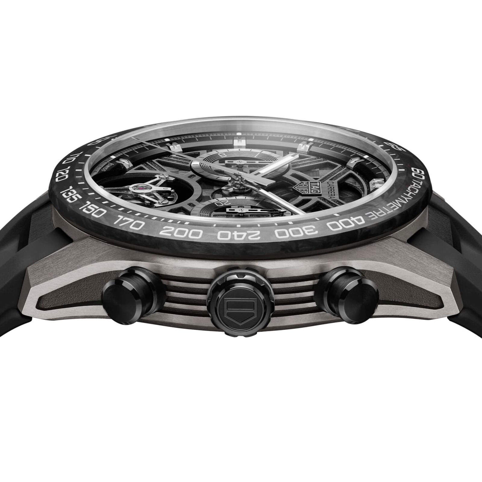 Enter the adrenaline-fuelled world of this TAG Heuer Carrera, a blend of motorsport thrill and exceptional watchmaking. This 44 mm timepiece features a skeleton design with titanium and forged carbon, showcasing the NAC-finished dial and grey scale flange, and houses the COSC-certified TH20-09 tourbillon movement. A racing-inspired gem.