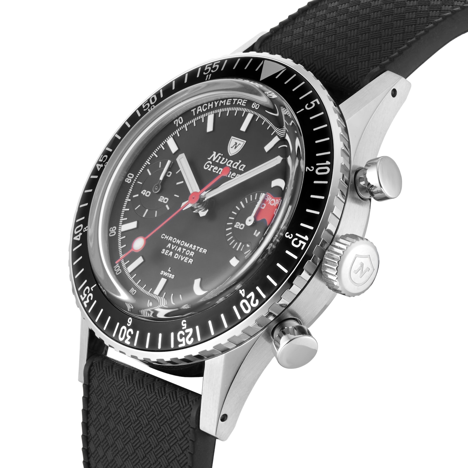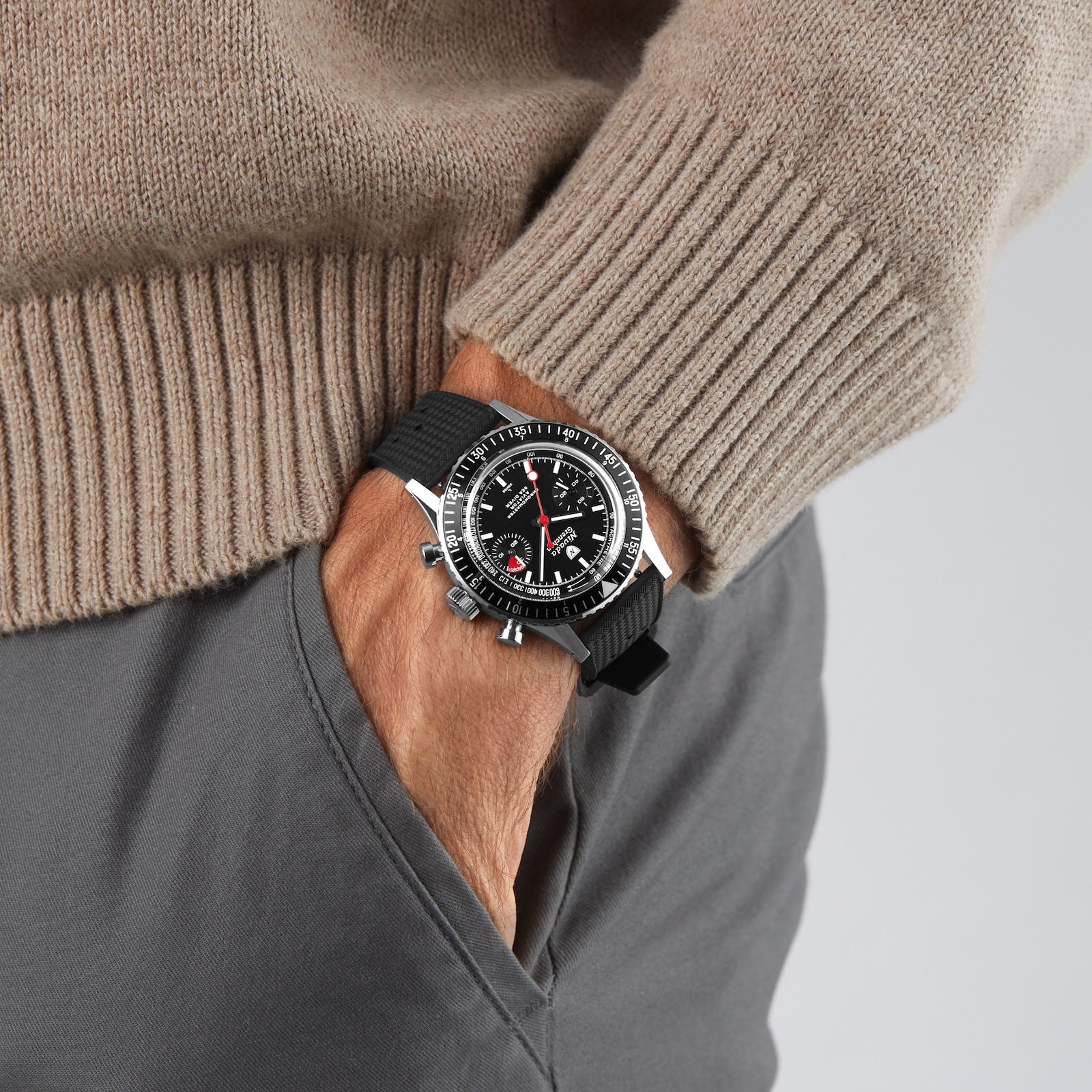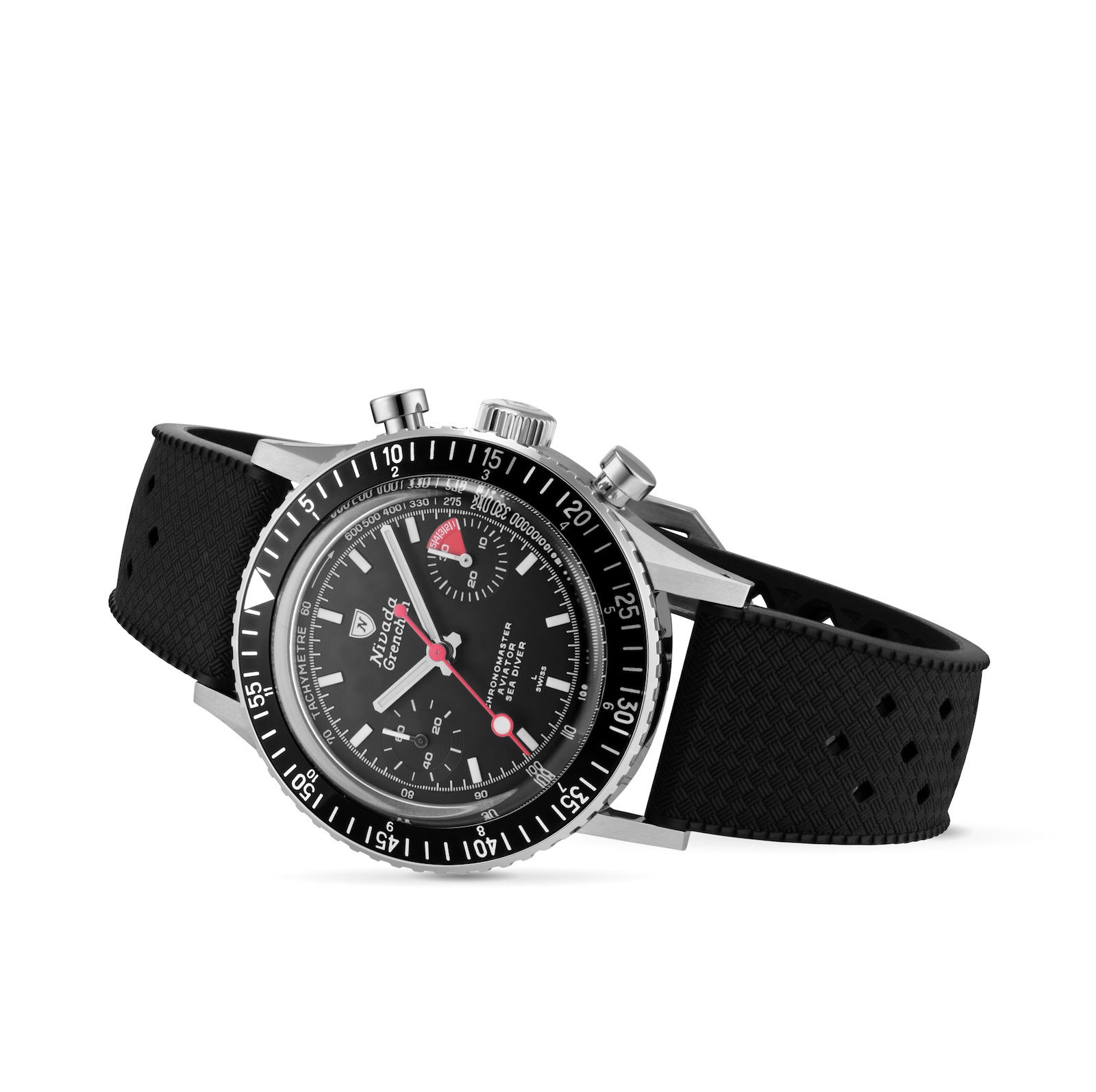 The powerful features that pack this iconic chronograph are powered by the Sellita SW510 BH B movement which allows the timepiece to be either automatically (SW510 BH b) or manually wound (SW510 M BH b). Various choices for its hands and dials are also available, so you can choose from Broad Arrow to Lollipop, and Orange Boy to Panda. Definitely a classic with leading edge preferences. Power Reserve: 63 Hrs Case: Silver color case. Shiny black aluminum inlay Band: Black Rubber Tropic Strap Dial: Matt black color dial. White color luminous indexes Hands: Shiny silver color w/ white luminous filled Sec. hands: Shiny red color w/ white luminous filled 9 hour Sub. hands: Shiny black color with white 3 hour Sub. hands: Shiny white color