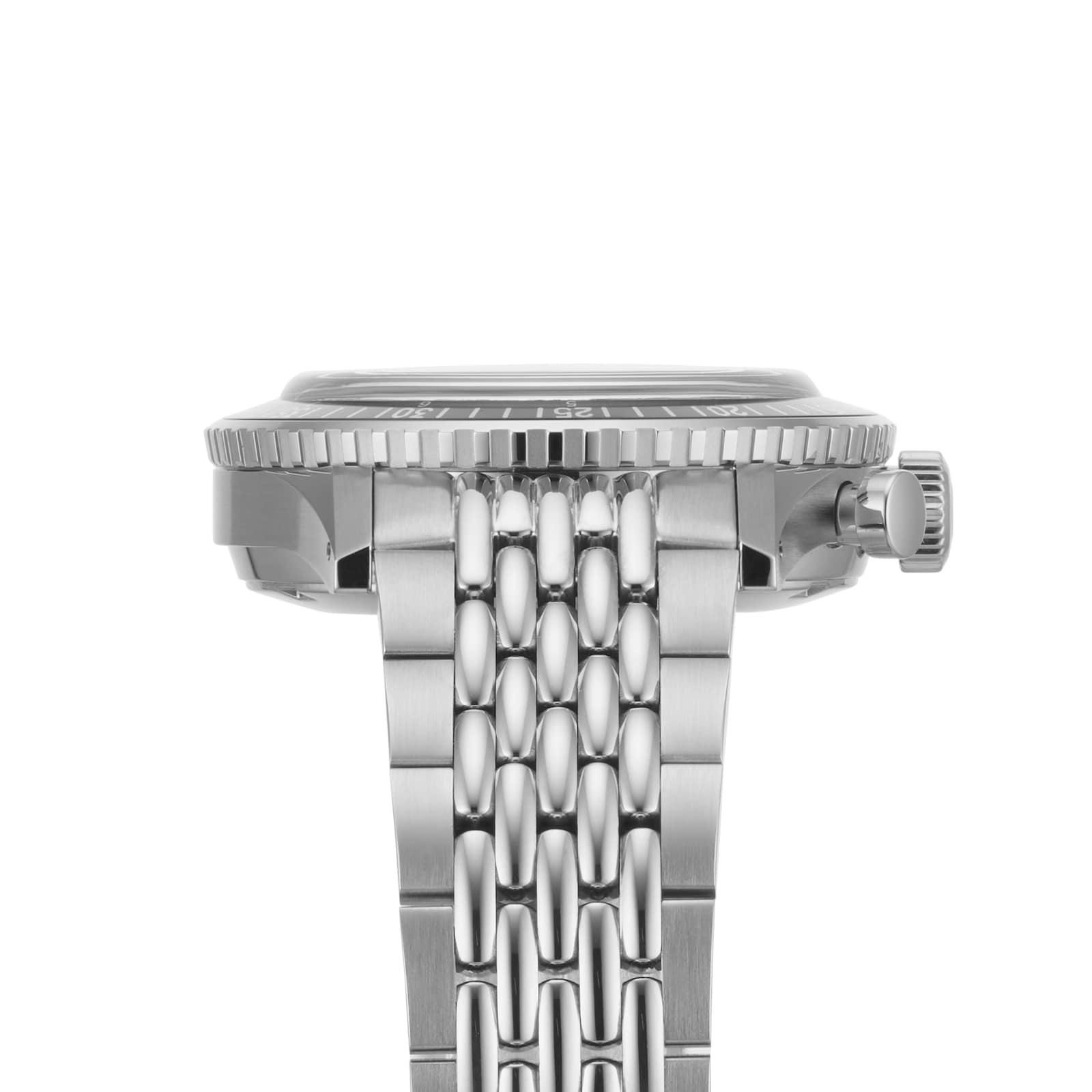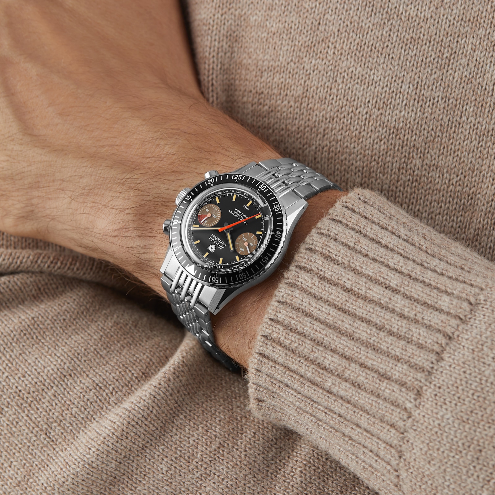 The powerful features that pack this iconic chronograph are powered by the Sellita SW510 BH B movement which allows the timepiece to be either automatically (SW510 BH b) or manually wound (SW510 M BH b). Various choices for its hands and dials are also available, so you can choose from Broad Arrow to Lollipop, and Orange Boy to Panda. Definitely a classic with leading edge preferences. Power Reserve: 63 Hrs Case: Silver color case. Shiny black aluminum inlay Band: Semi glossy black color leather strap w/ black stitching Dial: Matt black color dial. Cream color luminous indexes Hands: Shiny silver color w/ cream lum. filled Sec. hands: Shiny orange color 9 hour Sub. hands: Matte 7513C color w/ white lum. 3 hour Sub. hands: Matte 7513C color w/ white lum.