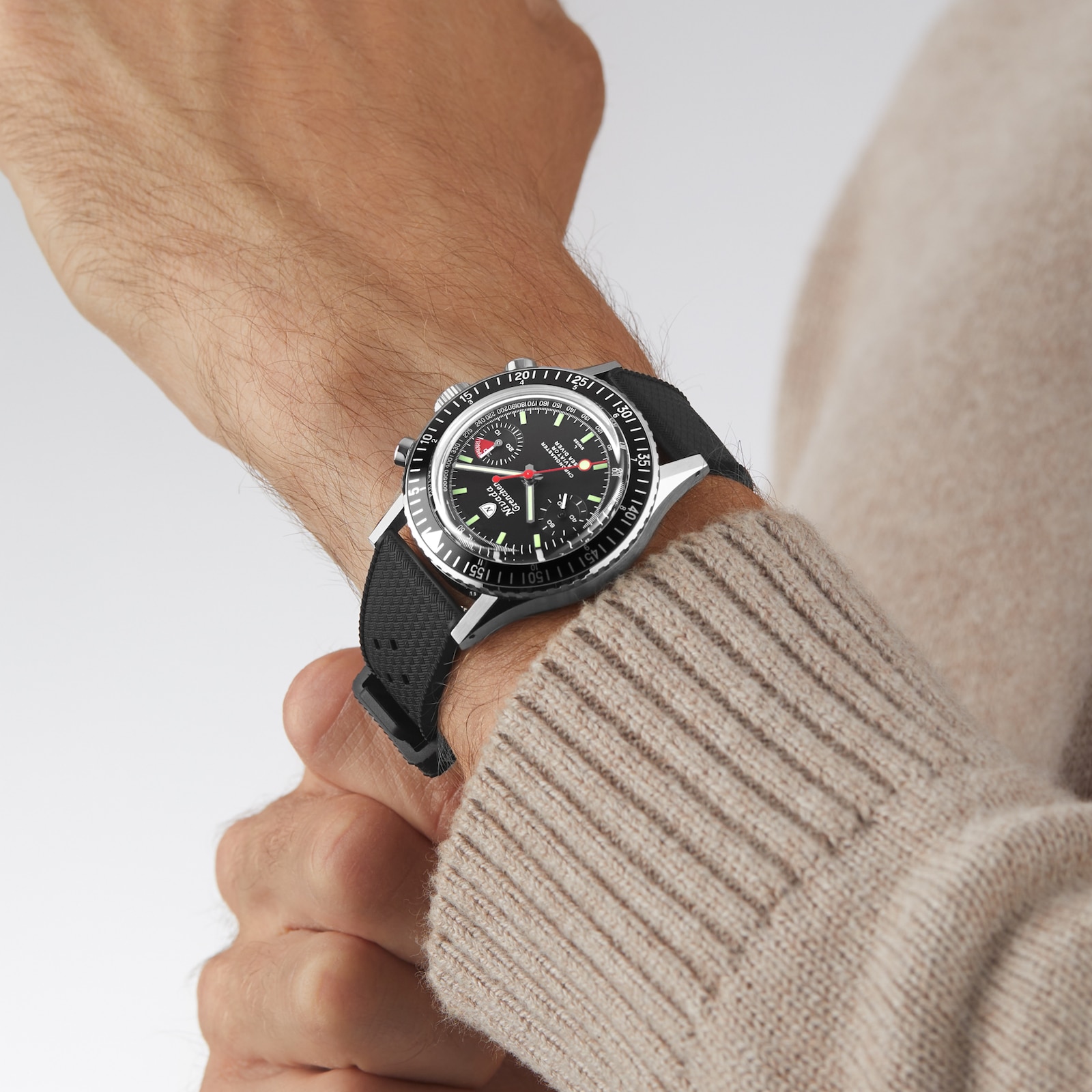 The powerful features that pack this iconic chronograph are powered by the Sellita SW510 BH B movement which allows the timepiece to be either automatically (SW510 BH b) or manually wound (SW510 M BH b). Various choices for its hands and dials are also available, so you can choose from Broad Arrow to Lollipop, and Orange Boy to Panda. Definitely a classic with leading edge preferences. Power Reserve: 63 Hrs Case: Silver color case. Shiny black aluminum inlay Band: Semi glossy black color leather strap w/ black stitching Dial: Matt black color dial. Green color luminous indexes Hands: Shiny silver color w/ green lum. filled Sec. hands: Shiny red color w/ green lum. filled 9 hour Sub. hands: Shiny Black w/ white 3 hour Sub. hands: Shiny white