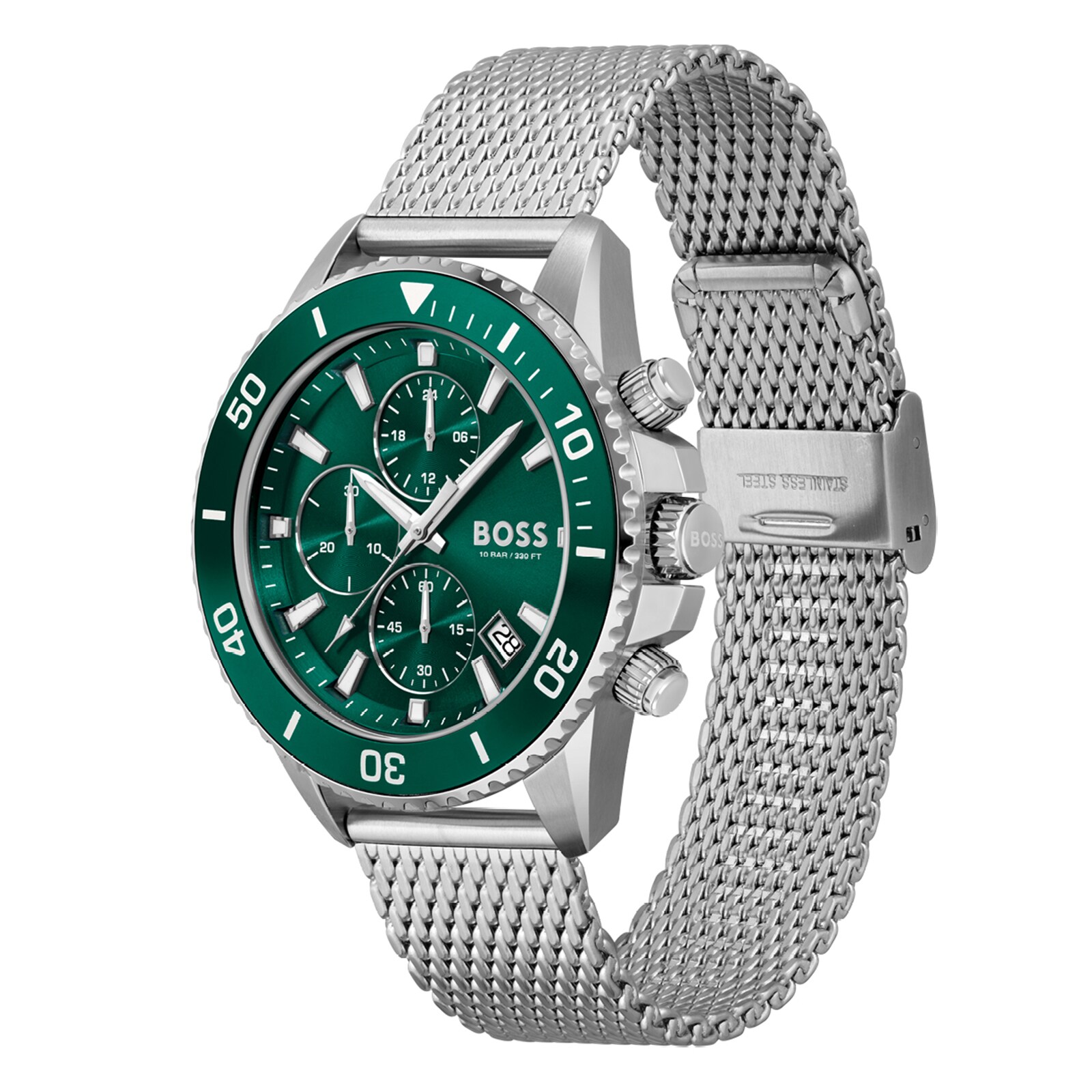 A sporty watch with classic charm by BOSS, built with three hand movement and chronograph encased in stainless steel case and bracelet. Practical sub-dials are on display at 6, 9 and 12 o'clock on the dial. Powered by quartz movement and water resistant upto 100 metres.