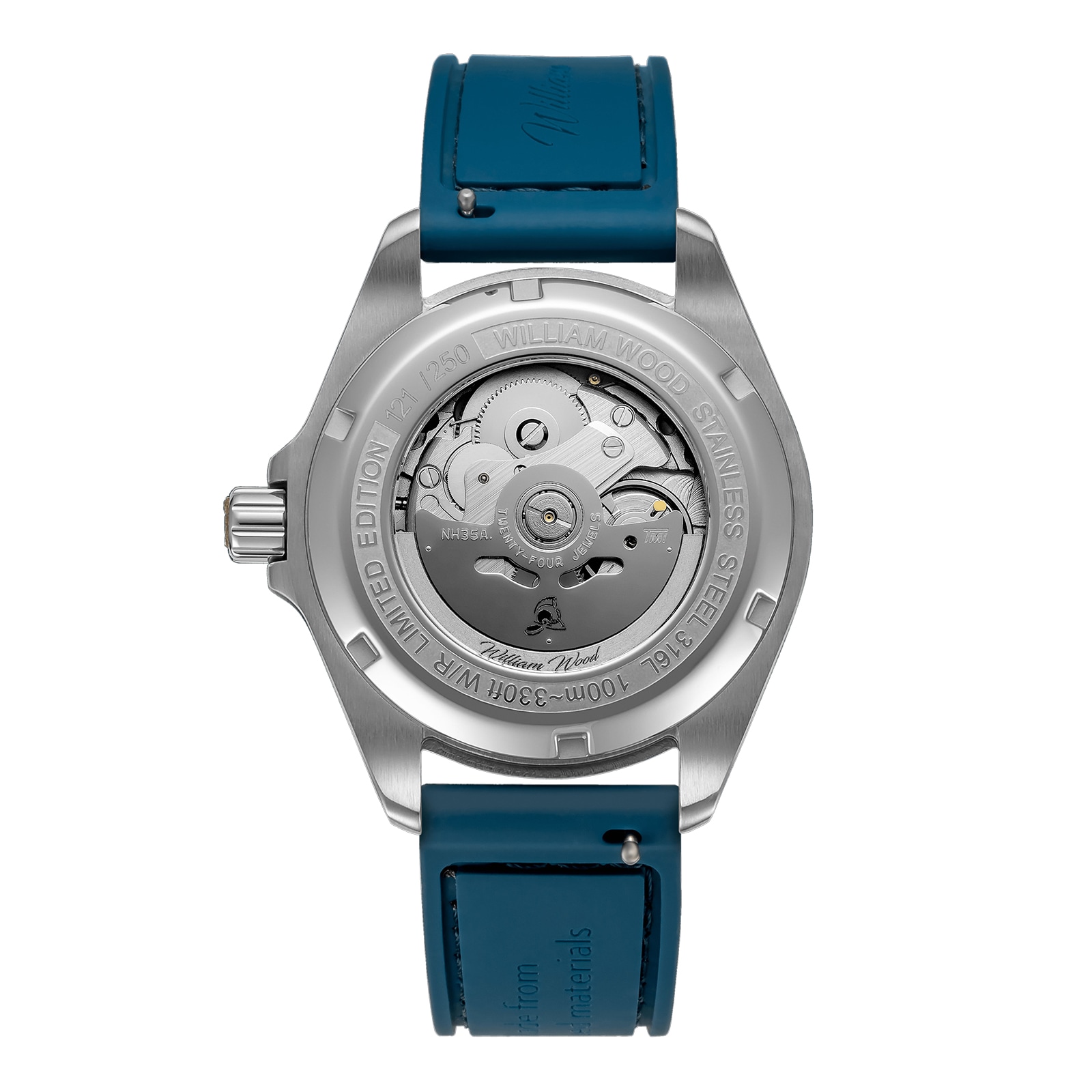 Built by the world renowned Seiko Group, our NH35 Automatic Movement is a reliable and accurate time keeping choice. The NH35 is both hacking and self-winding with a power reserve of 41 hours. For full power reserve Seiko suggests winding the crown 55 times. The NH35 has 24 jewels and a -20 seconds to +40 seconds per day accuracy. CASE MEASUREMENTS Diameter 41mm, thickness 15mm (including double domed glass 16mm), lug to lug 49mm, lug width 20mm CASE EXECUTION Brushed case, aluminium rotating bezel, laser engraved caseback ring and open exhibition glass caseback GLASS Double domed sapphire crystal finished with a medium blue tint and double sided anti-reflective coating DIAL Matte curved sandwich dial with cut-out indices, green  Super-LumiNova sub-layer, 3pm date window, polished hands and fire bell chime inspired seconds marker. CROWN Stainless steel crown with a brass inset made from a 100 year old British brass firefighter's helmet STRAPS All straps have a 20mm lug distance and a quick release functionality allowing you to change straps without any tools required WATER RESISTANT 100 Metres / 10ATM