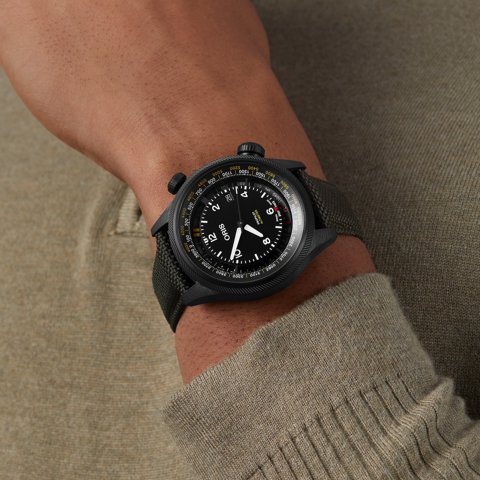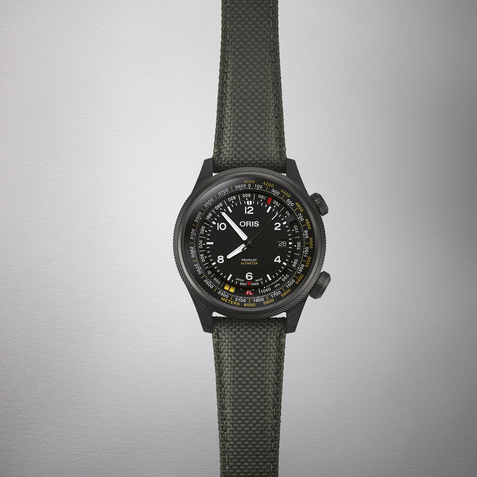 Continuing the tradition of developing high-functioning pieces that pair luxury with functionality and innovation, the Pro Pilot Altimeter is the go-to piece for pilots, mountaineers, and hikers, both professional and amateur. Combining lightweight materials and slimline designs for optimal comfort, this timepiece exudes useability and style. Set against a sleek black dial, the piece combines time, air pressure and altitude readings into one dial. The design has been improved to be capable of indicating altitudes of up to 6,000 metres. A textile woven strap provides a comfortable yet durable pairing to the black, lightweight carbon fibre case. Housed within is the powerful calibre 793 movement with an improved 56-hour power reserve. Water resistant up to 10 bar (100 metres).