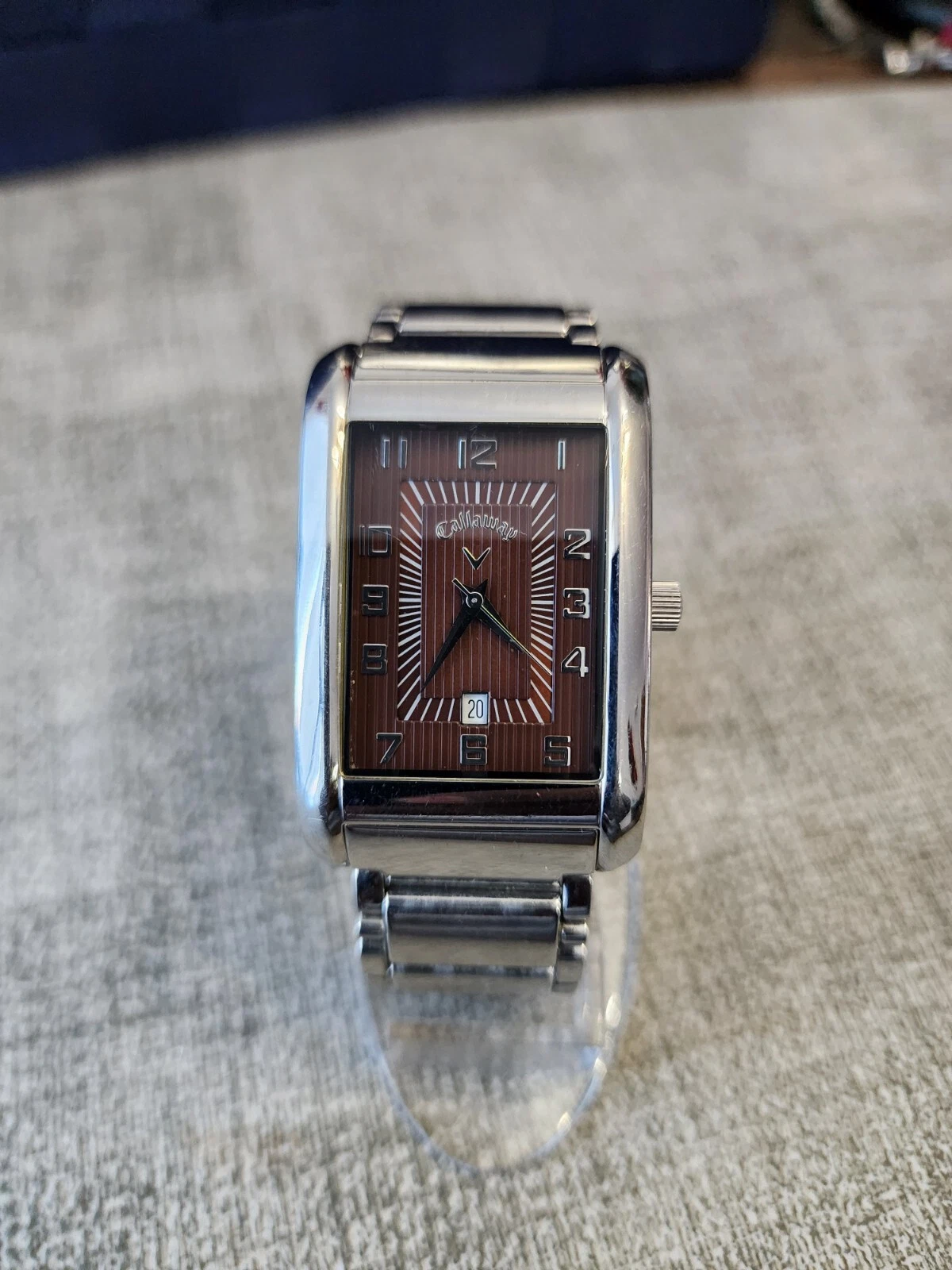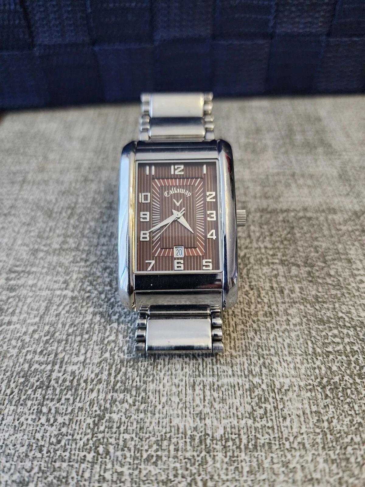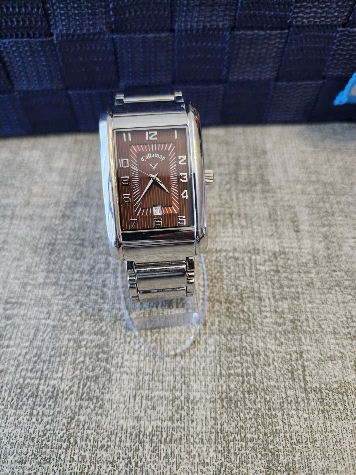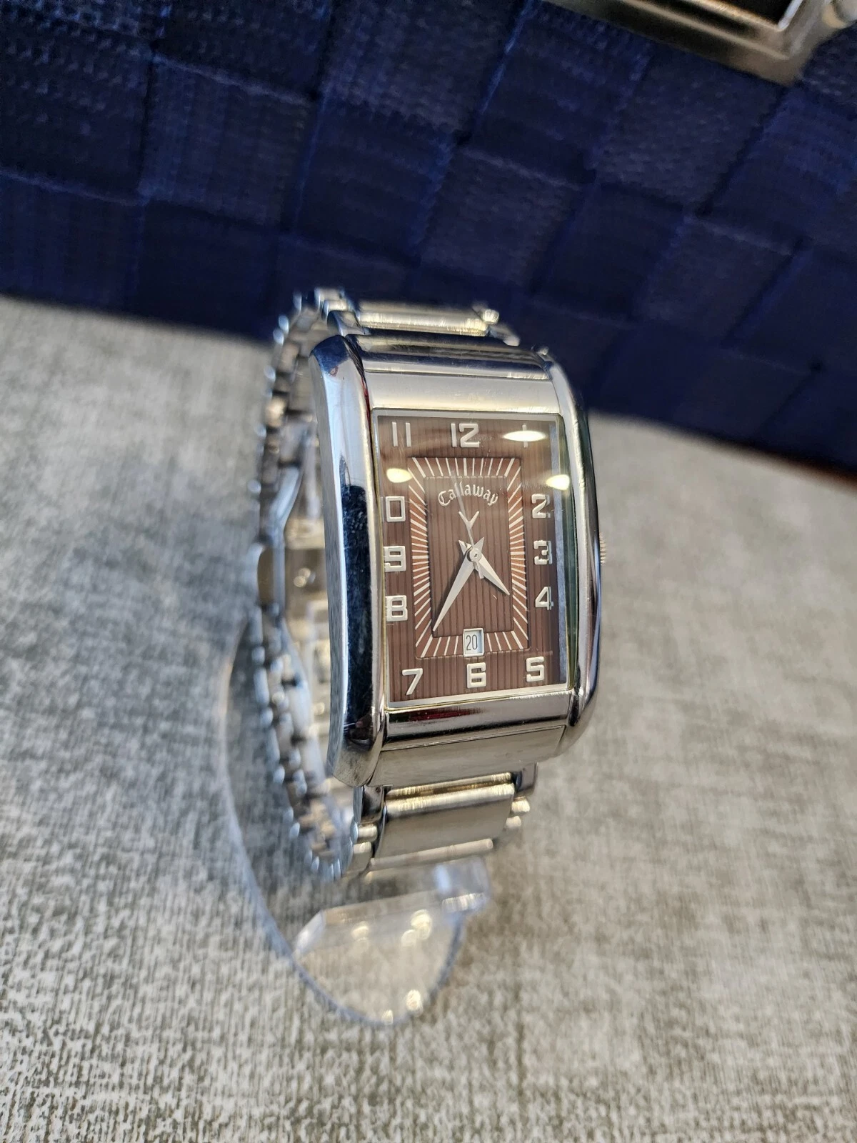 CALLAWAY GOLF TANK WATCH BROWN WOOD DESIGN FACE CY2096. PRE-OWNED. NEW BATTERY.
