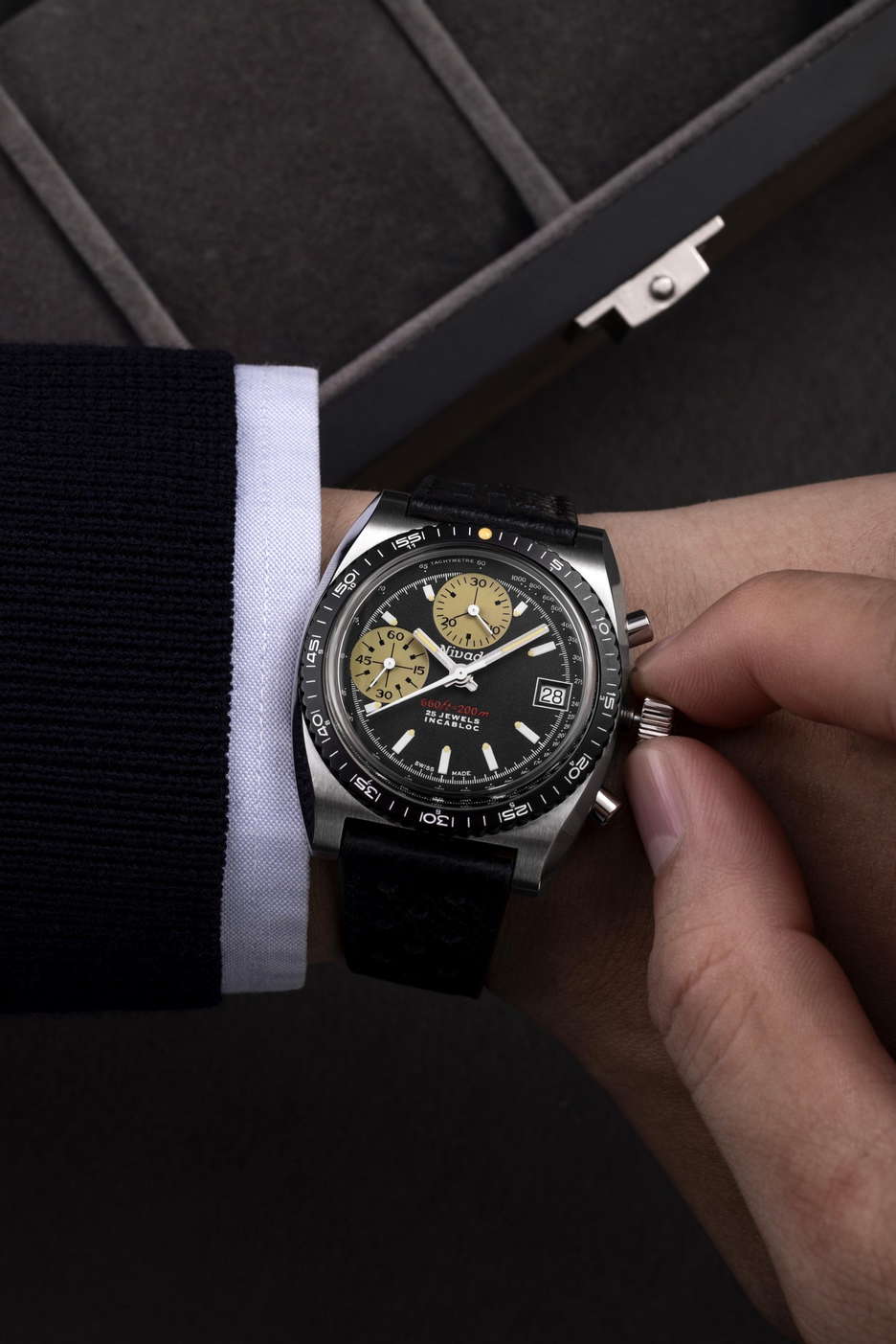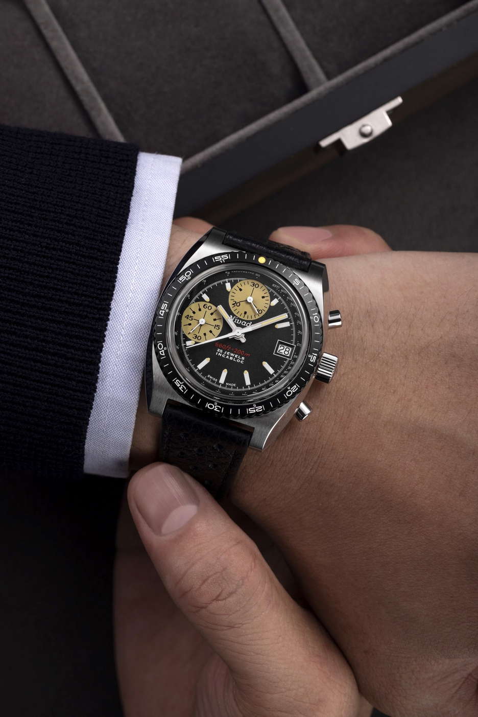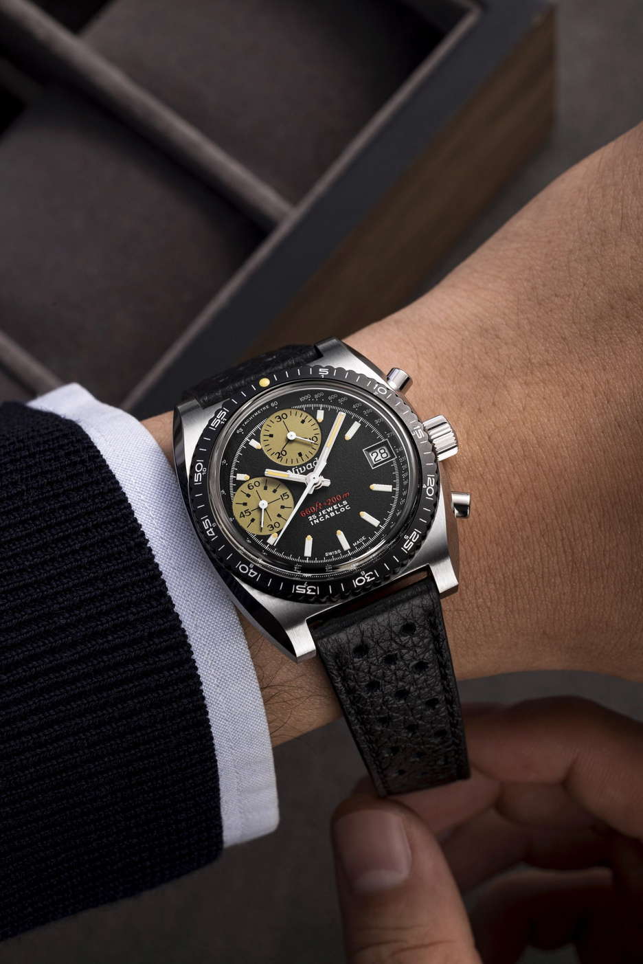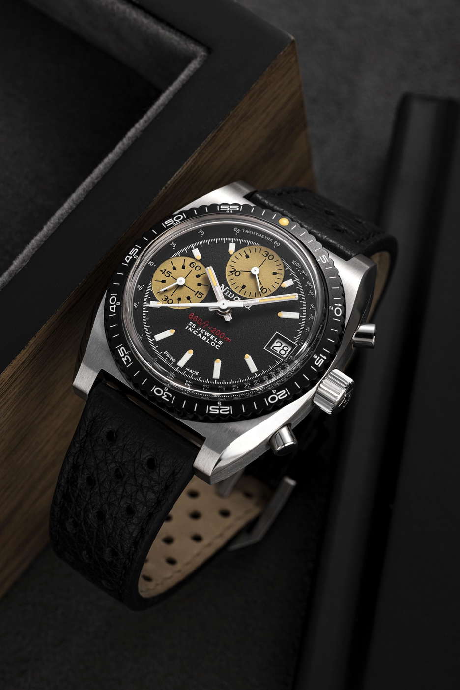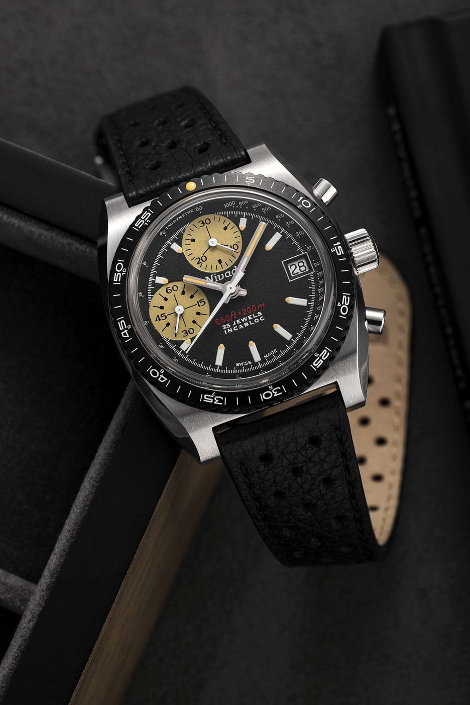 Nivada Grenchen’s Chronosport 38mm makes a sensational debut, drawing inspiration from a previously unreleased vintage chronograph prototype from the 1970s. This classic timepiece has been refreshed for the modern man, combining the excellence of Swiss watchmaking with a sleek and sophisticated design. Since 1926, Nivada Grenchen has been synonymous with quality. In 2018, Guillaume Laidet aimed to revive the brand’s iconic models for a broader audience. The discovery of the Chronosport prototype, with only about 20 ever made and never commercialized, sparked huge demand on social media for a reissue. The new Chronosport is celebrated for its unique dial, featuring a textured matte black background, two embossed sub-dials in taupe with a hint of khaki, and a tachymeter scale. It also features either white or yellow Super-LumiNova® indices and hands, a bold white logo, and Art Deco typography, all designed by renowned dial maker Jean Singer. The Chronosport is powered by the automatic Valjoux-7750-ETA movement, with a 42-hour power reserve and multiple functions. Its 38mm stainless steel case, domed sapphire crystal, and a water resistance up to 200 meters. Additionally, it features a fluted unidirectional rotating aluminum bezel and offers 10 strap options for customization.