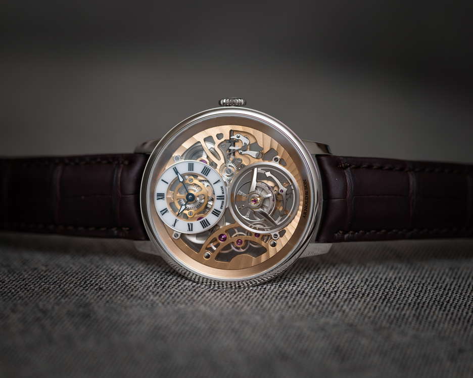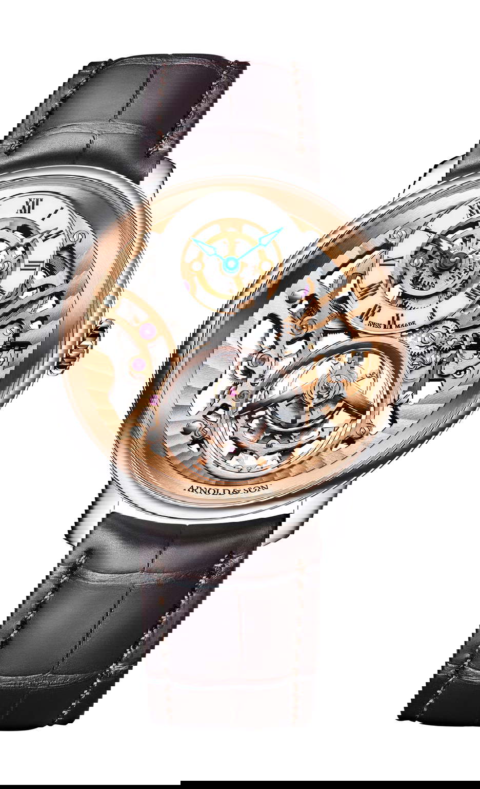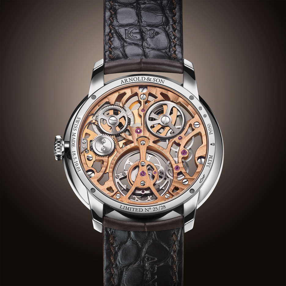 The Ultrathin Tourbillon Skeleton from Arnold & Son is available in either red gold or platinum, each limited to only 28 pieces. The timepiece has a 41.5 mm case with a remarkable thinness of just 8.4 mm, framing the A&S8320 calibre, one of the slimmest skeleton tourbillon movements at 3.3 mm. Precision engineering is evident with its variable-inertia balance, ensuring superior calibration stability. Craftsmanship shines through with the skeletonized movement, highlighting sweeping curves and expert finishes. Rose-gold PVD-coated bridges with Côtes de Genève stripes and a signature Arnold & Son flange encapsulate the brand’s legacy. The heart of the watch, the A&S8320 calibre, is a 1-minute flying tourbillon without an upper bridge, offering a sleeker profile. The tourbillon carriage, completing a rotation per minute, serves as a delicate seconds indicator. With a substantial 100-hour power reserve, this calibre exceeds expectations for ultra-thin timepieces, maintaining Arnold & Son’s reputation for exceptional performance.