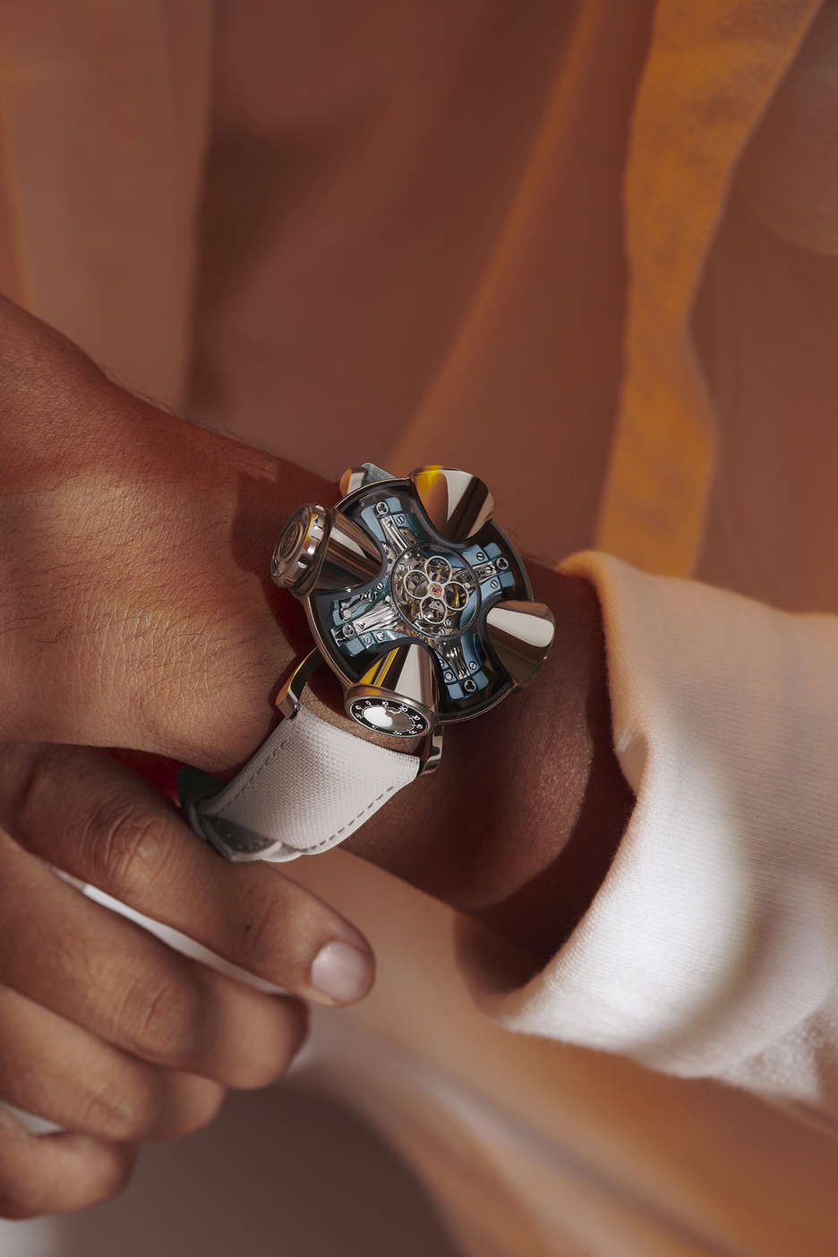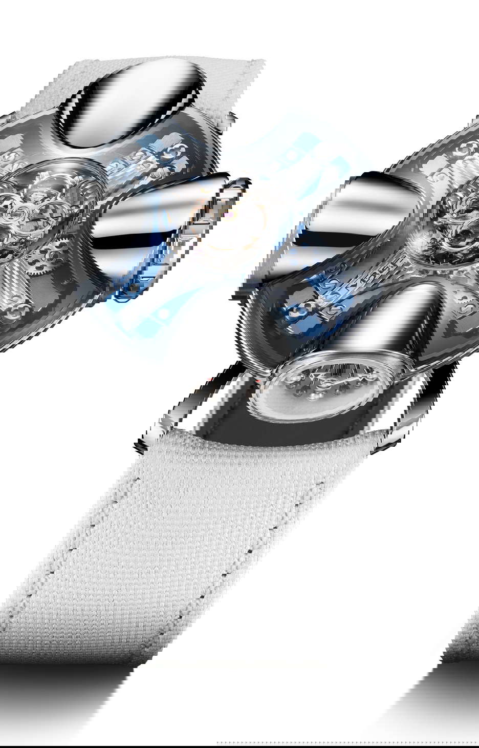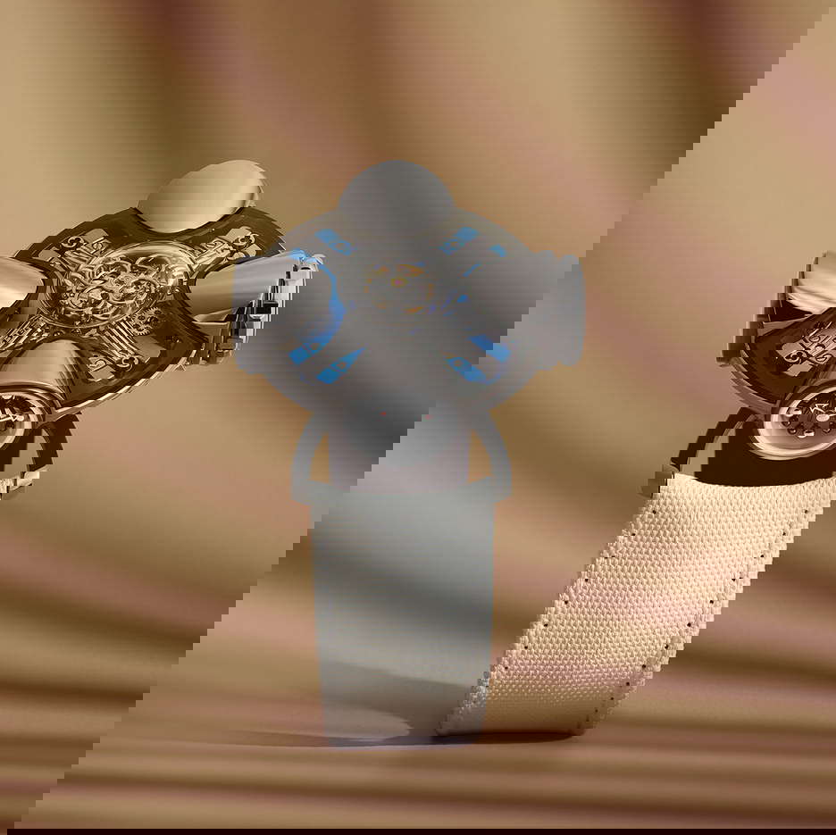 The MB&F Horological Machine Nº11, dubbed ‘Architect’, is a wearable story, a narrative of space and time that transcends the ordinary. Inspired by the innovative spirit of 1960s architecture, it’s a watch that you don’t just wear—you live it. This timepiece bridges the gap between a house and a watch, with a design that seems to grow organically from the wrist, offering a glimpse into a futuristic, yet humanistic approach to timekeeping. At its heart lies a central flying tourbillon, a beacon within a sapphire crystal dome, akin to the most sacred of spaces, radiating time with a celestial cadence. Four unique chambers extend from this core, each serving a specific purpose: telling time, indicating power reserve, measuring temperature, and setting the time. The dynamic structure can be turned, and with each rotation, it not only alters its display but also winds the watch, a feature that showcases the brand’s innovative approach to horology. Crafted from Grade-5 titanium and sapphire crystal, the Horological Machine Nº11 Architect is a testament to MB&F’s mastery over complex forms and advanced materials. Each of the 25 pieces in both the blue and red gold launch editions is a confluence of aesthetic elegance and mechanical brilliance, reflecting the sky and earth in their design. More than a watch, the HM11 is an architectural marvel at the scale of the wrist. It respects the form of the human body and the mechanics of human perception, all while pushing the boundaries of what a timepiece can be. The HM11 is a limited edition of 50 pieces, with 25 in each color variant, and is a wearable piece of architecture that encapsulates the essence of MB&F’s creative vision.