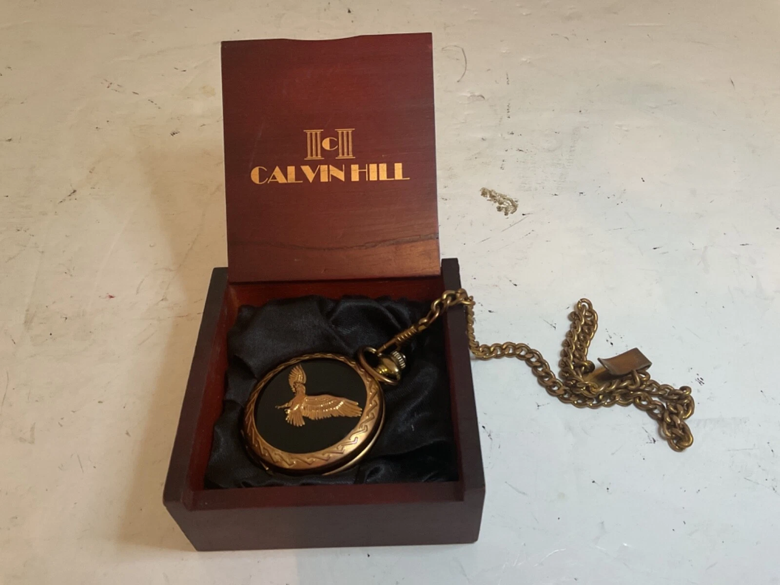 Collectible ENAMELED EAGLE POCKET WATCH CALVIN HILL IN ORG BOX