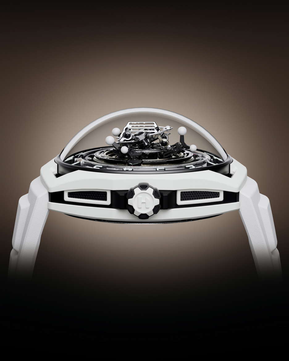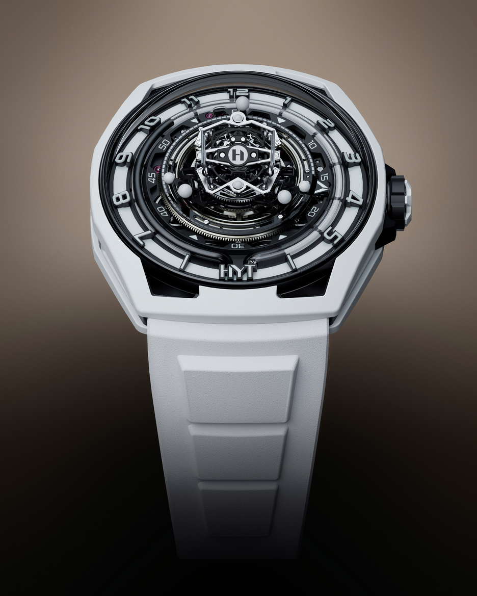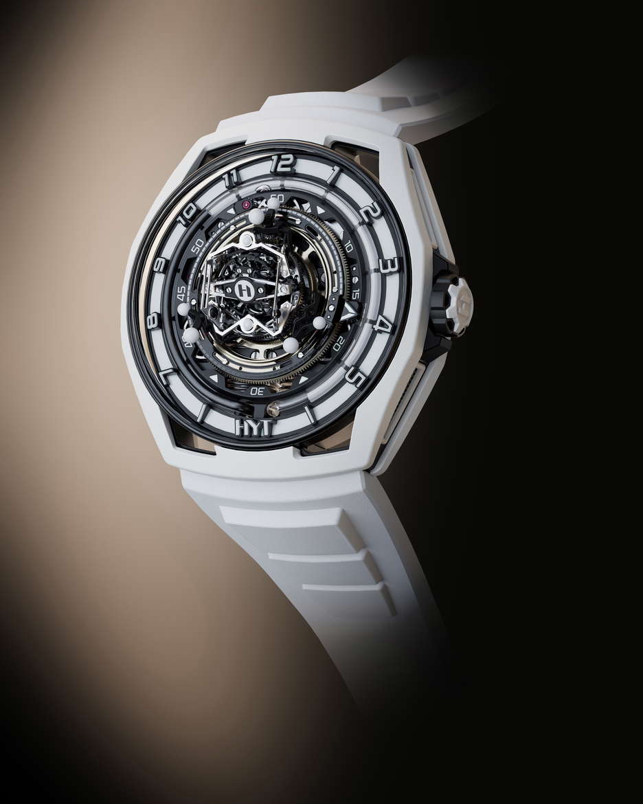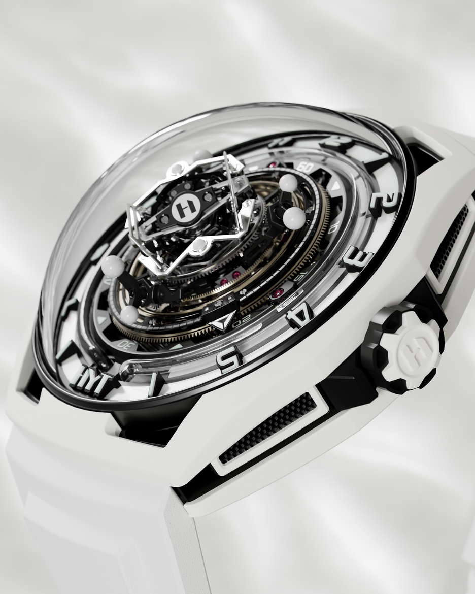 The HYT Conical Tourbillon Panda combines mechanical precision with the elegance of white agate. HYT, known for its fluidic watchmaking technology, shows its expertise through this timepiece, which features a fluidic hour display and a conical tourbillon with handcrafted spheres of natural white agate. The watch is powered by the 701 TC caliber, with its balance wheel inclined at 30 degrees, the escapement wheel at 15 degrees, and the anchor at 23 degrees. The tourbillon completes a full revolution in 30 seconds, highlighting its intricate mechanics. The dial’s detailed design, including a white agate chapter ring and the interplay of black and white, emphasizes craftsmanship. The rotating spheres of different sizes add a mesmerizing visual element. The movement alone has 553 components, with the tourbillon cage featuring 159 components The entire assembly totals 750 pieces. The watch has a 48mm titanium case coated in white ceramic and a dome-shaped crystal with anti-reflective treatment. Inspired by German watchmaker Walter Prendel, the HYT Conical Tourbillon Panda focuses on balance and precision, with rotating spheres reflecting the rhythmic motion of the tourbillon. Limited to only 8 pieces.