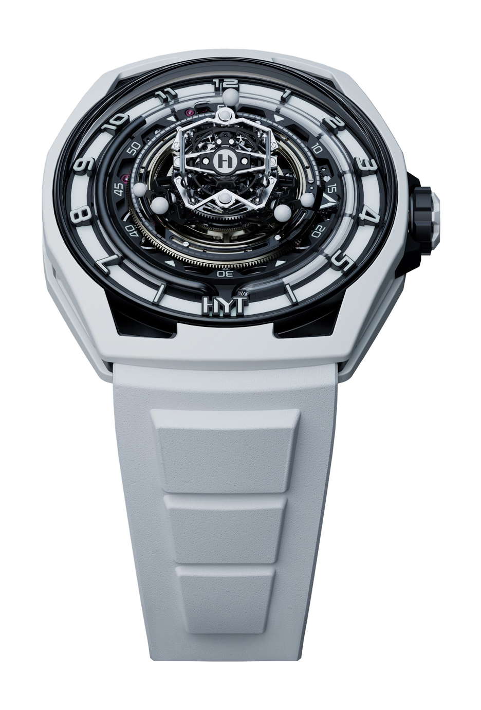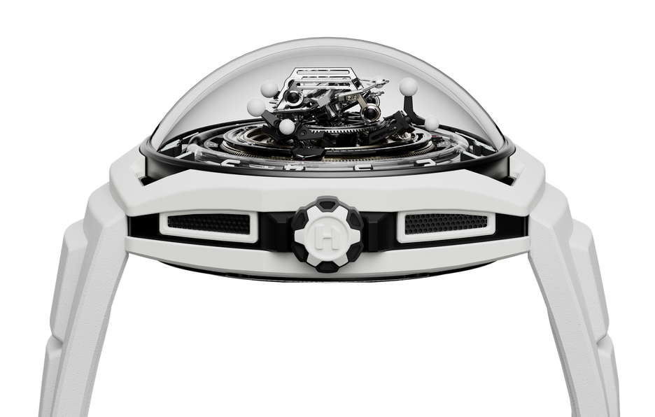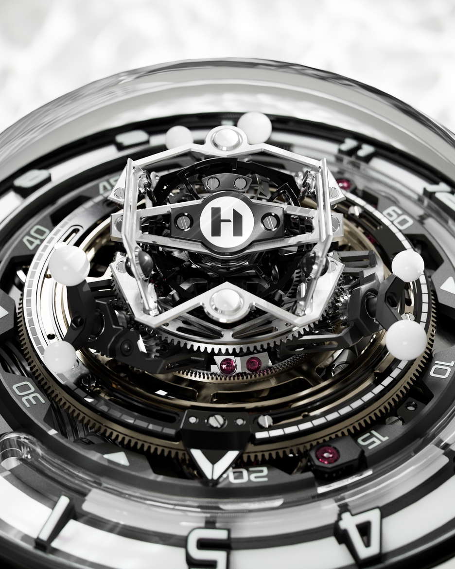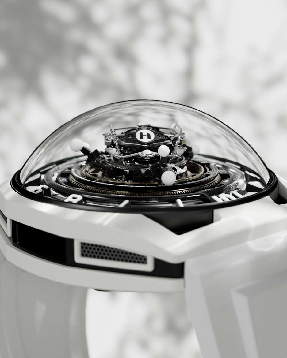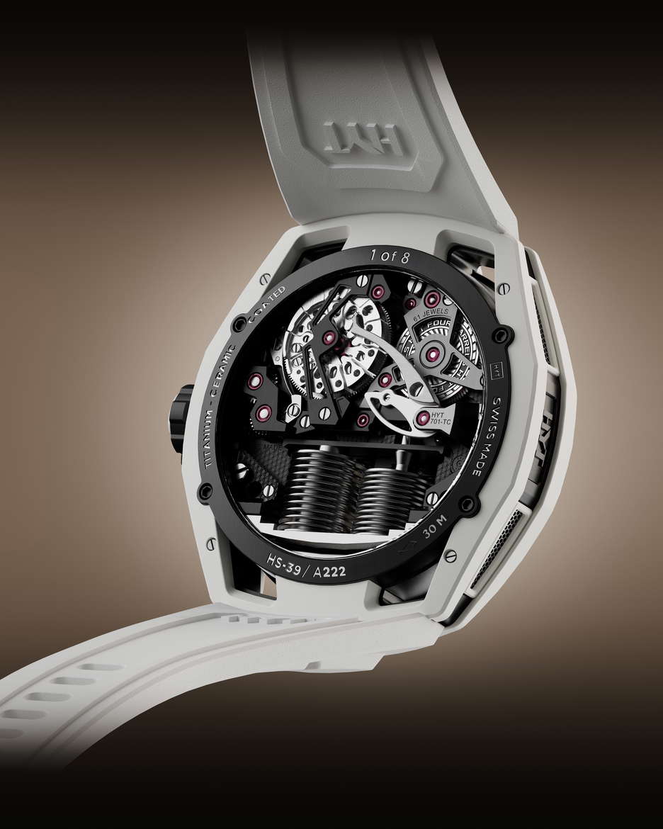 The HYT Conical Tourbillon Panda combines mechanical precision with the elegance of white agate. HYT, known for its fluidic watchmaking technology, shows its expertise through this timepiece, which features a fluidic hour display and a conical tourbillon with handcrafted spheres of natural white agate. The watch is powered by the 701 TC caliber, with its balance wheel inclined at 30 degrees, the escapement wheel at 15 degrees, and the anchor at 23 degrees. The tourbillon completes a full revolution in 30 seconds, highlighting its intricate mechanics. The dial’s detailed design, including a white agate chapter ring and the interplay of black and white, emphasizes craftsmanship. The rotating spheres of different sizes add a mesmerizing visual element. The movement alone has 553 components, with the tourbillon cage featuring 159 components The entire assembly totals 750 pieces. The watch has a 48mm titanium case coated in white ceramic and a dome-shaped crystal with anti-reflective treatment. Inspired by German watchmaker Walter Prendel, the HYT Conical Tourbillon Panda focuses on balance and precision, with rotating spheres reflecting the rhythmic motion of the tourbillon. Limited to only 8 pieces.