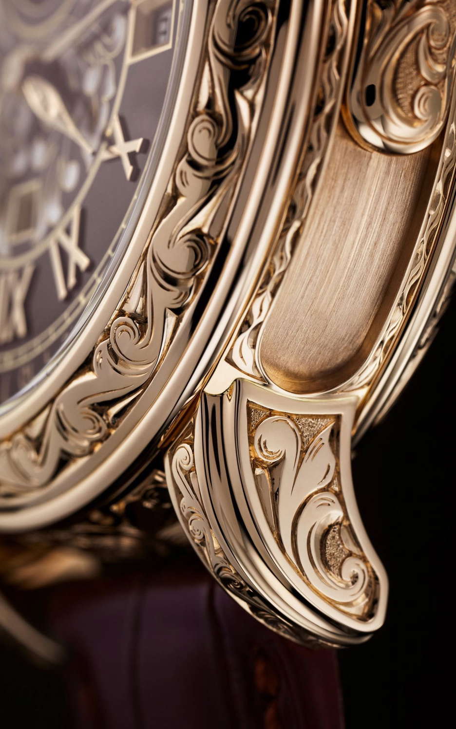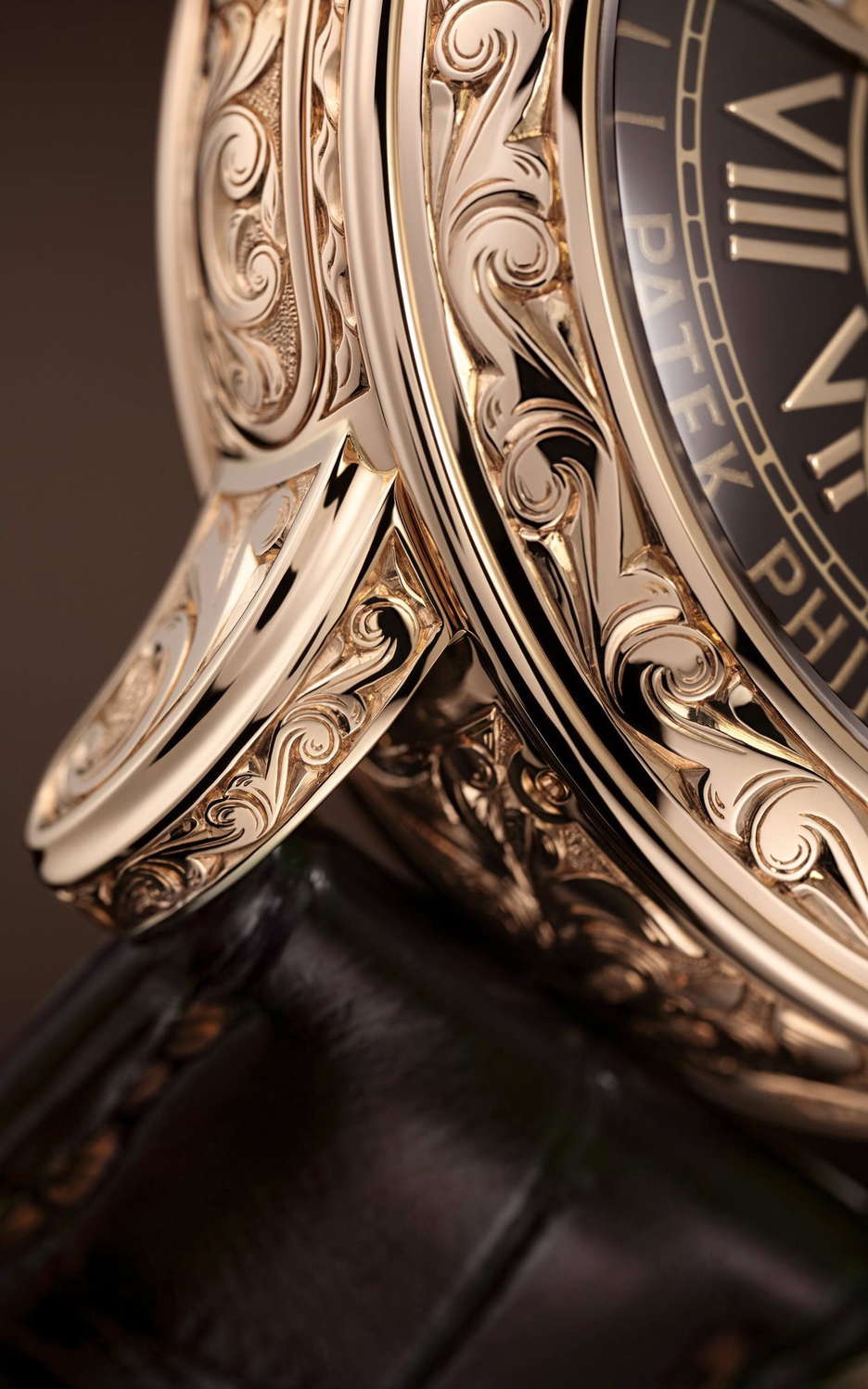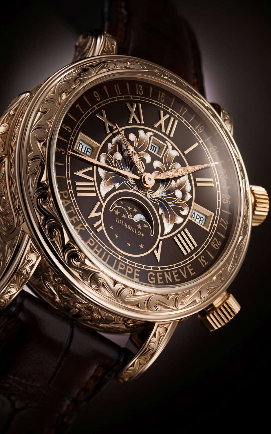Patek Philippe has refreshed the appearance of the Reference 6002 Sky Moon Tourbillon by blending the rich radiance of rose gold with exquisite Grand Feu brown enamel embellishments. Every detail, from the dual-sided case to the crowns, slide piece, hour/minute hands, and fold-over clasp, is meticulously hand-engraved with intricate volutes and arabesques. The front dial showcases a harmonious fusion of Grand Feu champlevé and cloisonné enameling techniques. This extraordinary timepiece, ranking as the second most intricate Patek Philippe wristwatch with 12 distinct complications, is accompanied by a set of matching cufflinks.