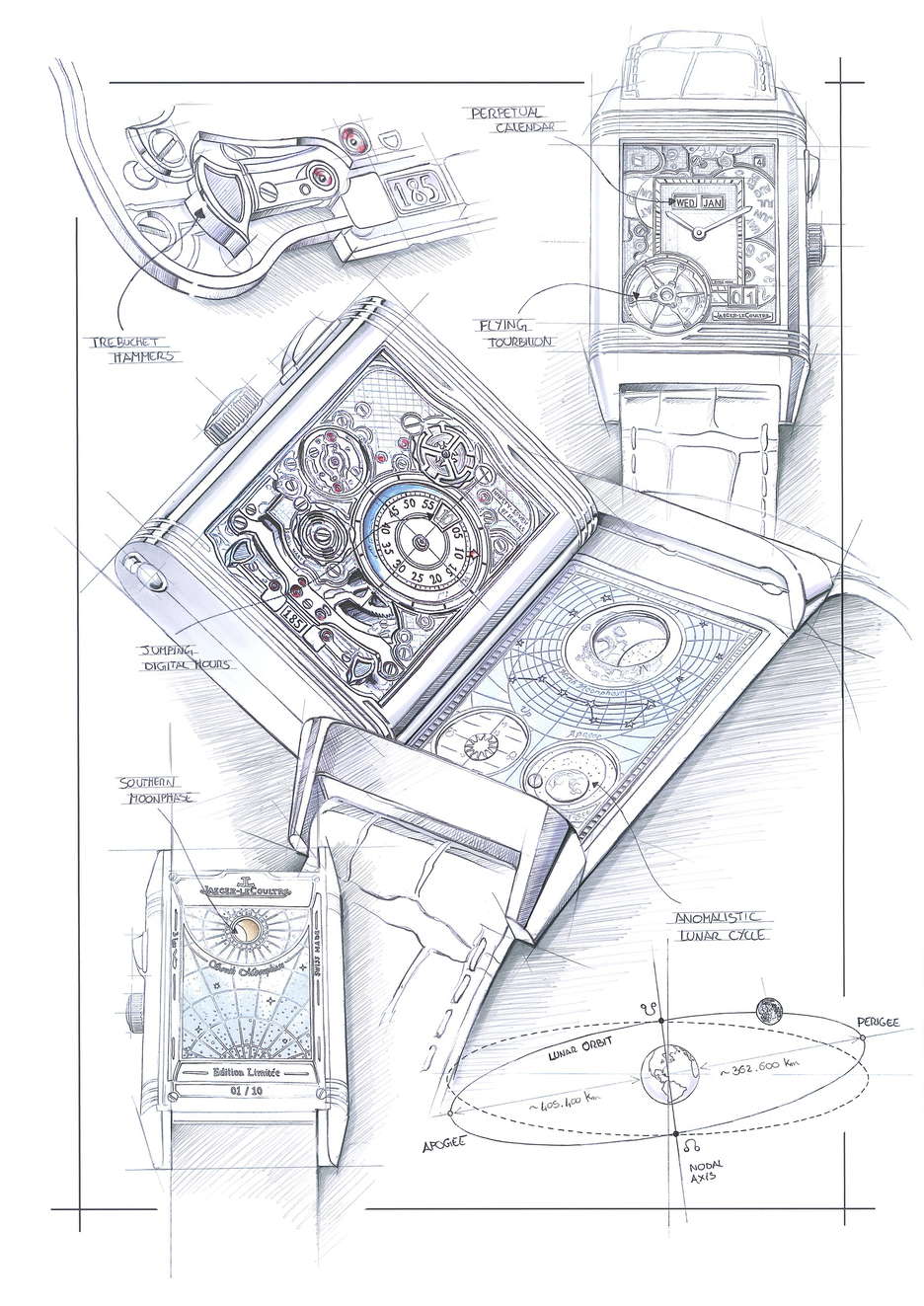 Functions:date,day,hours,minutes,month,moon phase,perpetual calendar,tourbillon