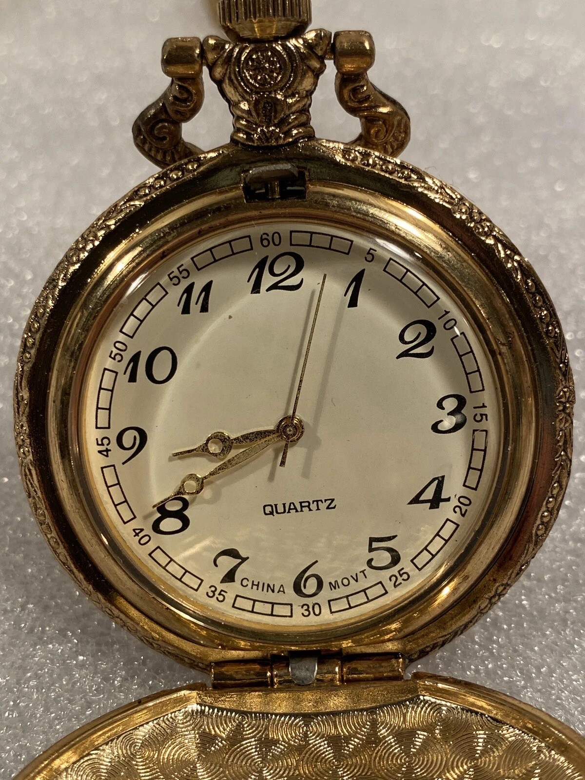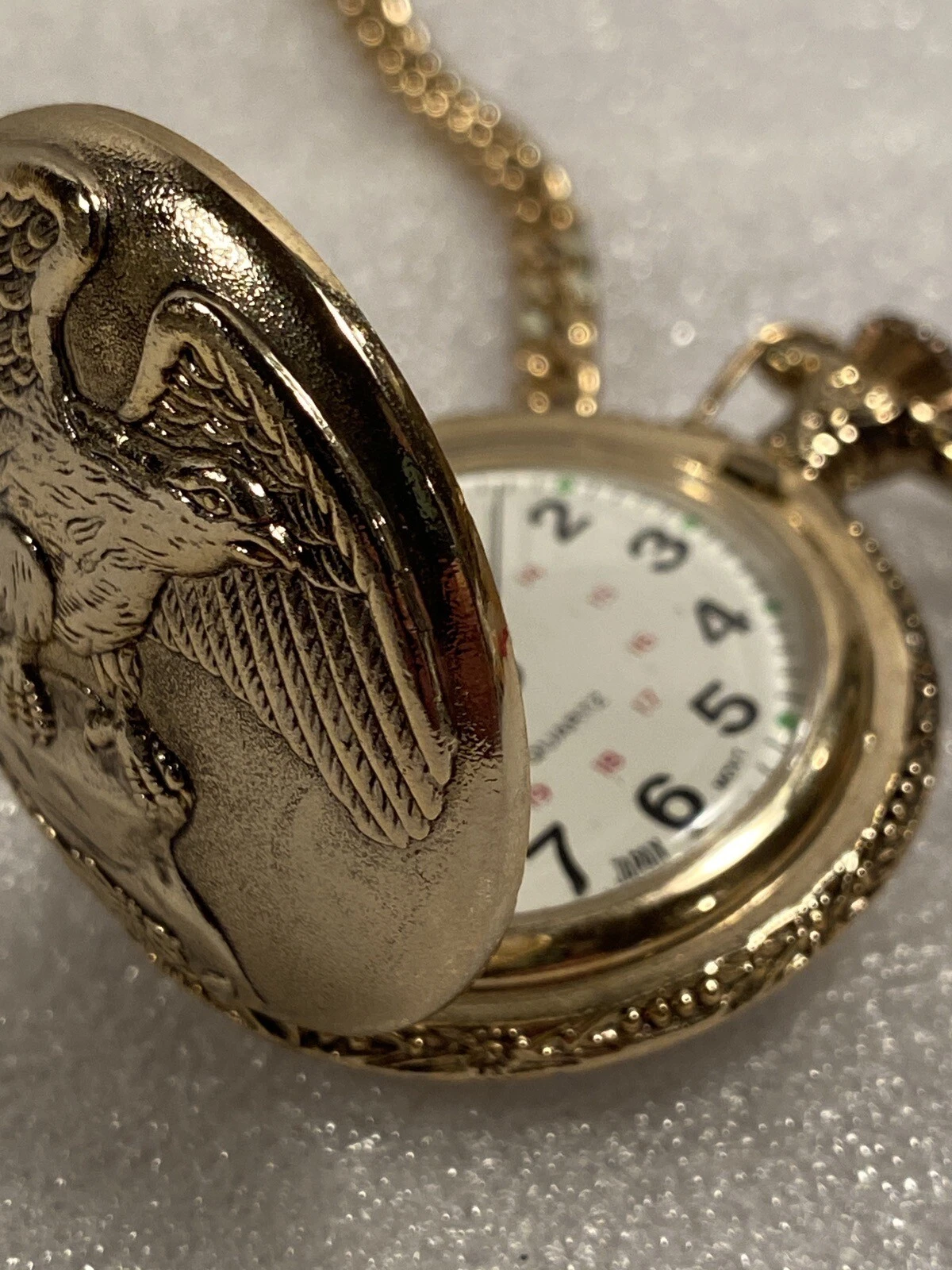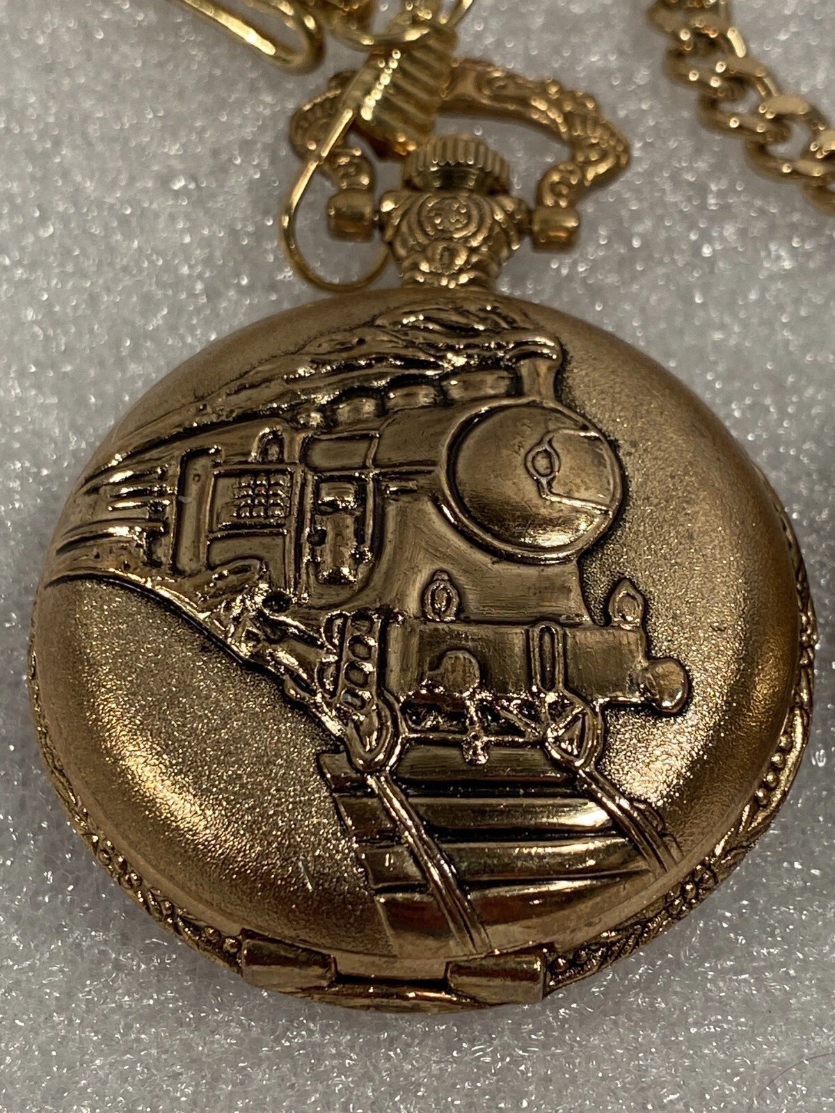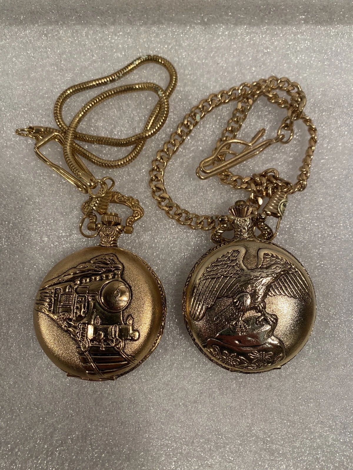 (2) Pocket Watches- Capezio Quartz (Golden Eagle) & Train Gold Tone. Chains.