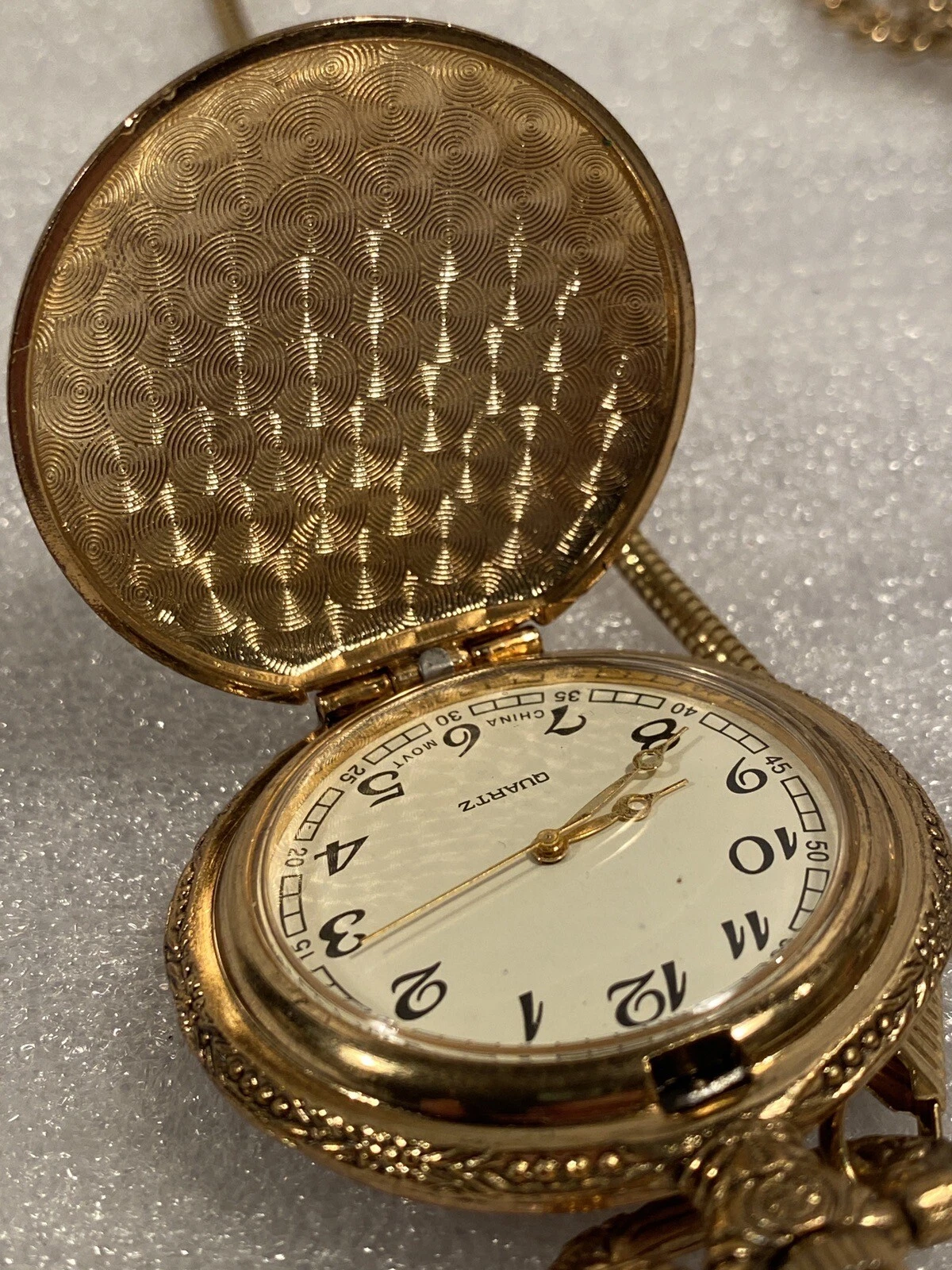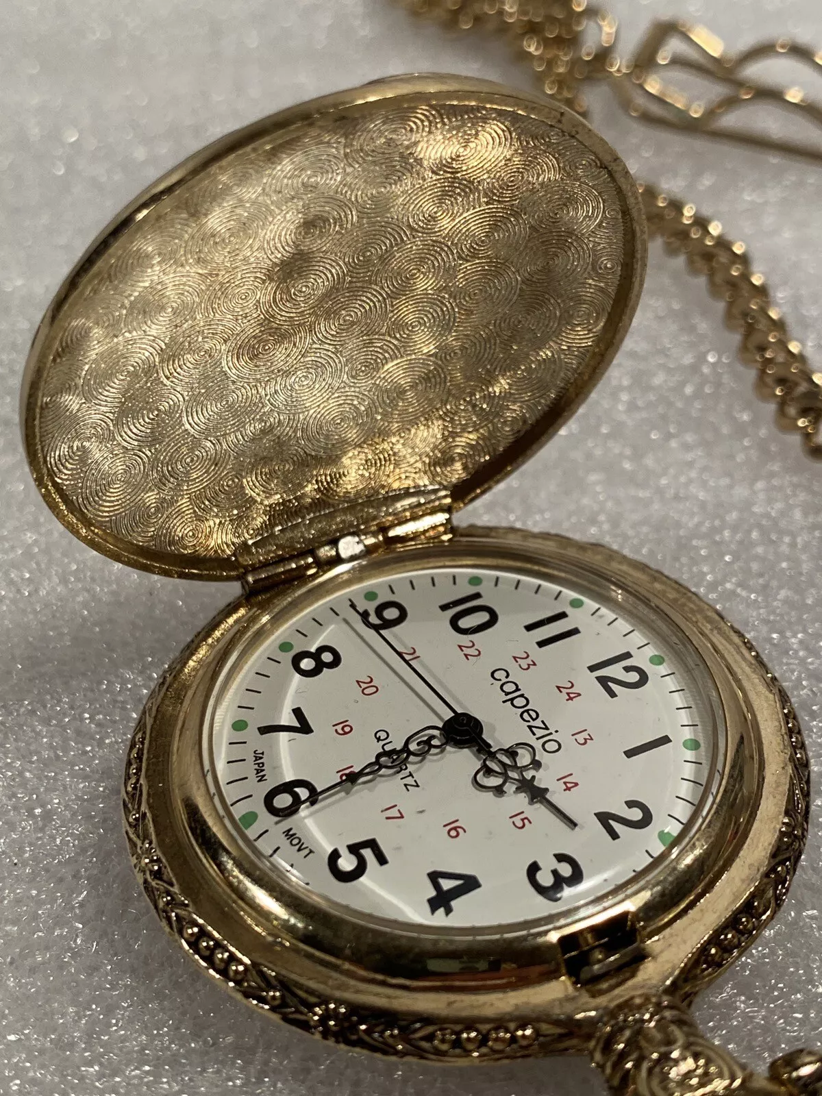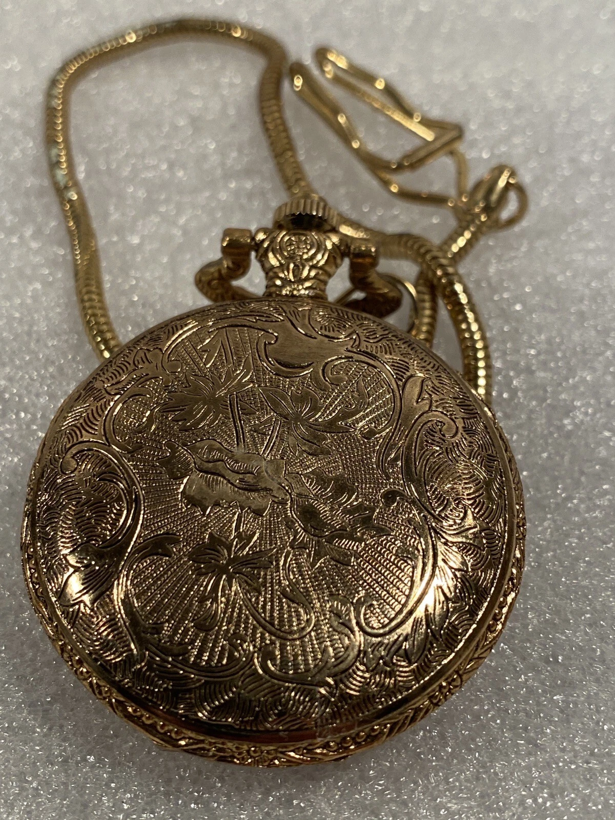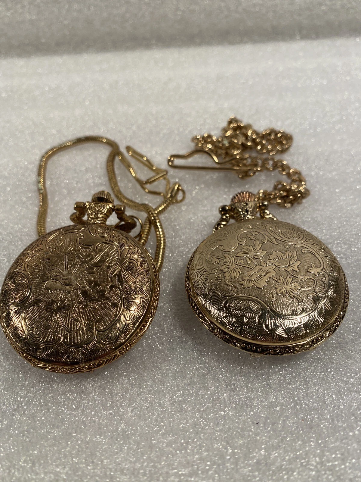 (2) Pocket Watches- Capezio Quartz (Golden Eagle) & Train Gold Tone. Chains.