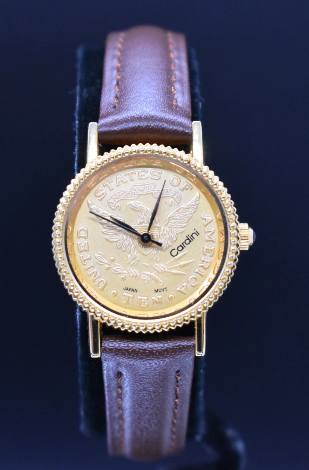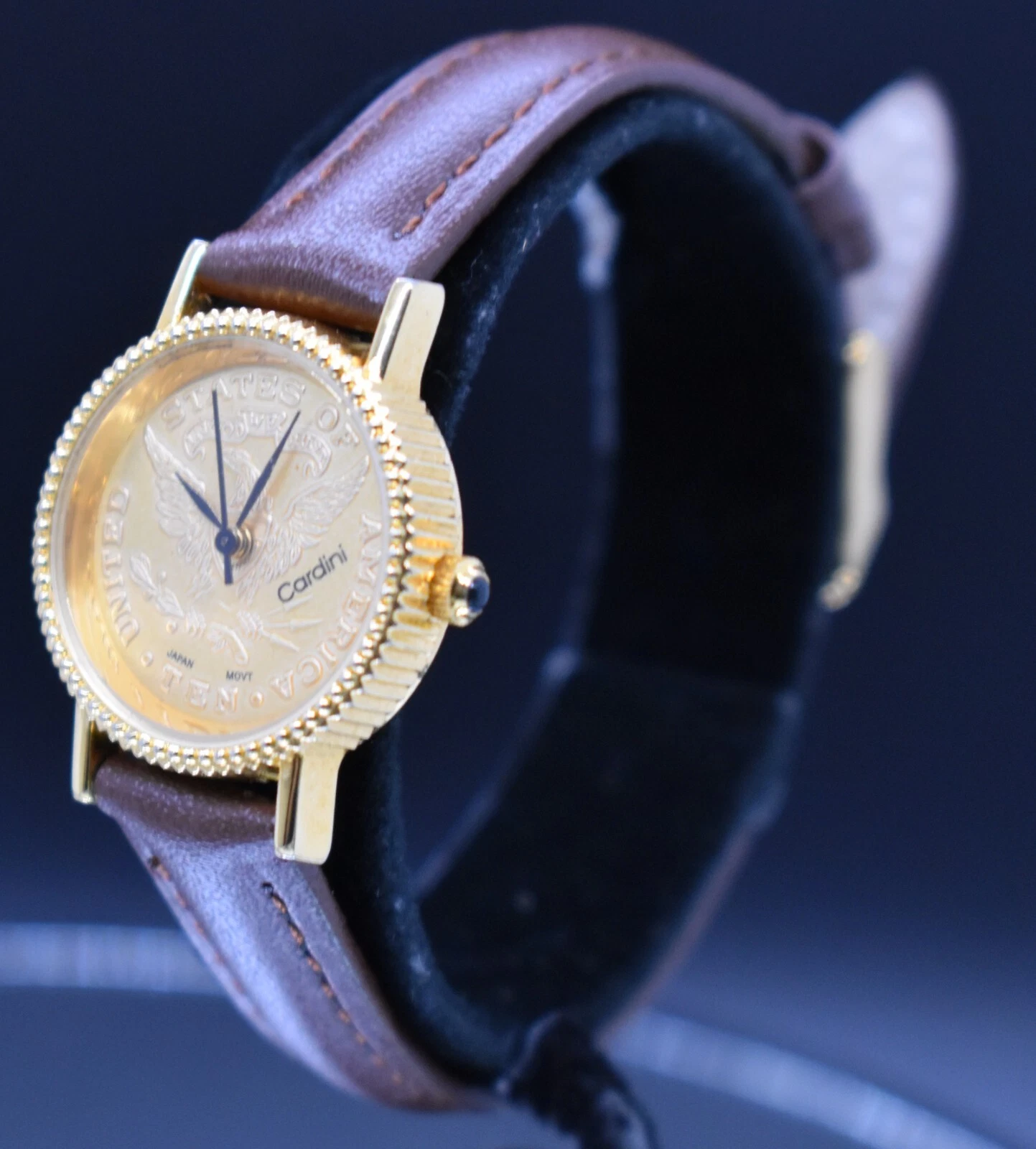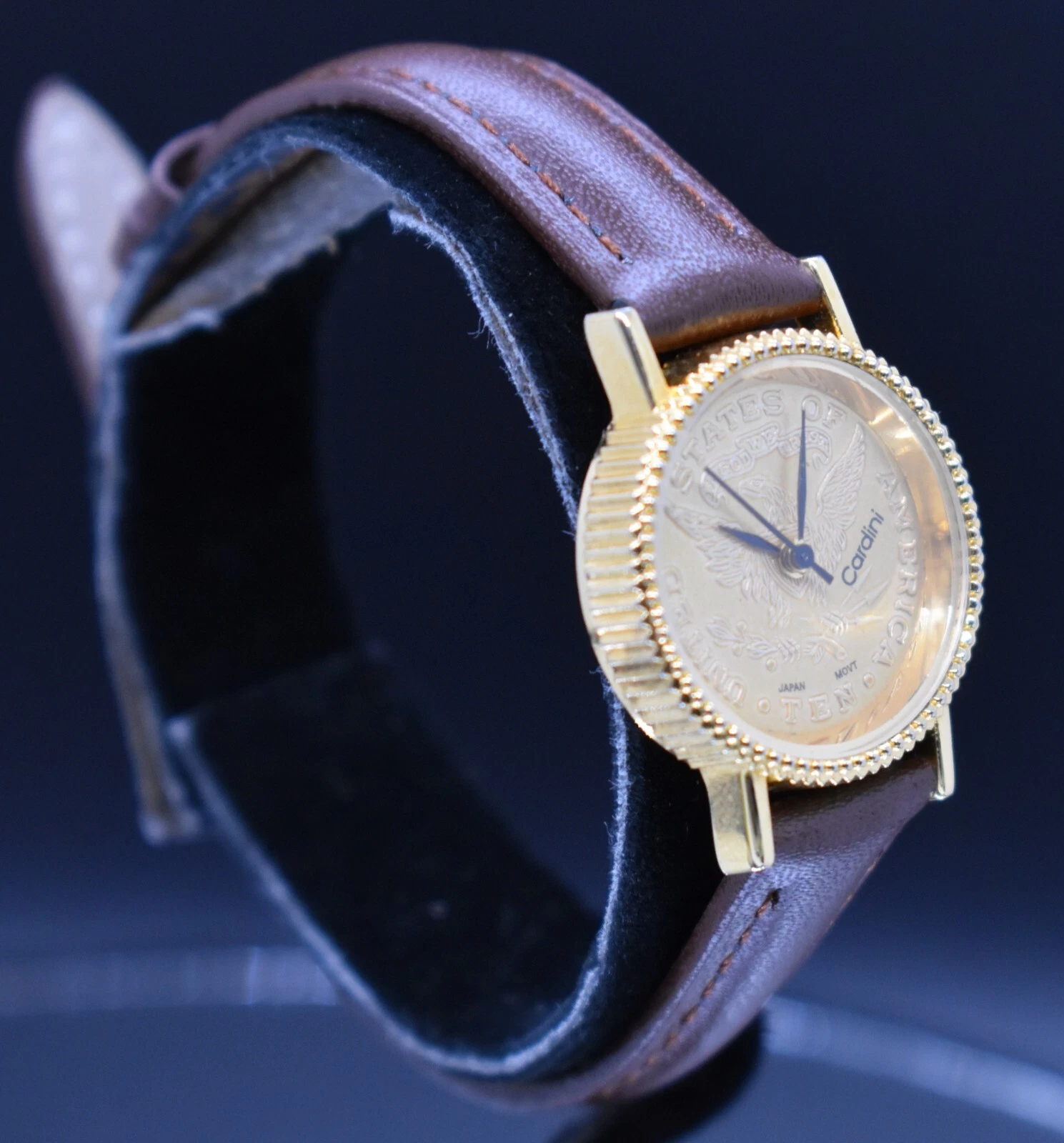 Vtg CARDINI COIN Watch Women Gold Tone Dial US TEN Leather NEW BATTERY & BAND