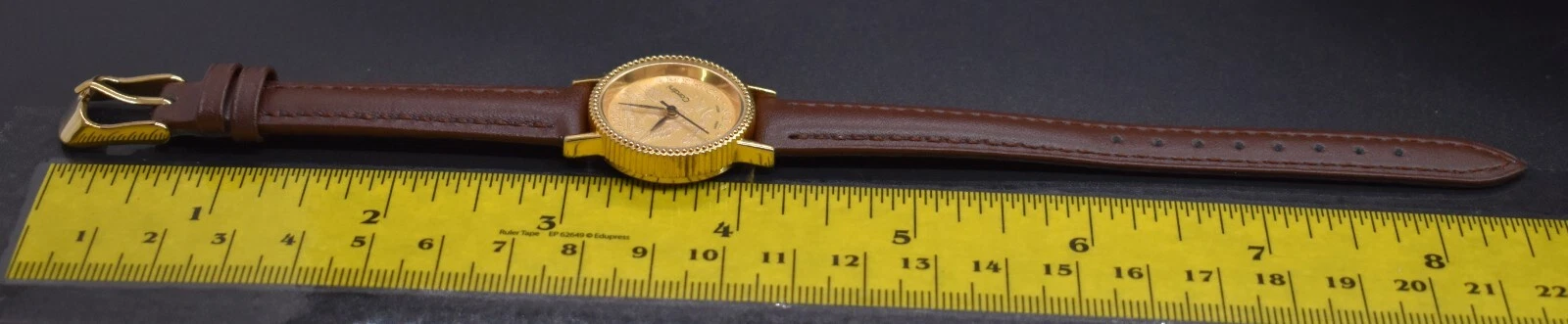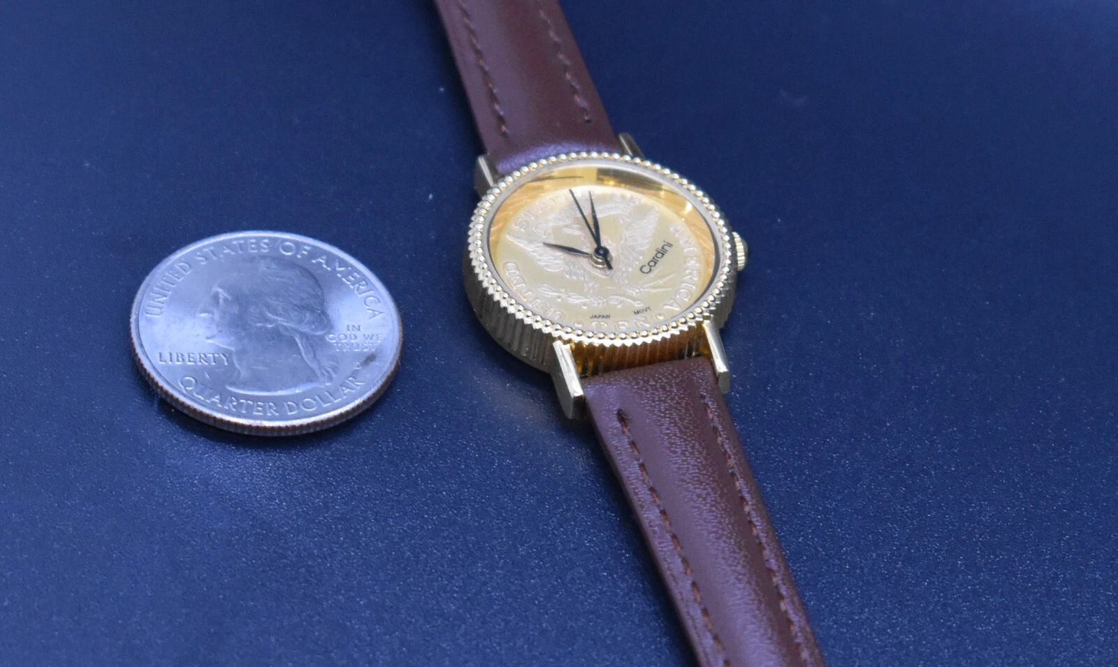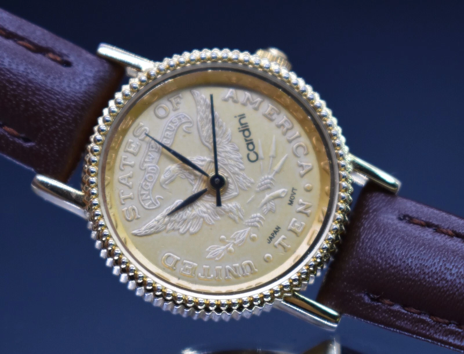 Vtg CARDINI COIN Watch Women Gold Tone Dial US TEN Leather NEW BATTERY & BAND