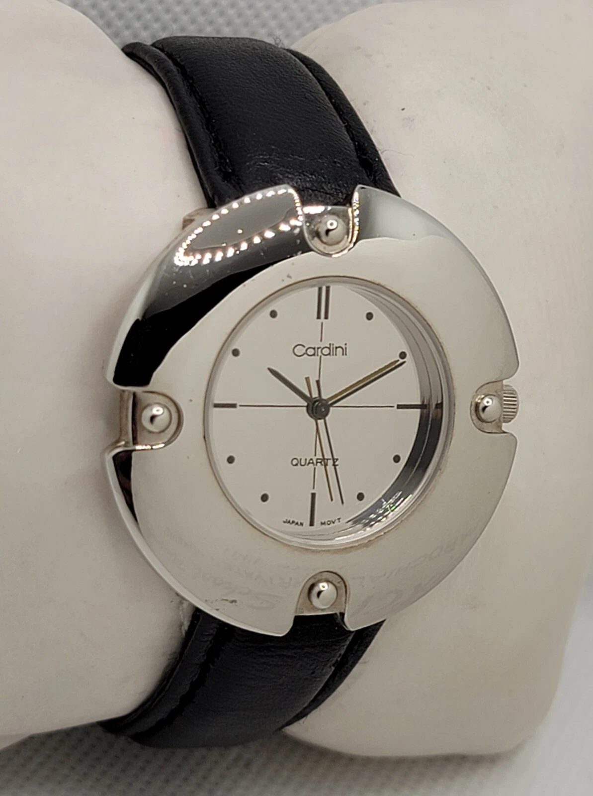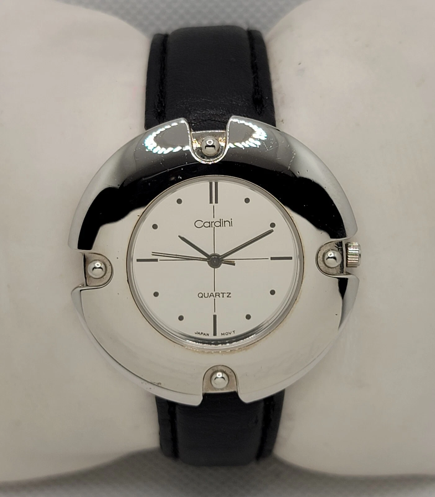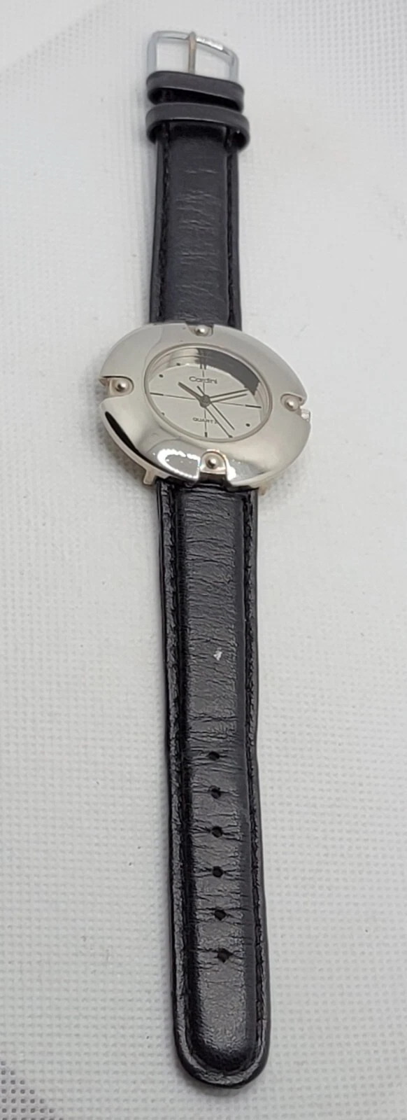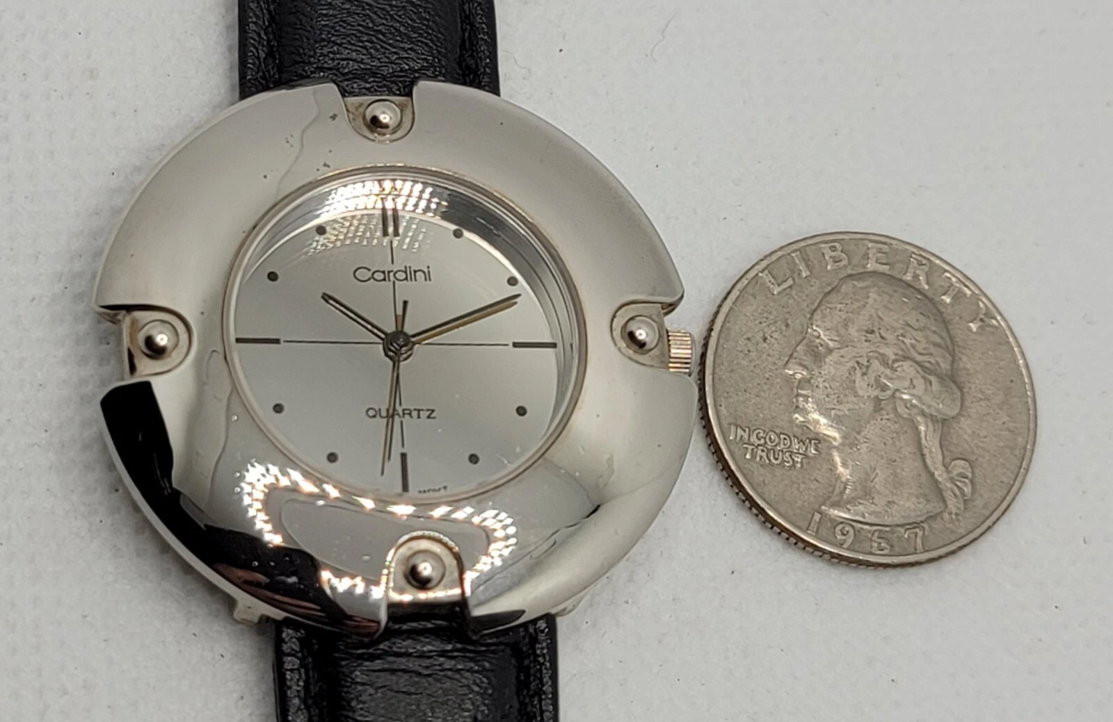 Ladies Cardini Elegant Silve Tone Case Mirror Dial Black Leather Watch J3
