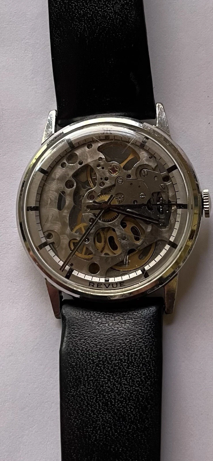 Unique 1970’s Swiss Revue 17 Jewel Skeleton Watch Clear Front And Back Unusual