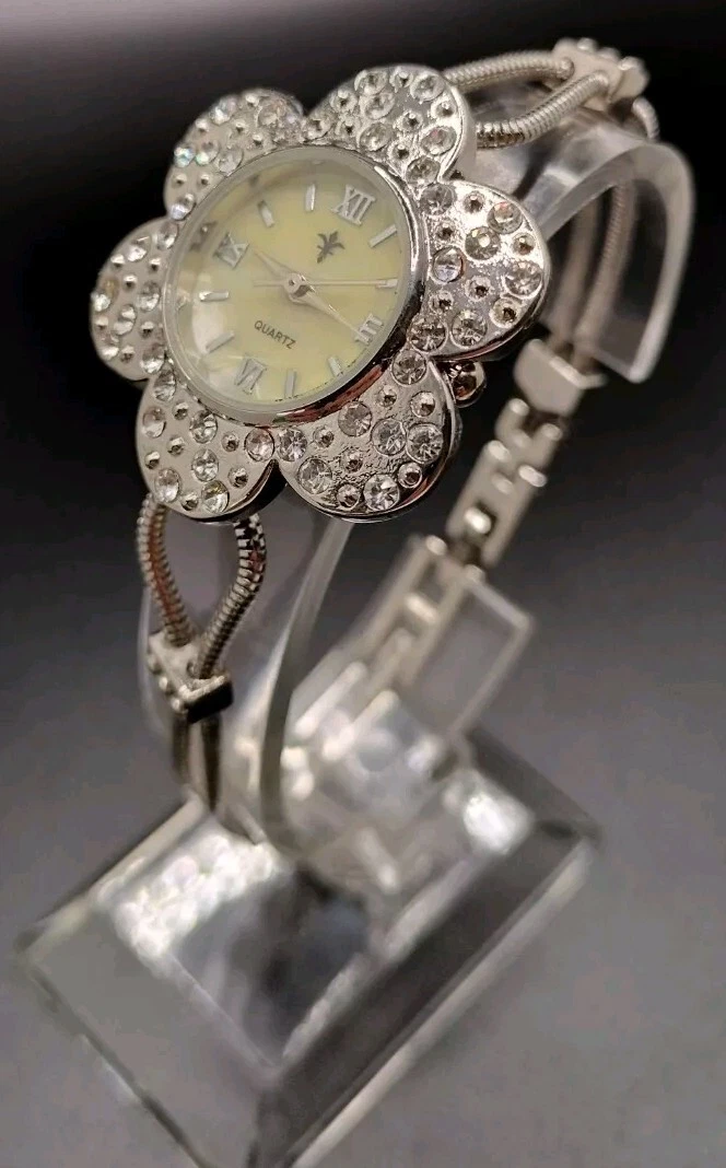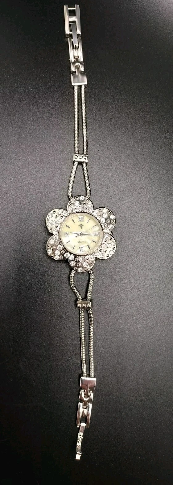 Cato Womens Watch Flower Floral w/ Rhinestones Silver Tone, needs battery/repair