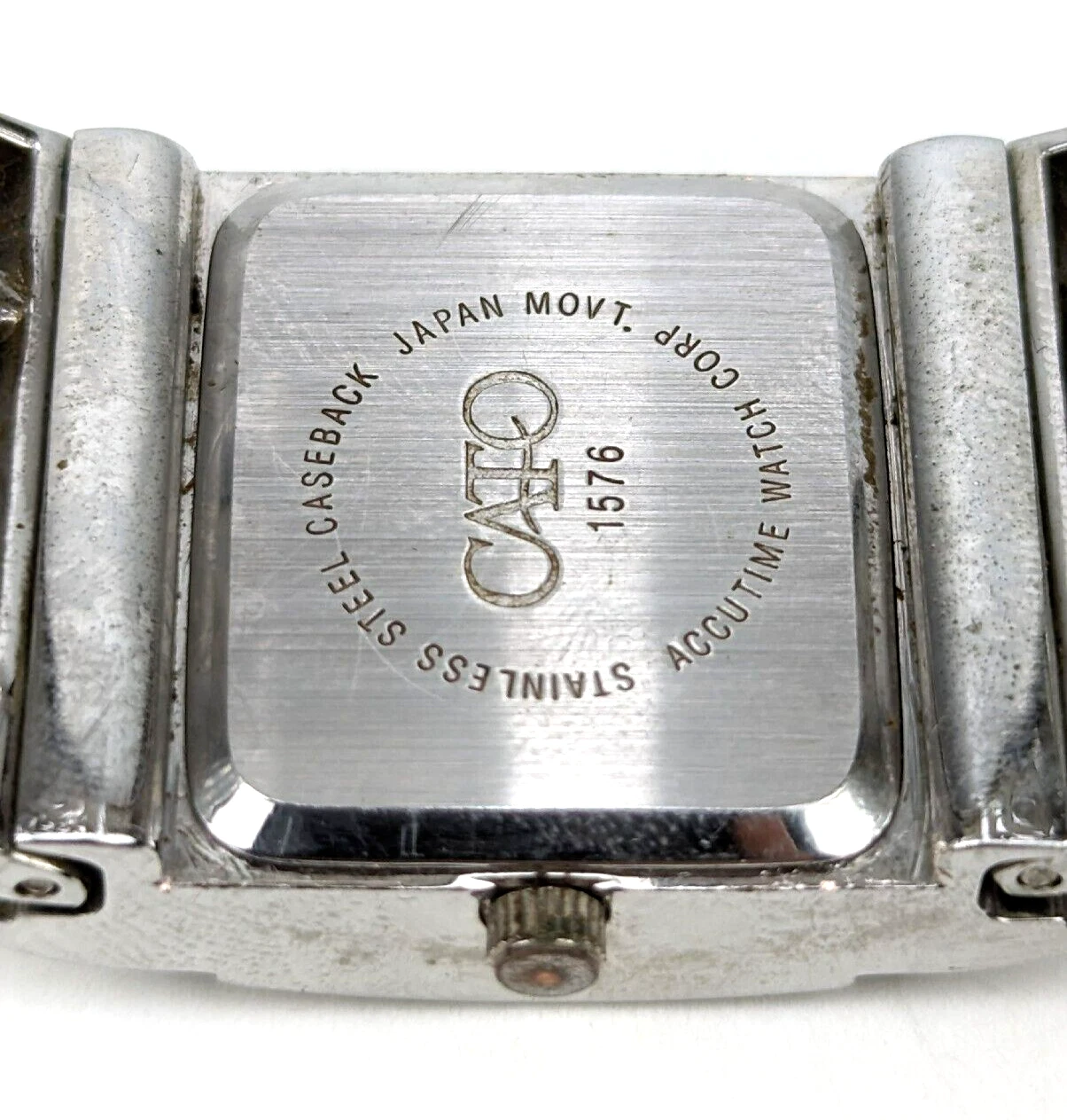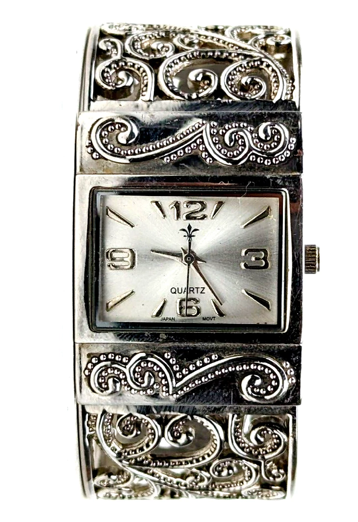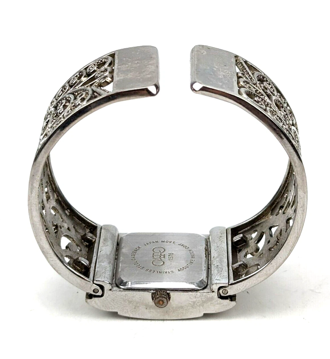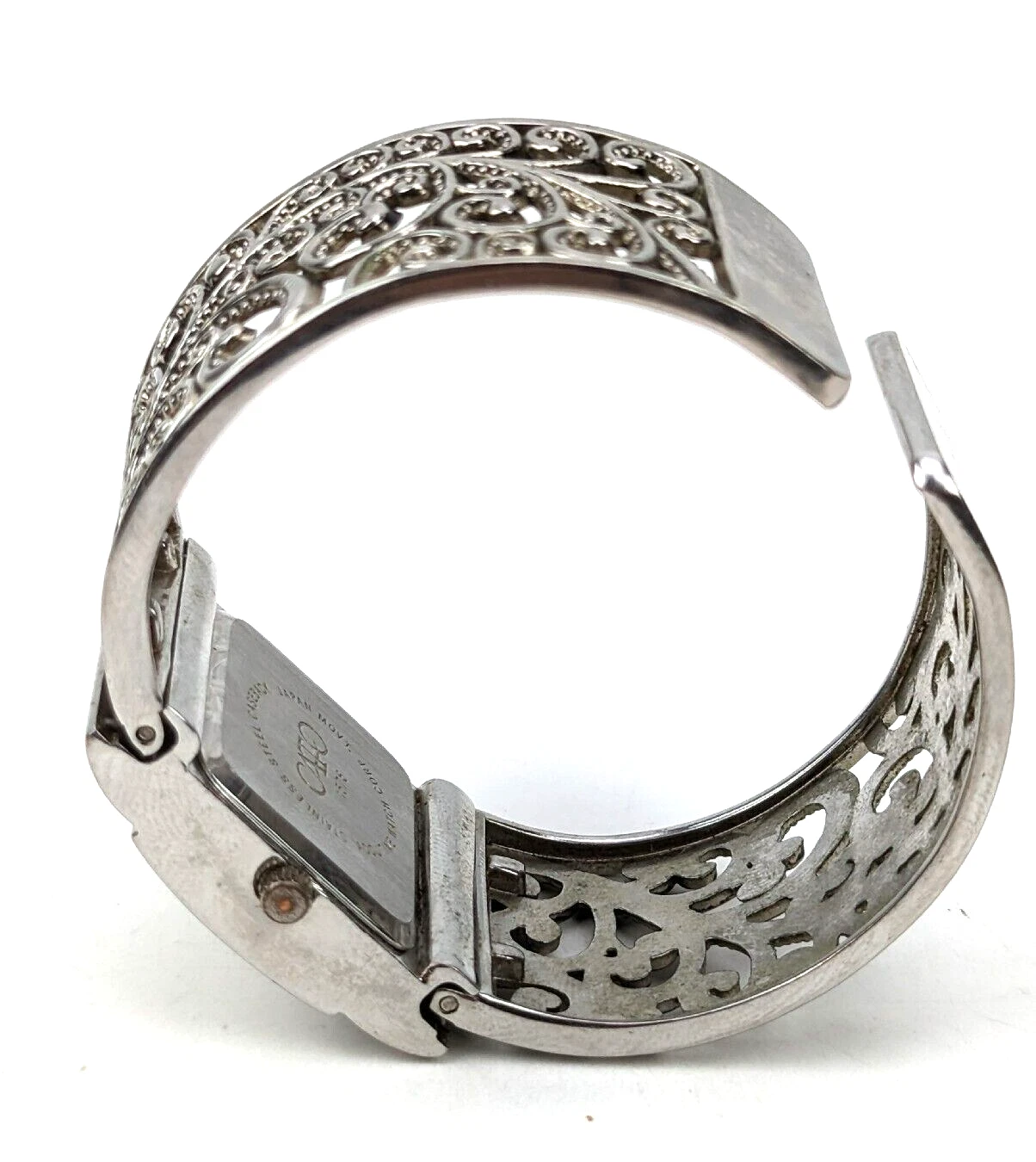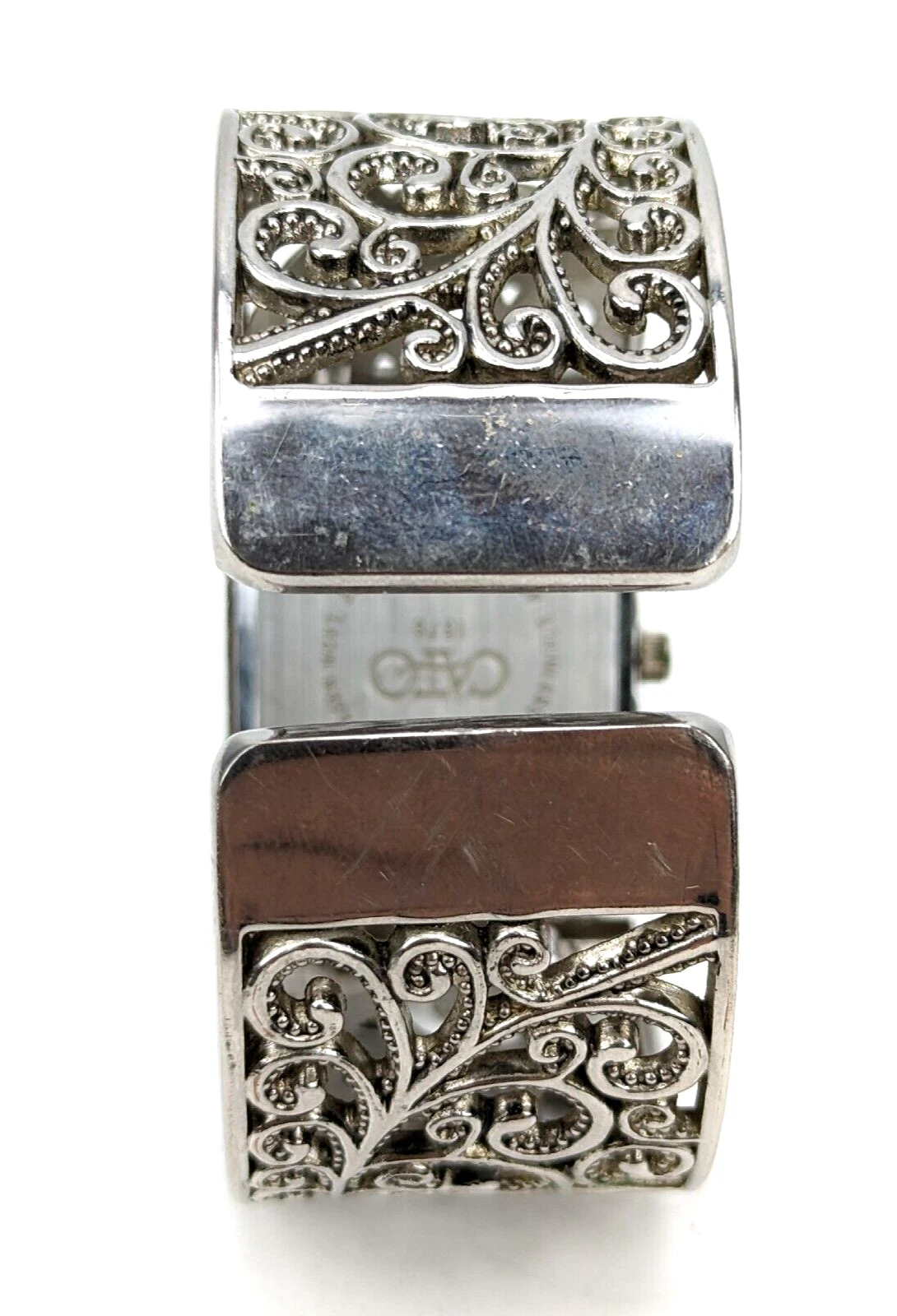 Vintage CATO Accutime Quartz Watch Silver Tone Filigree Open Bangle Band #B4