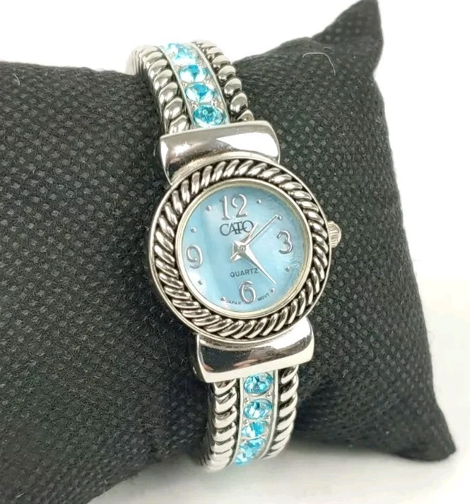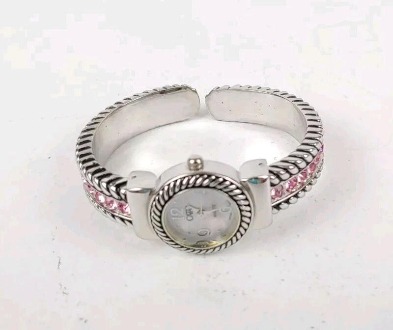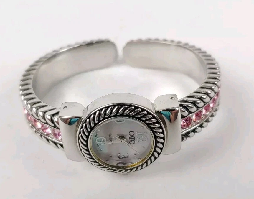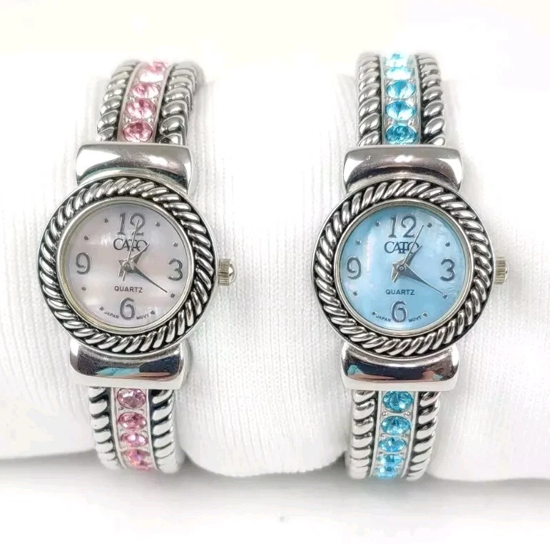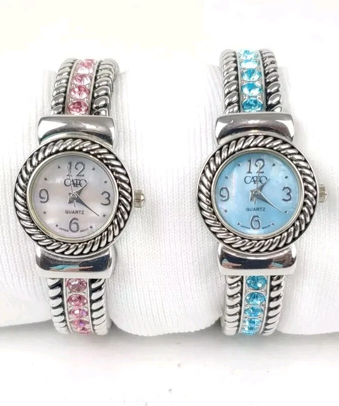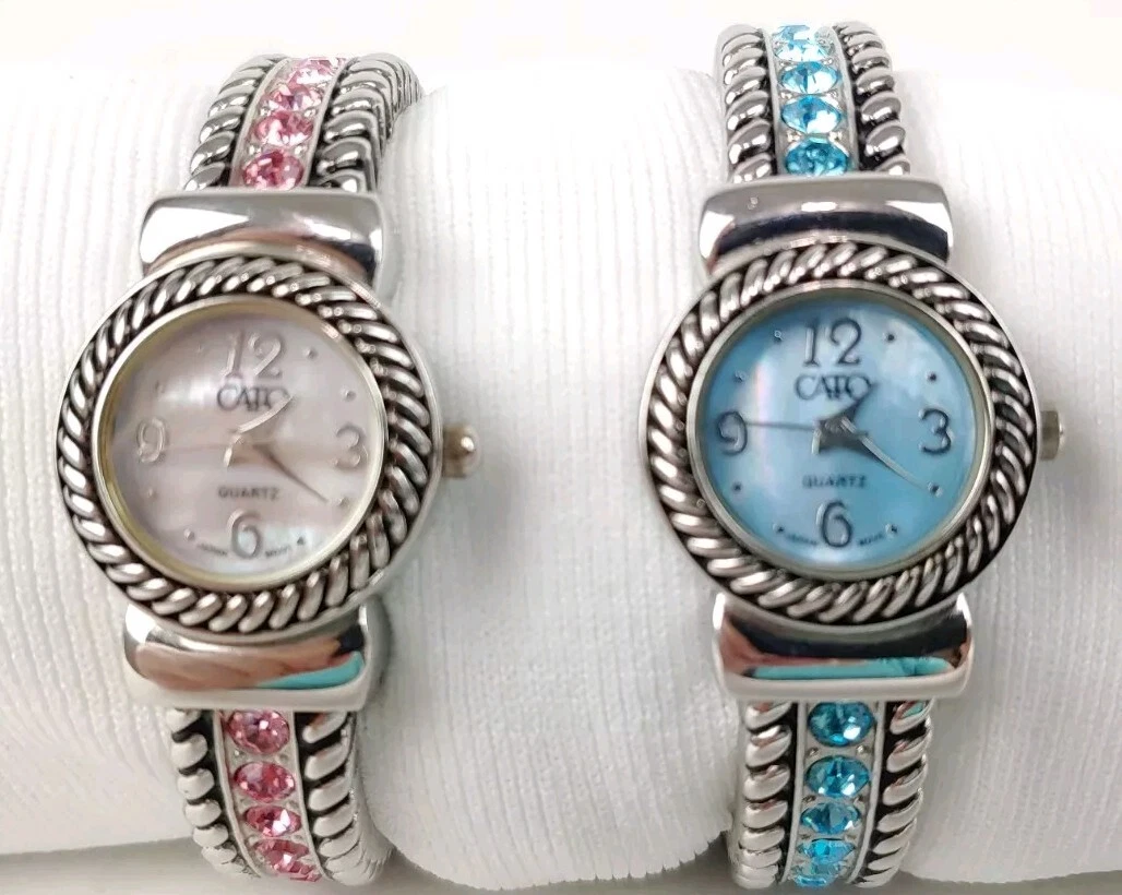 Pair of Cato Cuff Bracelet Watches MOP Faces Rhinestone Bands Silver Tone
