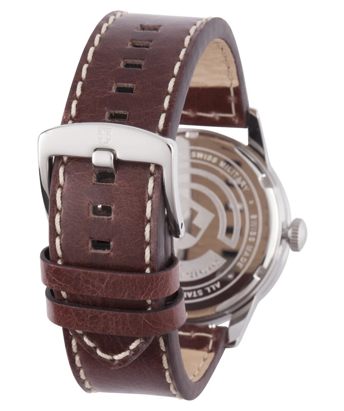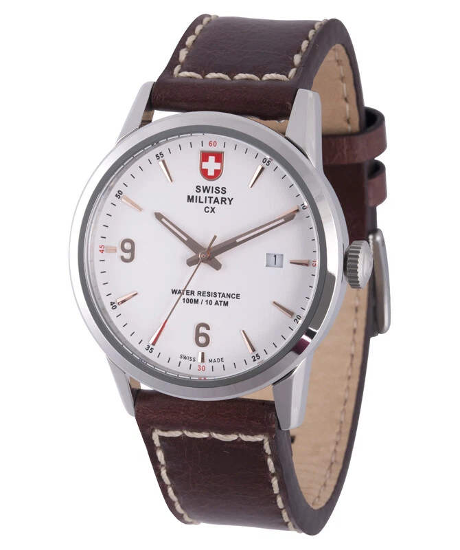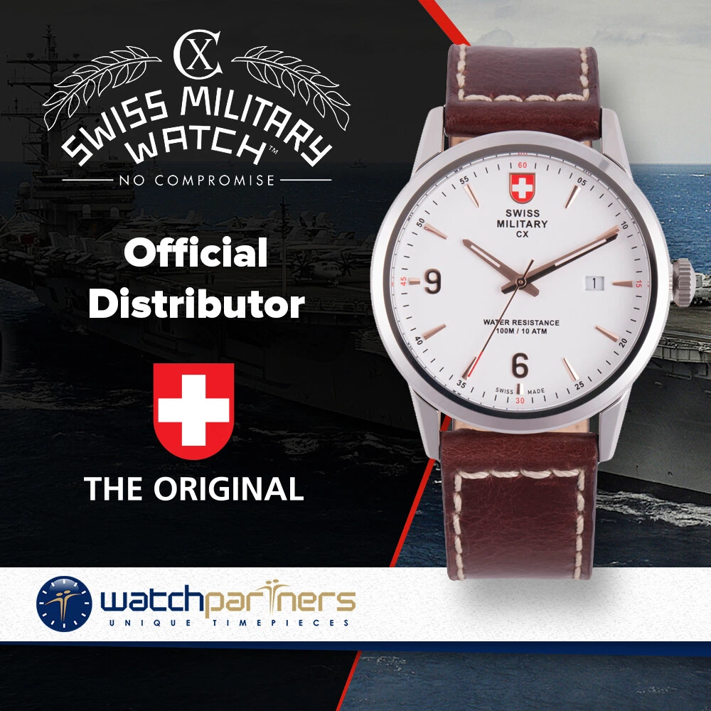 CX Swiss Military GRUNT Officer Watch Swiss Quartz Brown Strap White Dial 2892