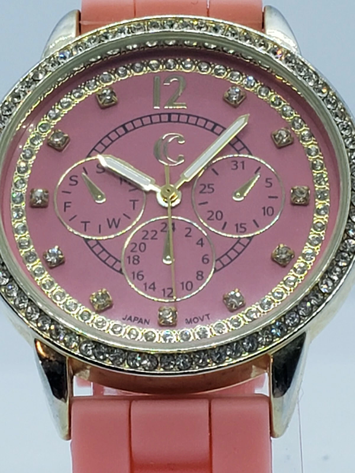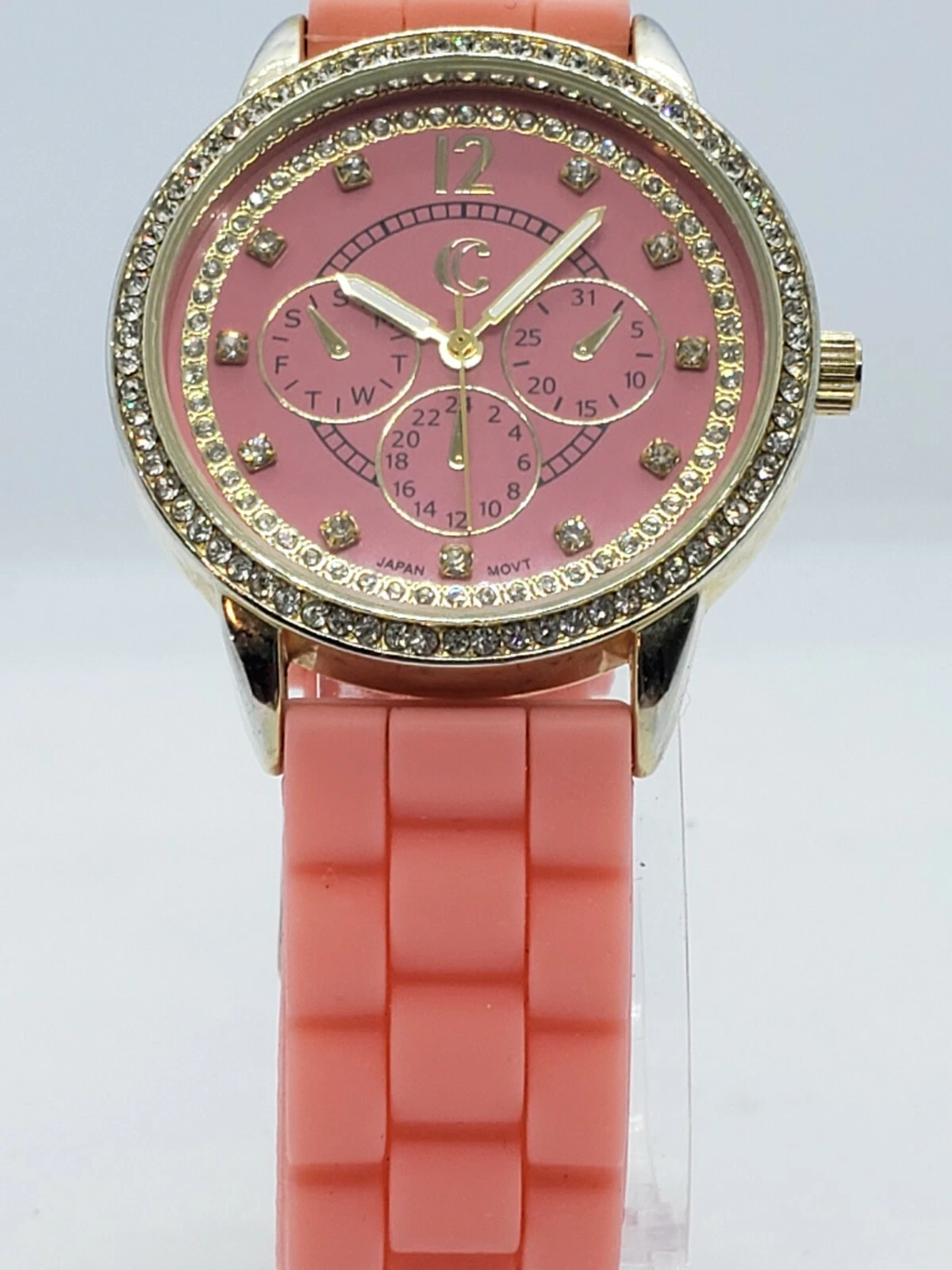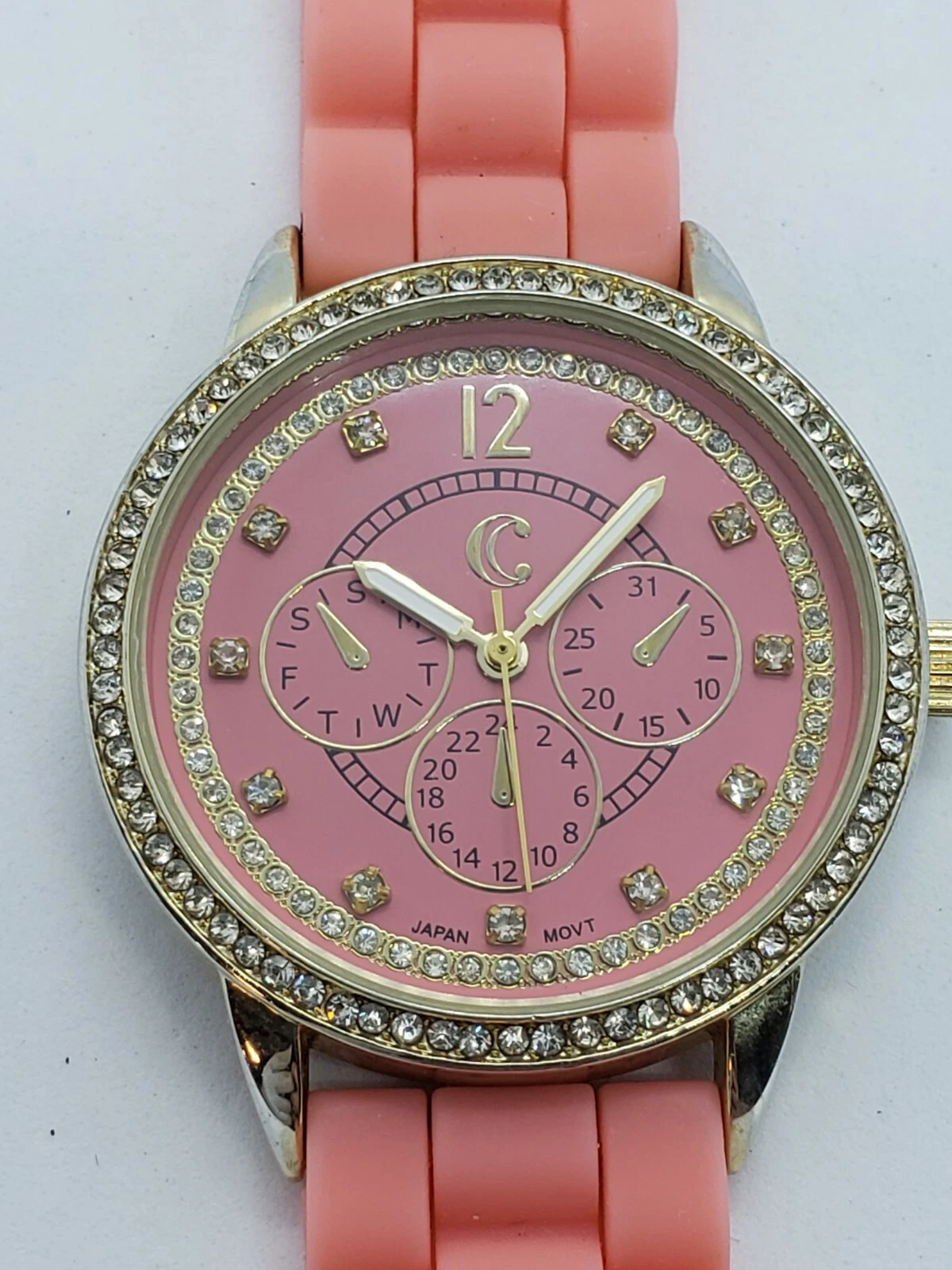 Charming Charlie Women's Pink Silicon Band 38mm Rhinestones Watch Needs BATTERY