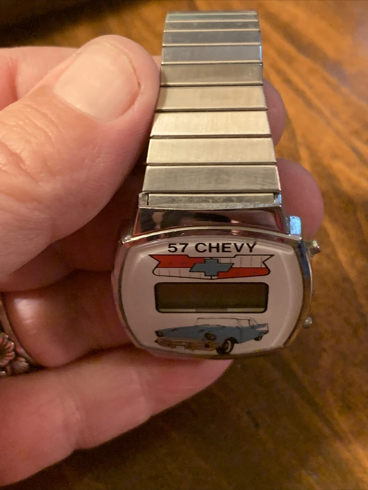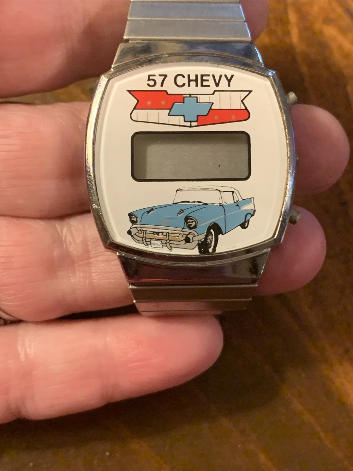 Vintage 57 Chevy LCD Wristwatch Blue Car Silver Watch Chevrolet Bowtie Emblem