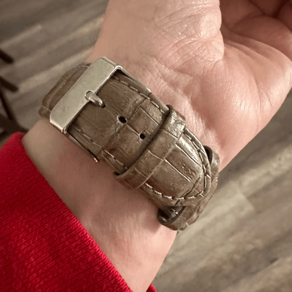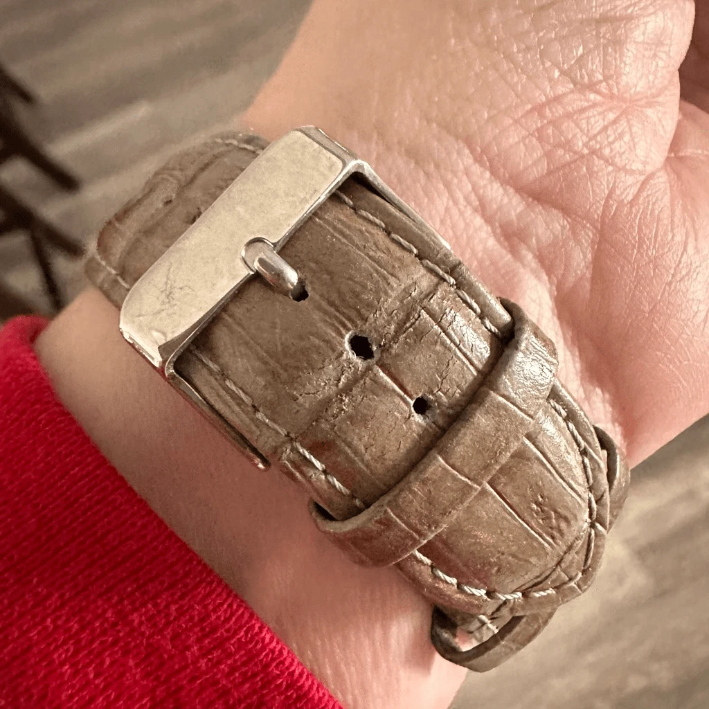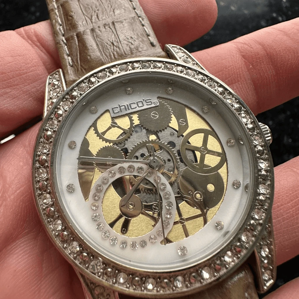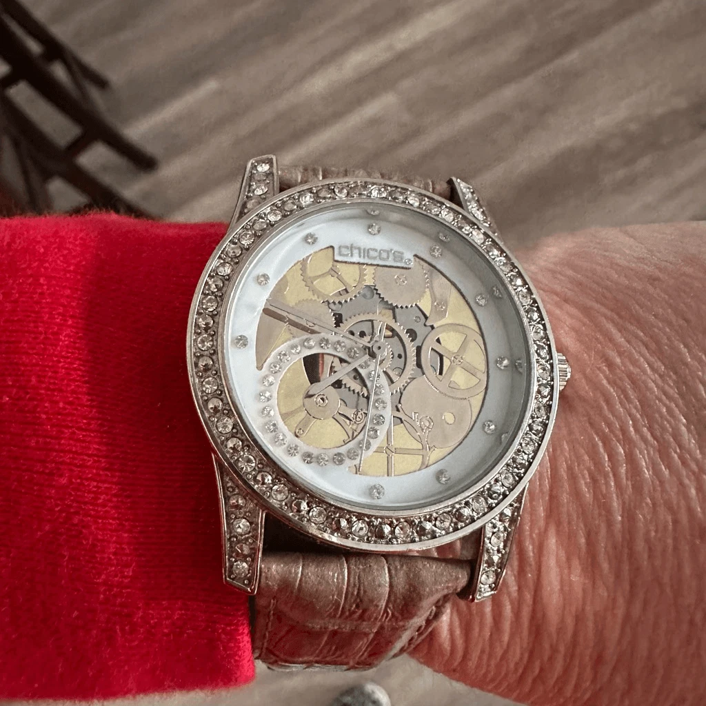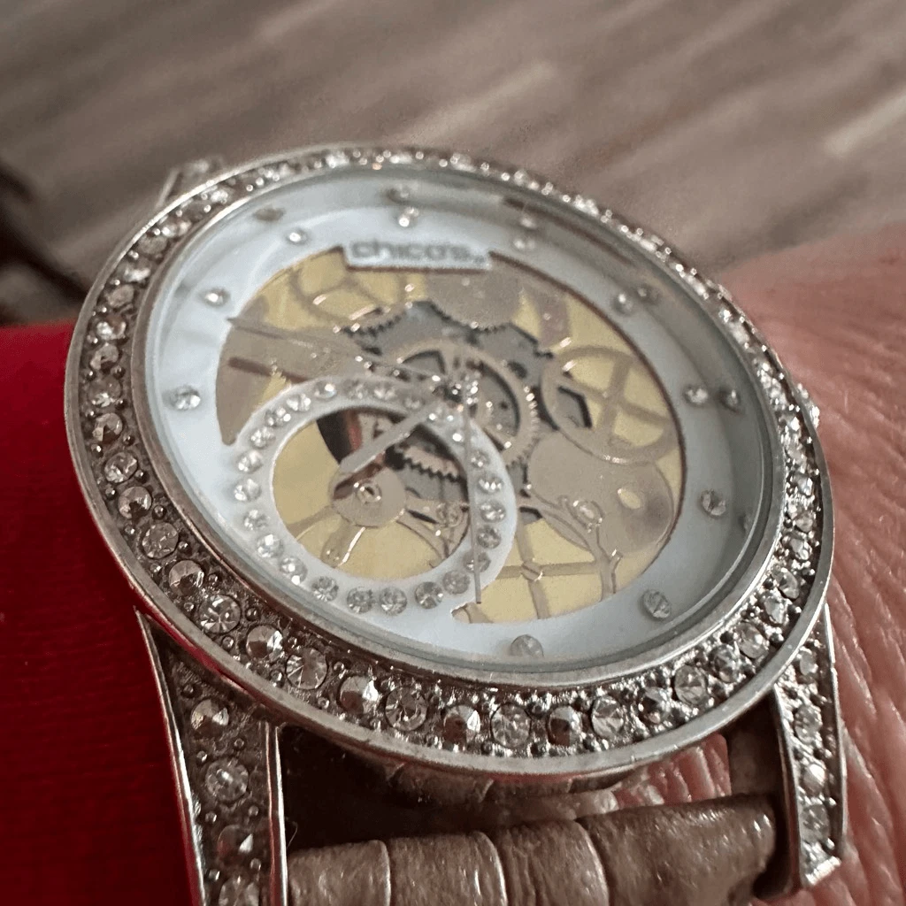 Chico’s Large Face Embossed Genuine Leather Band Rhinestone Watch Silvertone