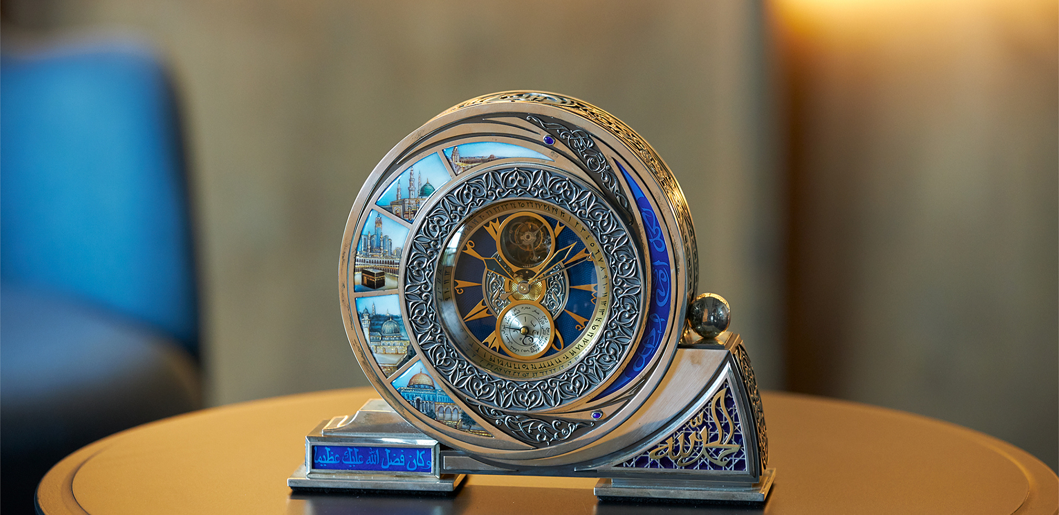 The main function of the Lunar Hijra clock is the Islamic lunar calendar Hijra. This complication was invented by Konstantin Chaykin in the early years of his career as an independent watchmaker. In the patented calendar mechanism, the moonphase, date, month and day of the week according to the Islamic calendar are supplemented by date and month indications according to the Gregorian calendar. The main function of the Lunar Hijra clock is the Islamic lunar calendar Hijra. This complication was invented by Konstantin Chaykin in the early years of his career as an independent watchmaker. In the patented calendar mechanism, the moonphase, date, month and day of the week according to the Islamic calendar are supplemented by date and month indications according to the Gregorian calendar. The most important thing about a luxury table clock is that it is finely crafted, no matter whichever way you look at it. The back of the Lunar Hijra clock also displays the same quality of workmanship as the dial side. In addition, the caliber back plate has a strictly vertical architecture, highlighted by fine vertical brushing, with four cabochons in a row mounted on screws, giving the clock a particularly refined character. The caliber THJ.01-2 of the Lunar Hijra table clock was developed by Konstantin Chaykin. The movement is made entirely in the Konstantin Chaykin Manufacture according to the standards of haute horlogerie. Complicated movement has tourbillon, moonphase, and indication of date, weekday and month according to Islamic lunar calendar Hijra. This complication is a patented invention of Konstantin Chaykin. Traditional craftsmanship techniques are used to refine the components: fine straight and circular grinding, hand-polished bevels, engravings, polished screw heads, ball polishing of the pivots, nickel plating and gold plating. A special feature of the movement is the design of the “Alpha” tourbillon cage, a characteristic feature of Konstantin Chaykin’s table clocks with tourbillon, as well as four gold-plated chatons of different sizes, which are attached with screws. Caliber: THJ.01-2, key wound, made by Konstantin Chaykin Manufacture Power reserve: 10 days Functions: – Hours and minutes, – Tourbillon; – Islamic calendar with date, day of the week and month; – Date and month according to Gregorian calendar; – Moonphase indicator When developing the design of the Lunar Hijra table clock, Konstantin Chaykin focused on the beauty of the movement. This is why there are special recesses in the dial and the case windows made of carefully cut crystal glass, which protect the movement and yet do not prevent you from admiring the harmonious shapes and the interplay of the exquisitely crafted movement parts. The basic shape of the case is an octagonal prism with transparent top, front, back and sides. The unique appearance of each Lunar Hijra clock is ensured by the decorations made of precious woods or Florentine mosaics.