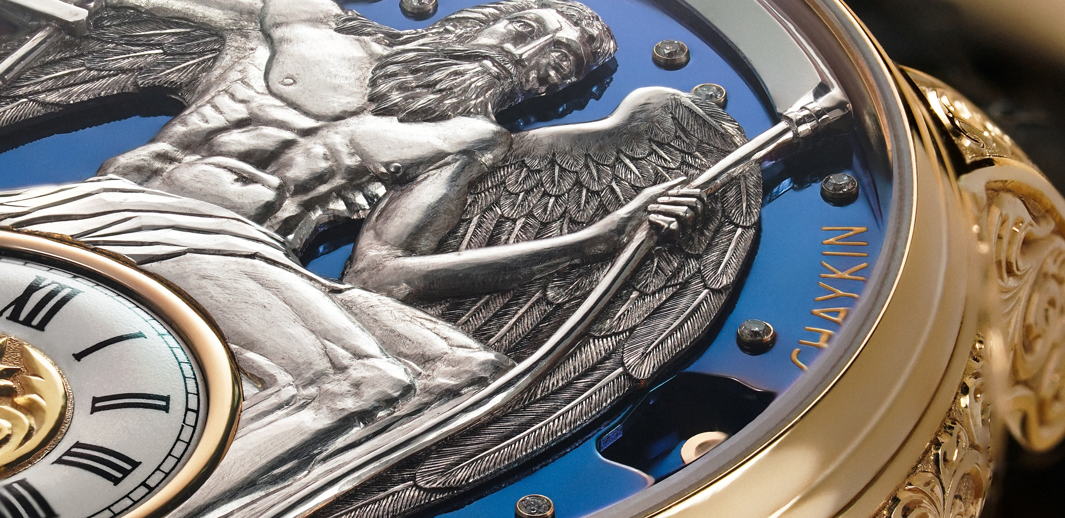 Konstantin Chaykin’s invention of a new genre of allegorical watches was realized in the Carpe Diem. The hourglass, one of the classic elements of an allegorical still life, is not just an artistic metaphor or an image on the dial, but a functioning mechanism designed to replace the minute hand. The animated display of the passing minutes is represented by the illusion of golden sand flowing through the hourglass from the upper to the lower spheres. Almost all of Konstantin Chaykin’s watches are decorative in one way or another, but the Carpe Diem undoubtedly stands out with its rich ornamentation. The exhibition sapphire caseback reveals the movement bridges decorated with hand-crafted relief engravings. The caliber K.01-4 of the Carpe Diem watch was developed by Konstantin Chaykin and is equipped with the mechanism of an animated hourglass invented by Konstantin Chaykin. The flow of sand from one bulb to another is represented by moving shutters. The movement is made entirely in Konstantin Chaykin Manufacture according to the standards of haute horlogerie, using traditional techniques for finishing the components: Côtes de Genève, perlage, fine straight and circular grinding, hand-polished chamfers, engravings, polished screw, pin and jewel recesses, ball polishing of the pivots and rhodium plating. A special feature of the movement are the bridges, hand-engraved in relief and finely hammered, and a ‘Pac-Man’ regulator, developed by Konstantin Chaykin for fine adjustment of the hairspring. Caliber: K.01-4, hand-wound, made by Konstantin Chaykin Manufacture Power reserve: 48 hours Functions: – Hours; – Animated hourglass as minute display; – Display of the day of the week as astrological planetary symbols There is something special about observing the watch being built. It is not just a mechanical process, but a true art in which the meticulous work of the master craftsman is combined with the precision of technical thinking. Assembling a watch is something that can fascinate, inspire and convey a sense of wonder. The animated indication of the minutes as they pass is shown by an illusion of golden sand, flowing through the hourglass from the upper to lower bulbs. The floral patterns on 18k rose gold case are hand-engraved using a deep relief engraving technique with a finely hammered background. Case dimensions: Diameter 45 mm.