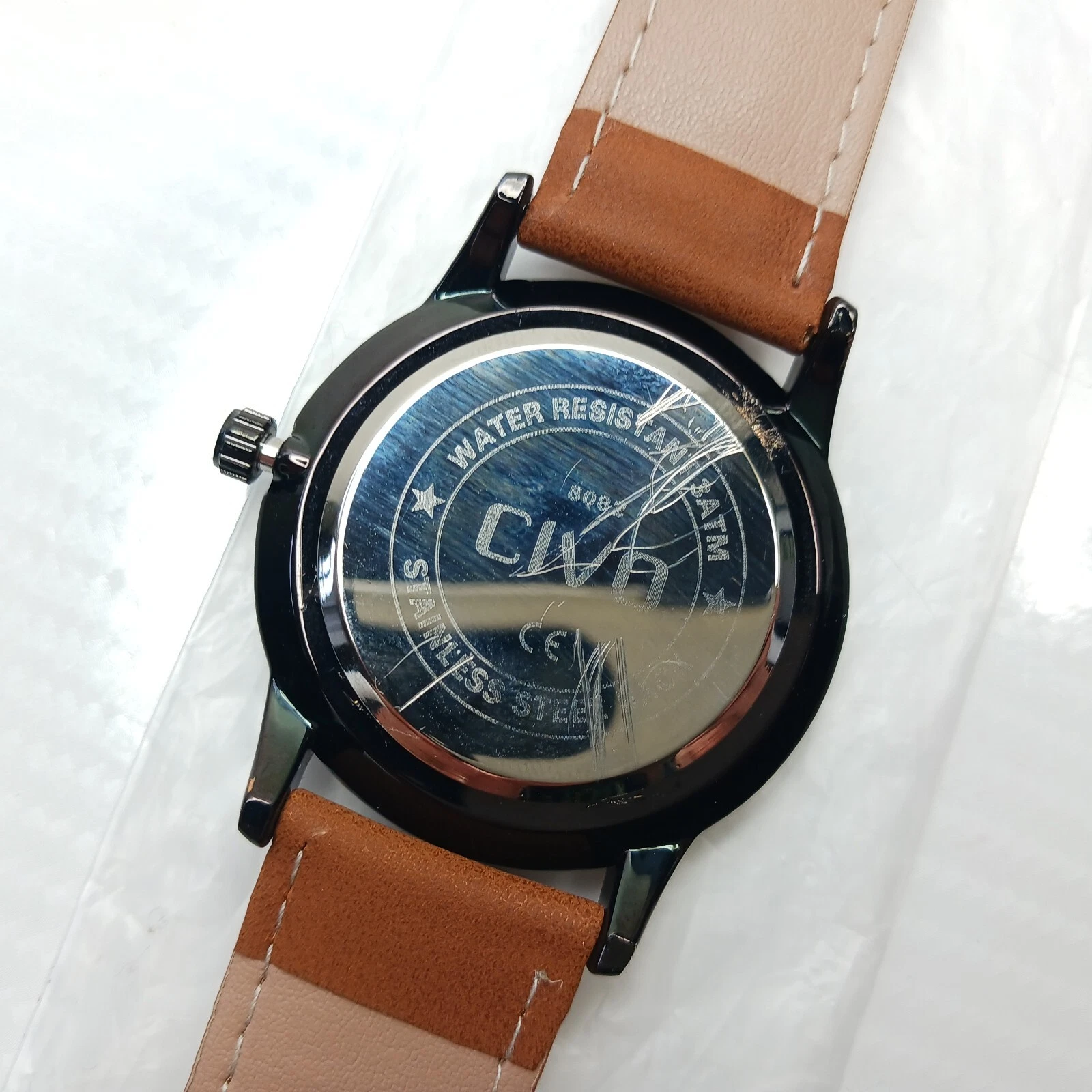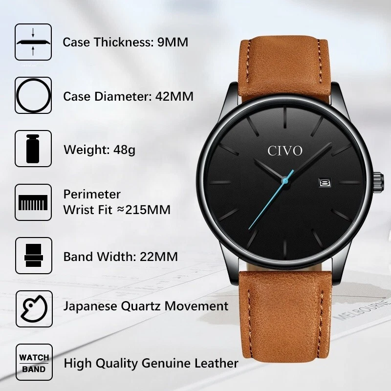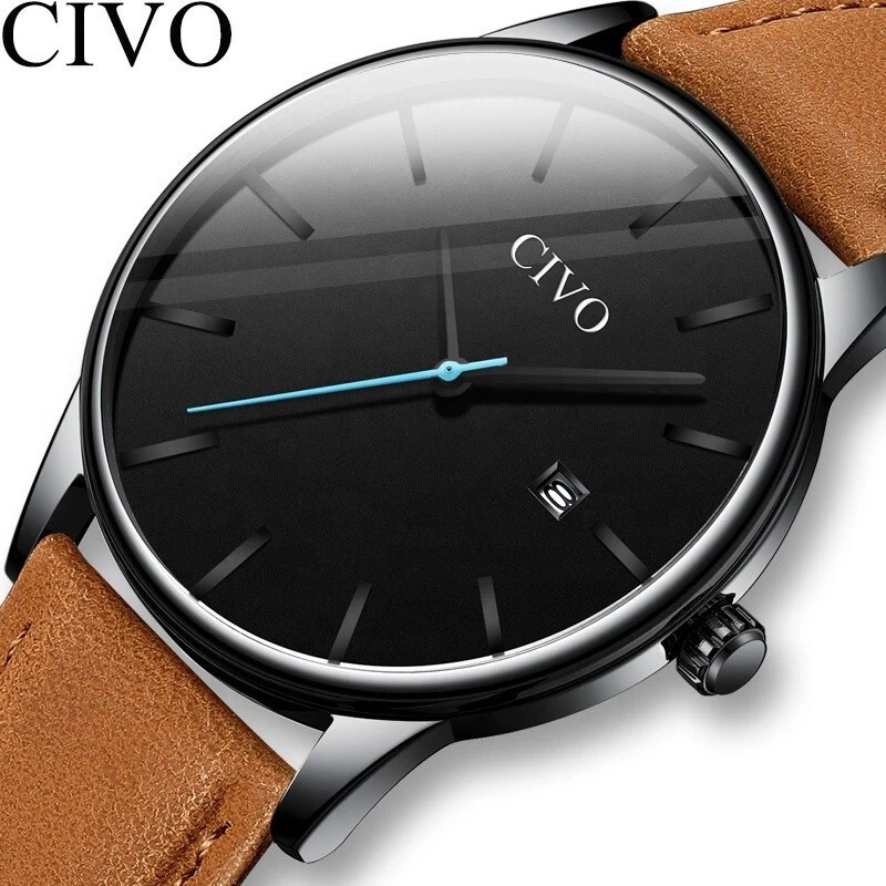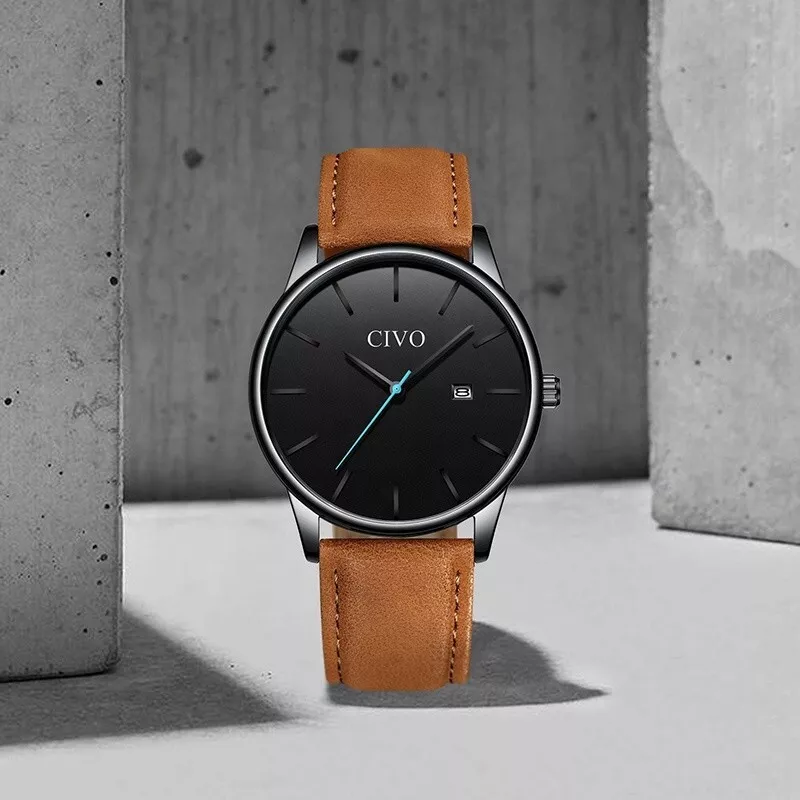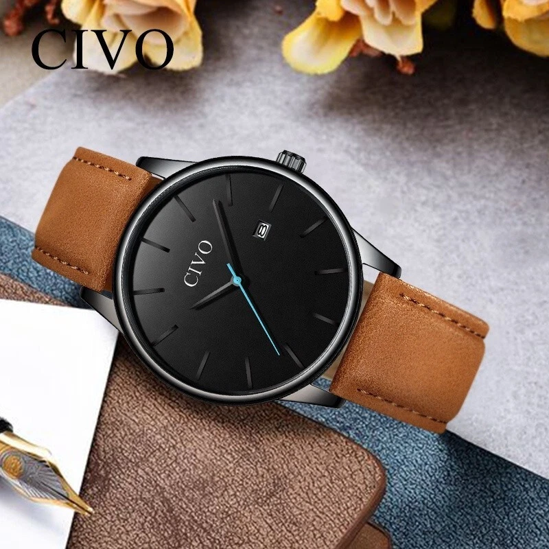 CIVO Mens Minimalist Real Saddle Brown Leather Band Quartz Movement Wrist Watch