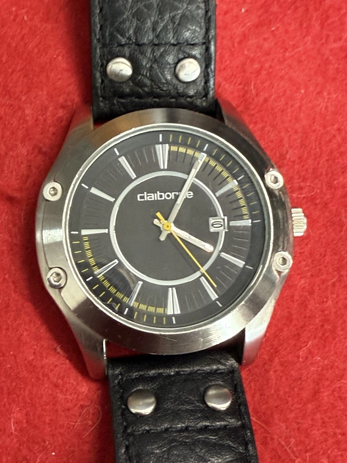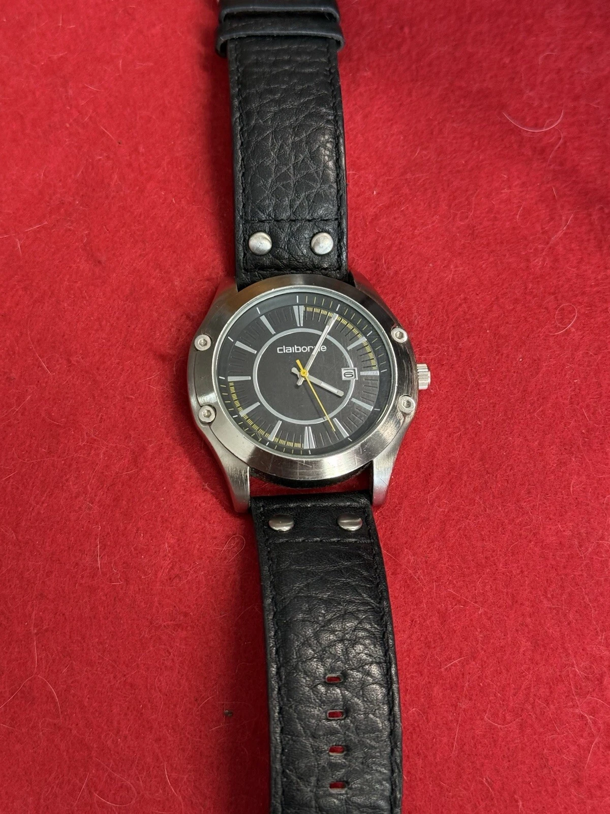 Claiborne Men Silver Black Leather Analog Quartz Date NEW ENERGIZER BATTERY 🔋