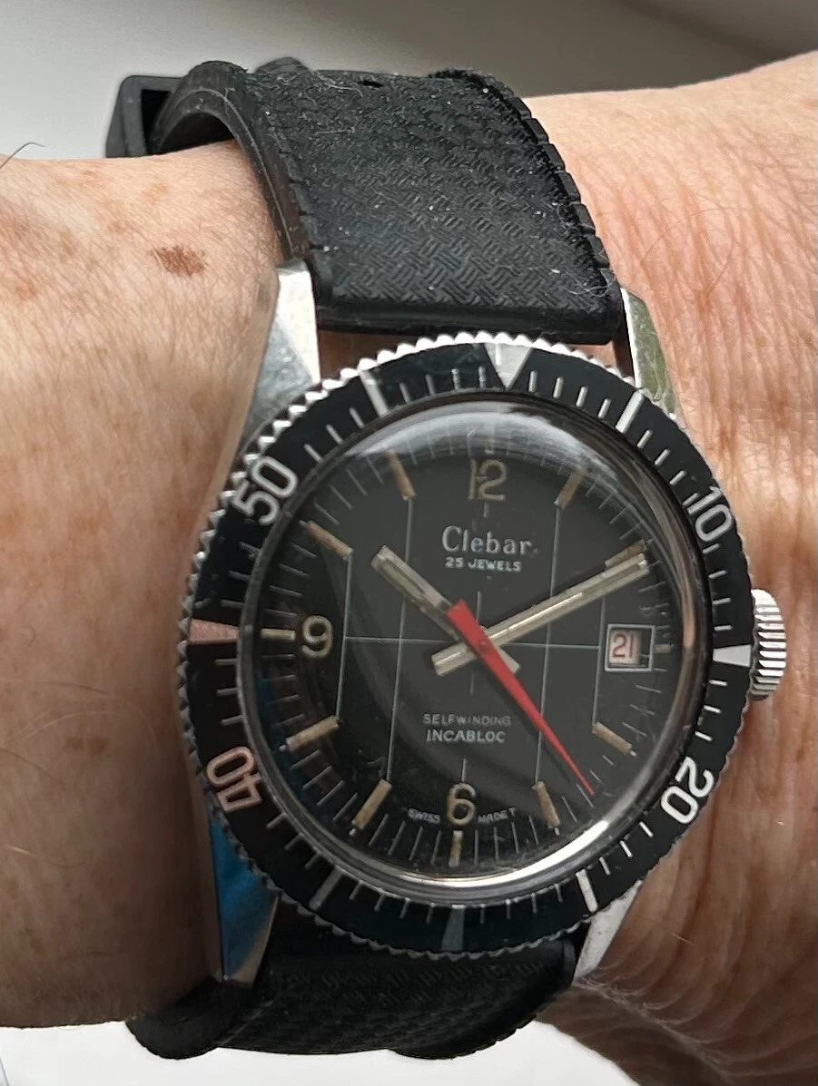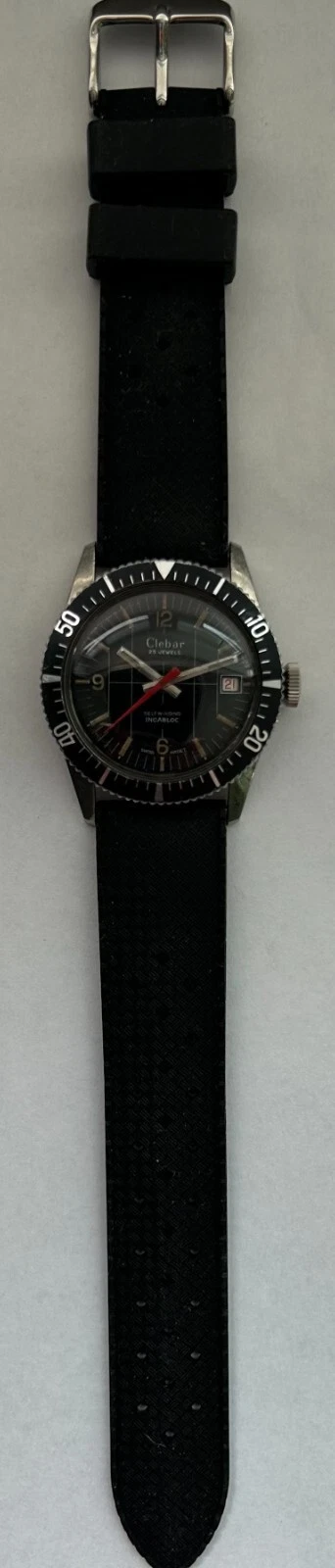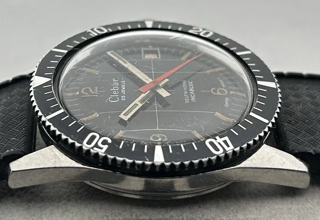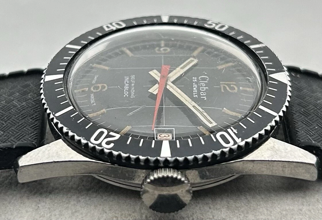 VINTAGE STAINLESS STEEL CLEBAR DIVER w/SWISS 25 JEWEL AUTOMATIC MVMT & DATE 34.5